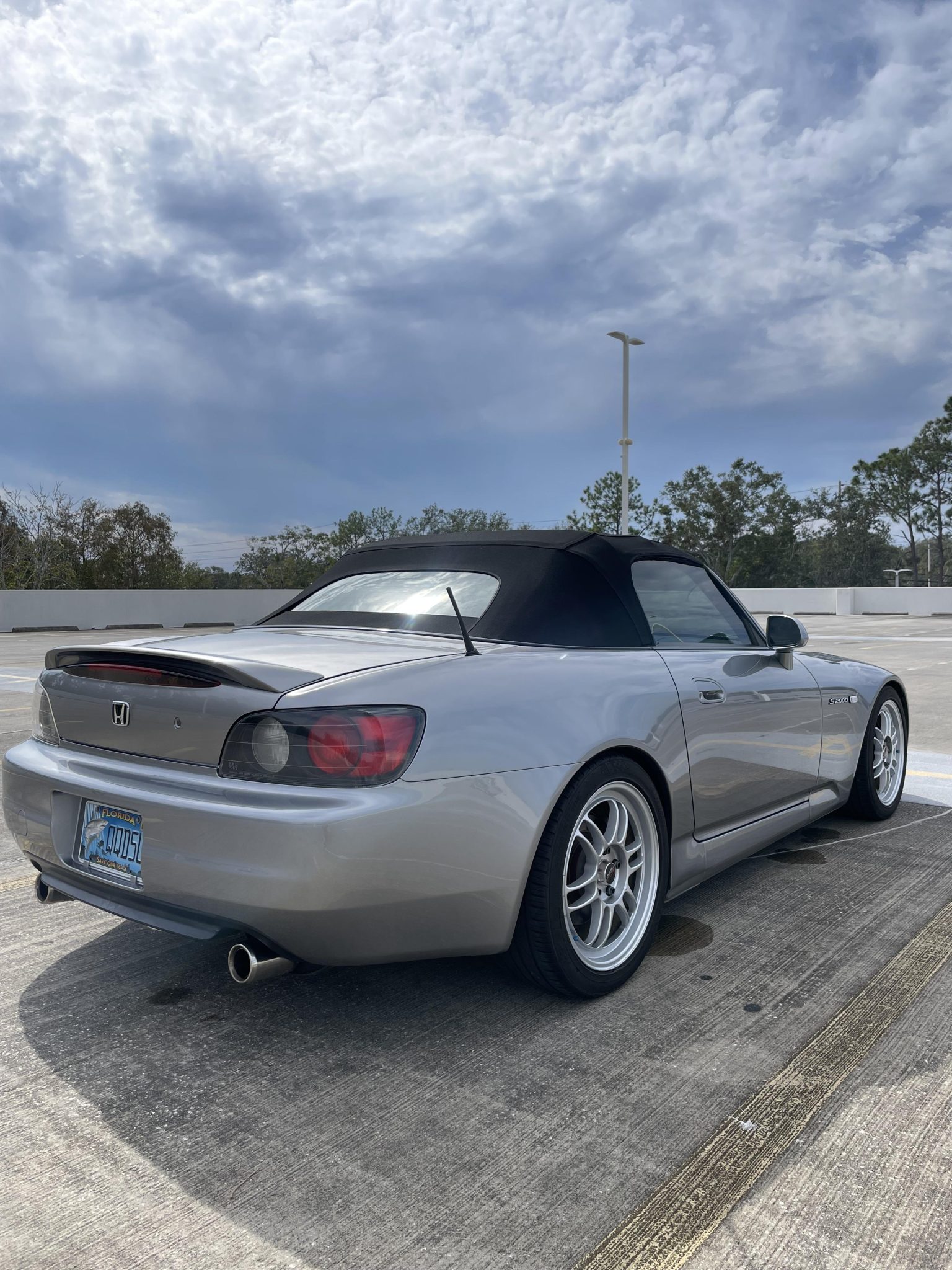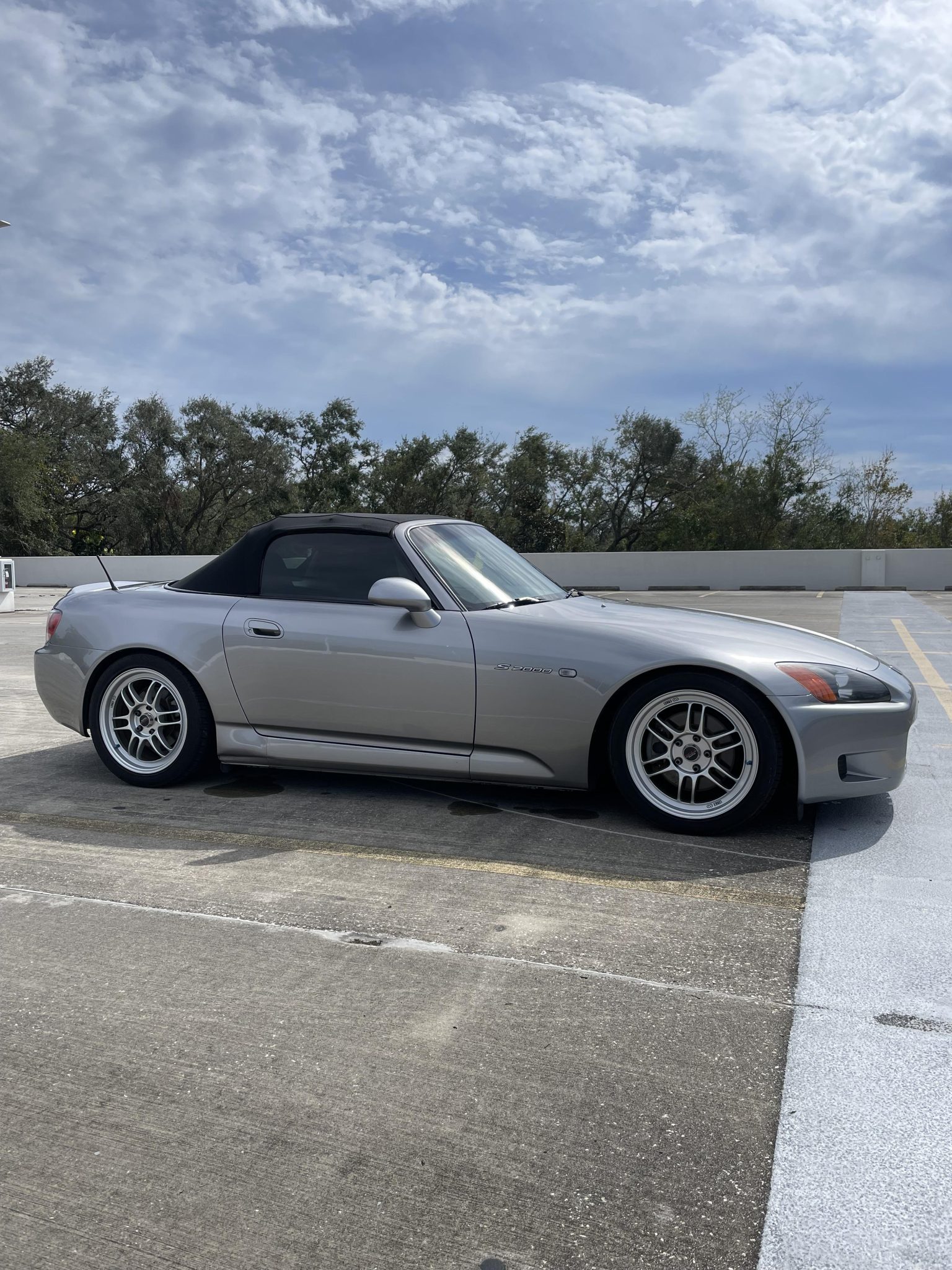 Aftermarket 17″ Enkei RPF1 wheels are mounted with 215/45 front and 245/40 rear Kumho Ecsta tires. The suspension has been modified with Bilstein B14 coilovers, and StopTech stainless-steel brake lines and front brake pads have been installed. The seller notes an intermittent squeak from the front brakes.