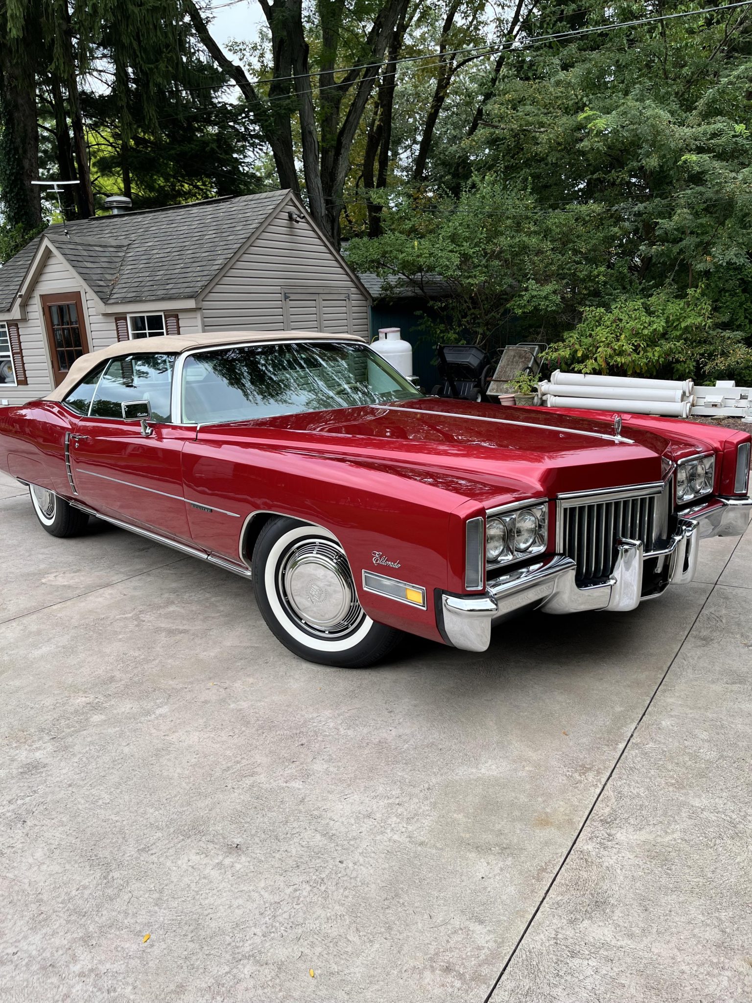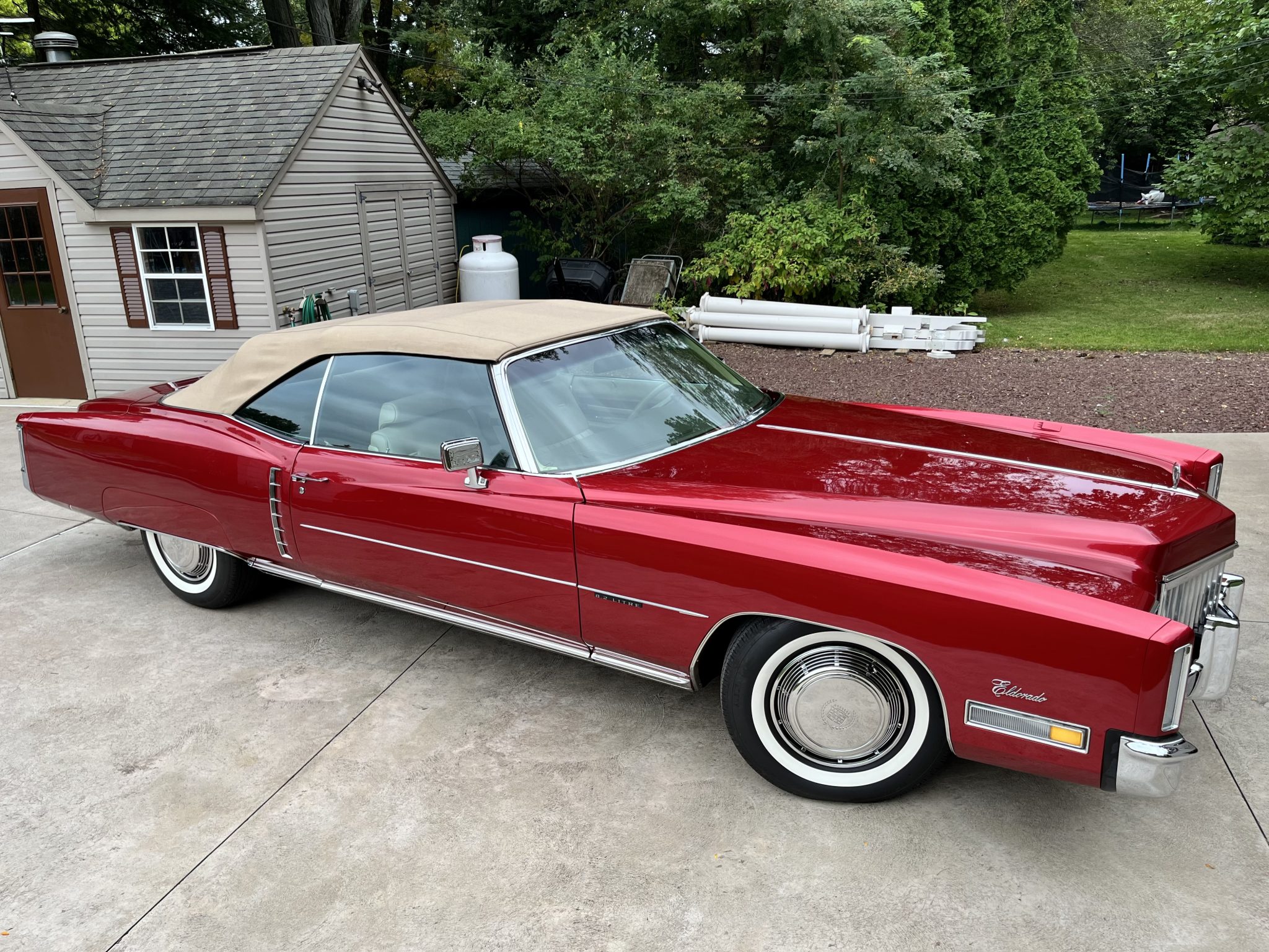 The 15″ steel wheels feature polished covers and are mounted with 235/60 Diamond Back Auburn Premium whitewall tires. The Eldorado featured a torsion bar front suspension and a coil-sprung solid rear axle along with Automatic Level Control and power steering. Braking is handled by front discs and rear drums.