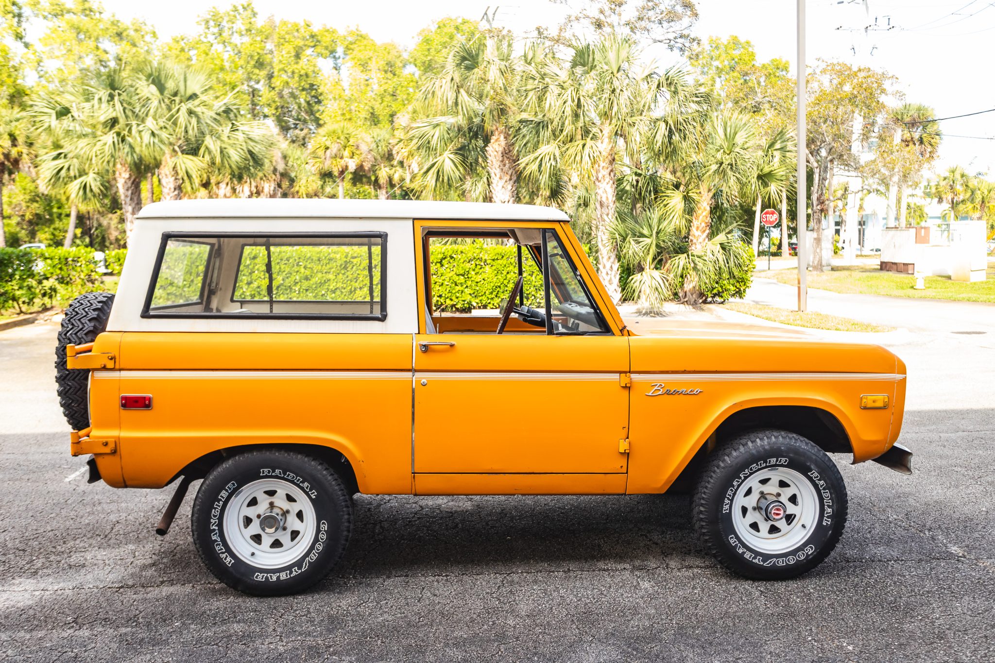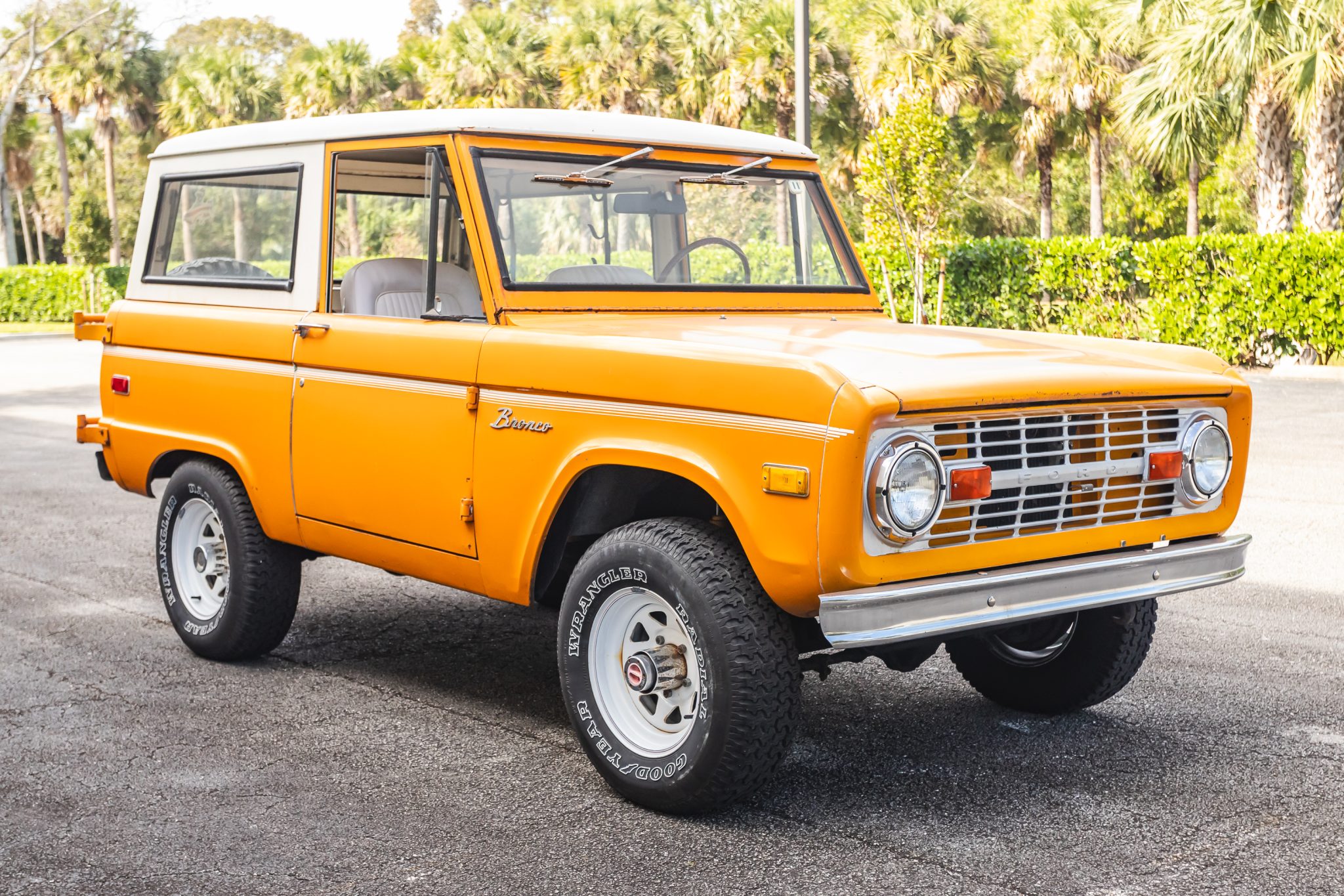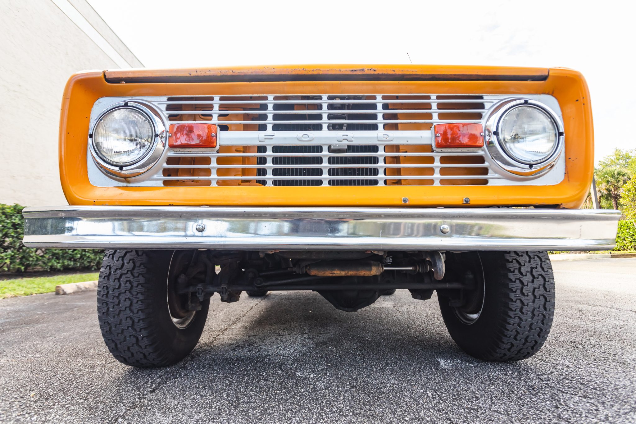 White 15″ steel wheels are mounted with Goodyear Wrangler tires. The truck is equipped with manually locking hubs, and stopping power is provided by drums at each corner.