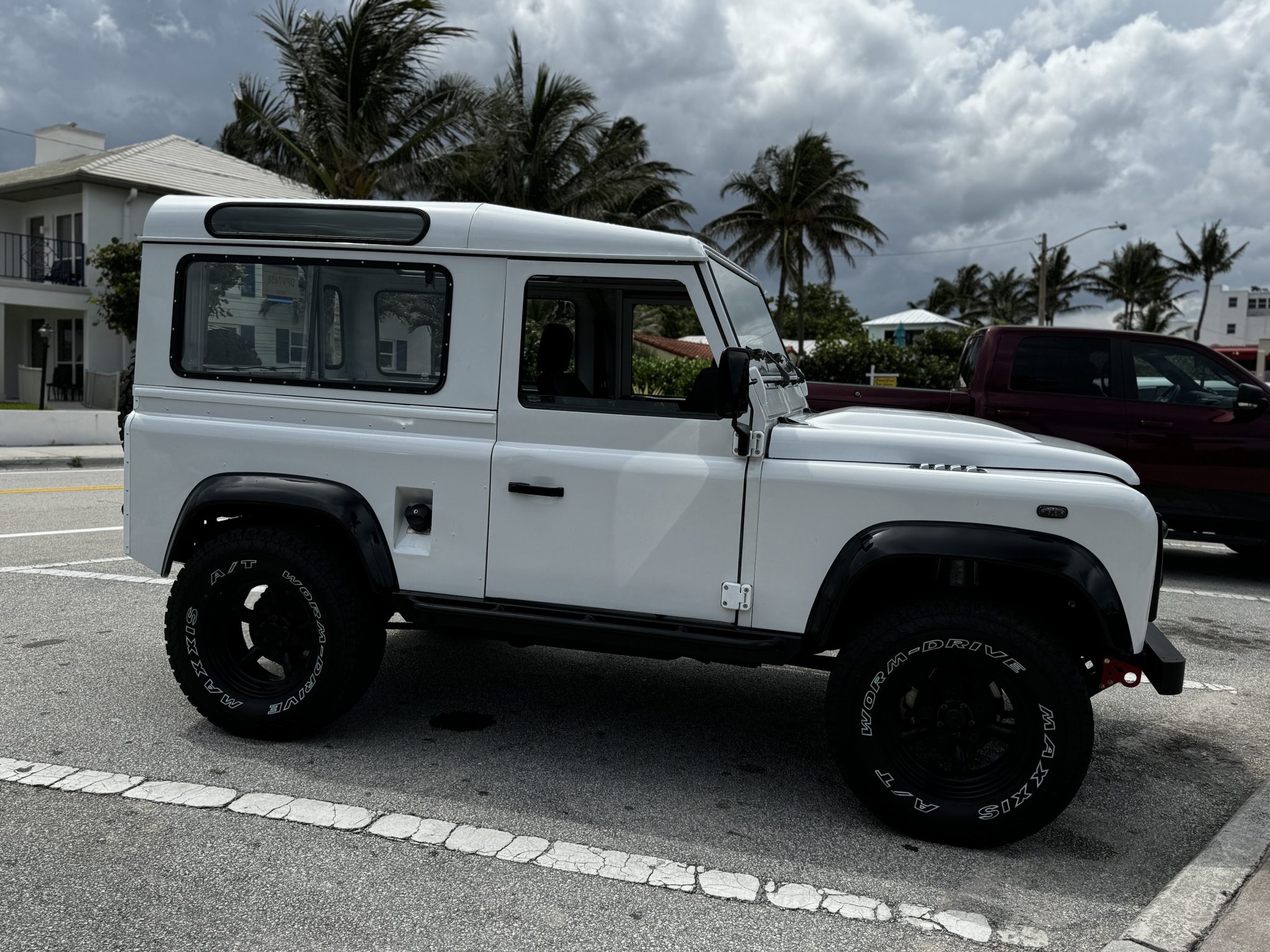 Black-finished 16″ wheels are mounted with 265/70 Maxxis Wormdrive A/T tires, and a spare is secured to a swing-out carrier at the rear of the truck. The seller notes that axles sourced from a Range Rover Classic were installed during the refurbishment, which also involved rebuilding the wheel hubs and rear axle hubs, installing rear disc brakes, and replacing the steering damper, brake lines, brake calipers, front axle swivel hubs, and rear stub axles. Heavy-duty shocks are said to be fitted along with Gorilla Offroad sway bar links.