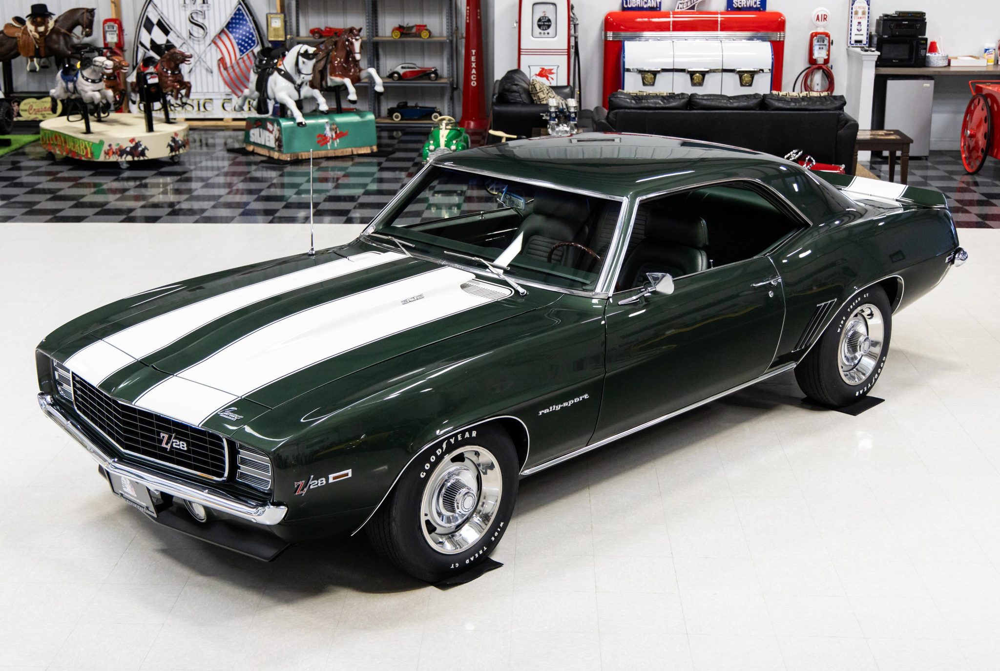 Silver-finished 15″ Rally wheels wearing bright trim rings and center caps were mounted with Goodyear Wide Tread GT white-letter tires in preparation for the sale, and a full-size spare wrapped in a BFGoodrich tire is stowed in the trunk. The steering is power-assisted, as are the front disc and rear drum brakes.