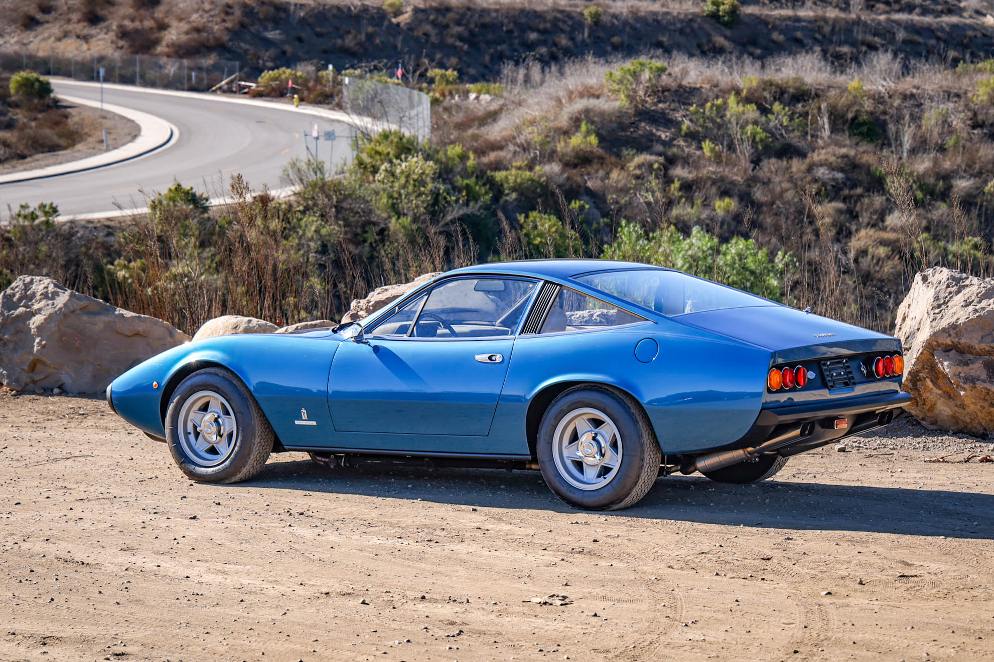 The 15″ five-spoke Cromodora wheels feature three-eared knockoffs and are mounted with 215/70 Michelin XWX tires. A matching spare wheel is mounted beneath the trunk floor. The 365 GTC/4 featured a four-wheel independent suspension, and power-assisted steering and four-wheel disc brakes were also standard equipment. The brake calipers were rebuilt by Patrick Ottis in 2022, with the system bled and the pads replaced at that time. Ridetech shocks and Hyperco springs were installed in 2023.