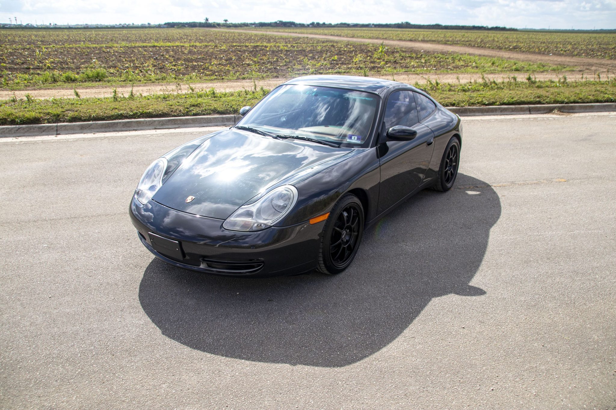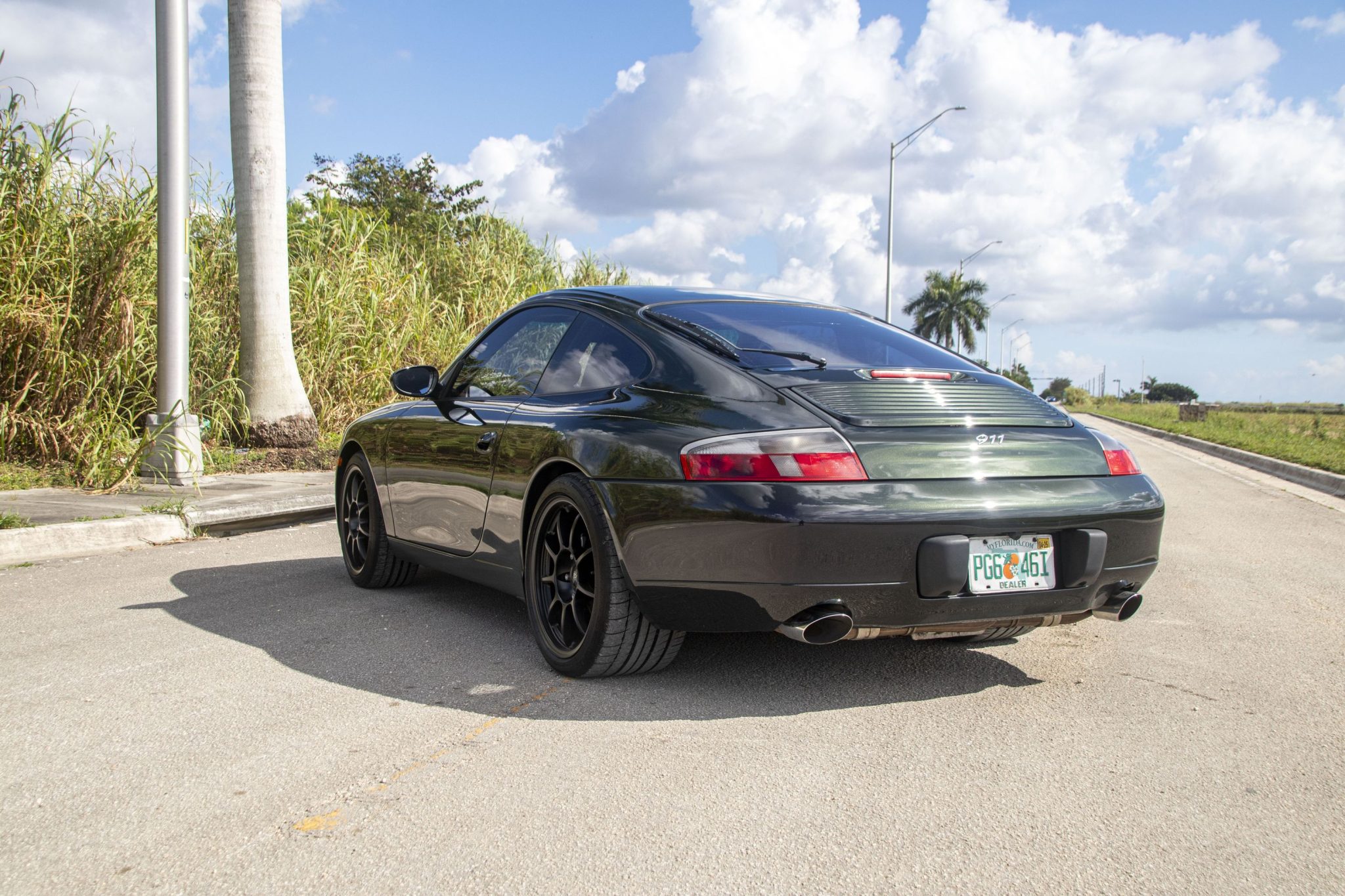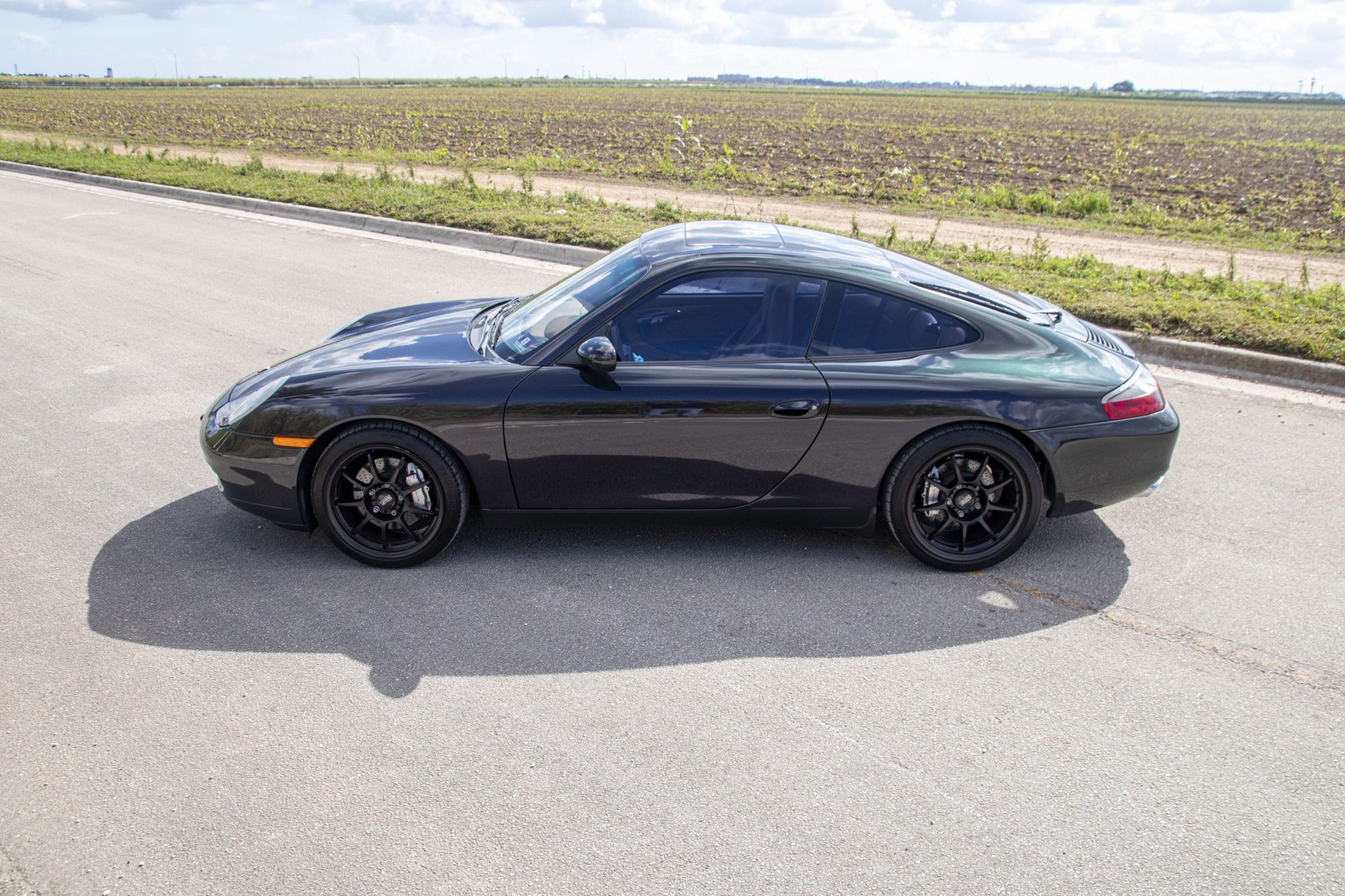 Black-finished 18″ OZ Racing Alleggerita HLT wheels are mounted with 225/40 front and 295/30 Michelin Pilot Sport tires. Braking is handled by four-piston Porsche-branded calipers fitted over cross-drilled rotors, and the car is equipped with Porsche Stability Management. The brake fluid was flushed in July 2023, a wheel scrape is highlighted in the gallery, and the selling dealer reports that a missing wheel-mounting bolt was replaced after the photos were taken.