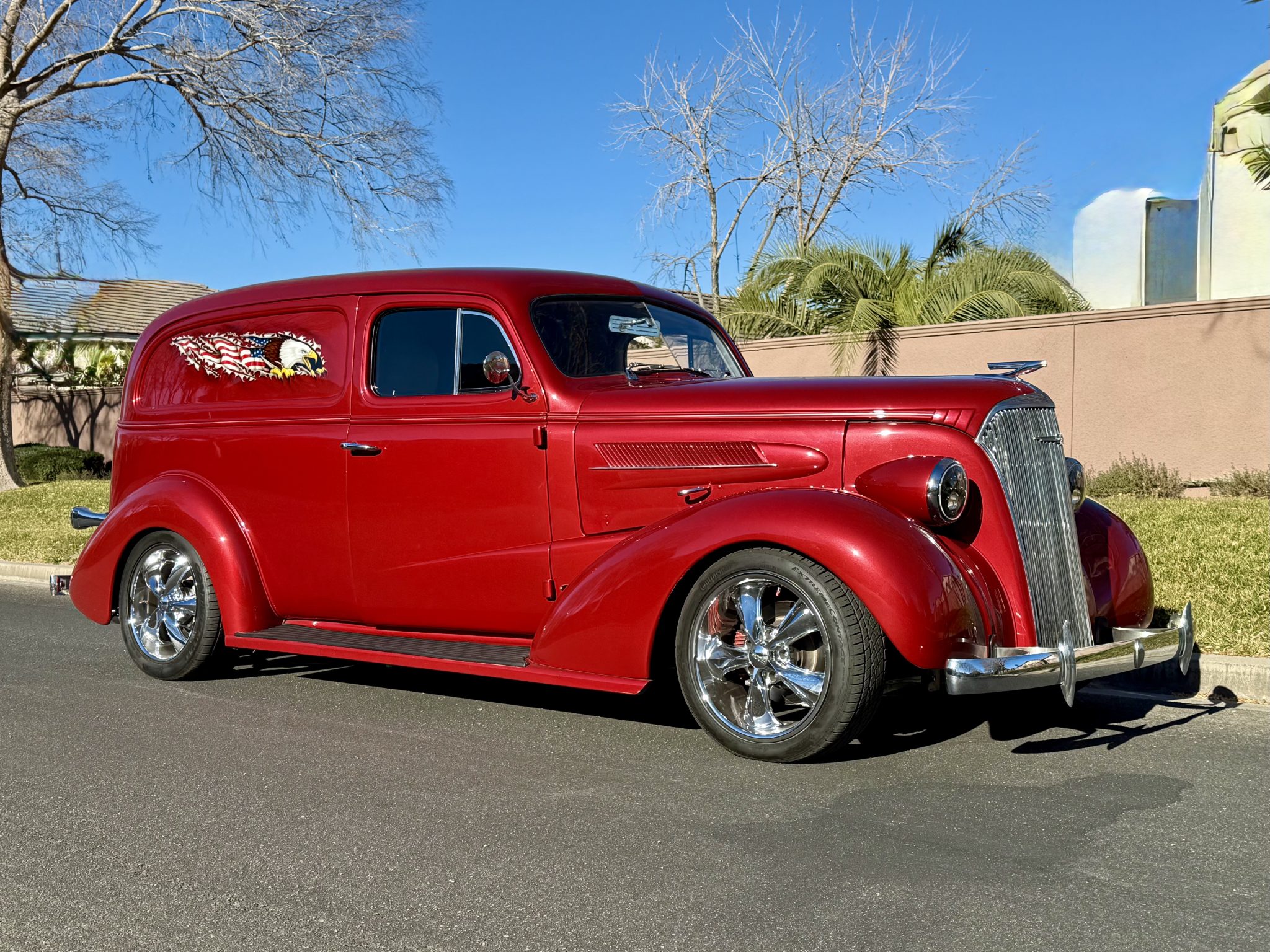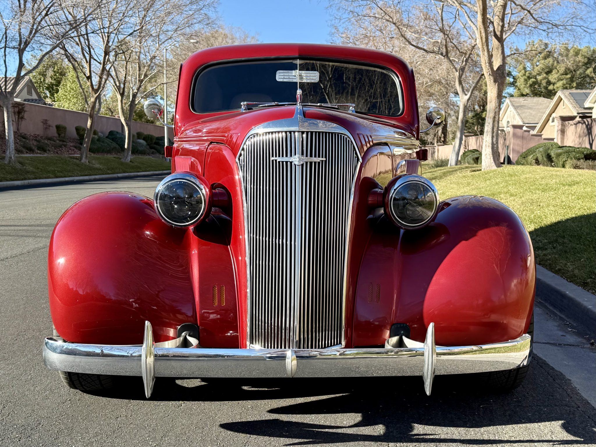 Foose 17” wheels are mounted with 205/45 front and 225/45 rear Continental ExtremeContact DWS 06 Plus tires. The car rides on a boxed steel frame with front and rear suspension assemblies sourced from a 1987 Corvette. QA1 adjustable coilovers have been added, and braking is handled by power-assisted four-wheel discs with a dual-circuit master cylinder.