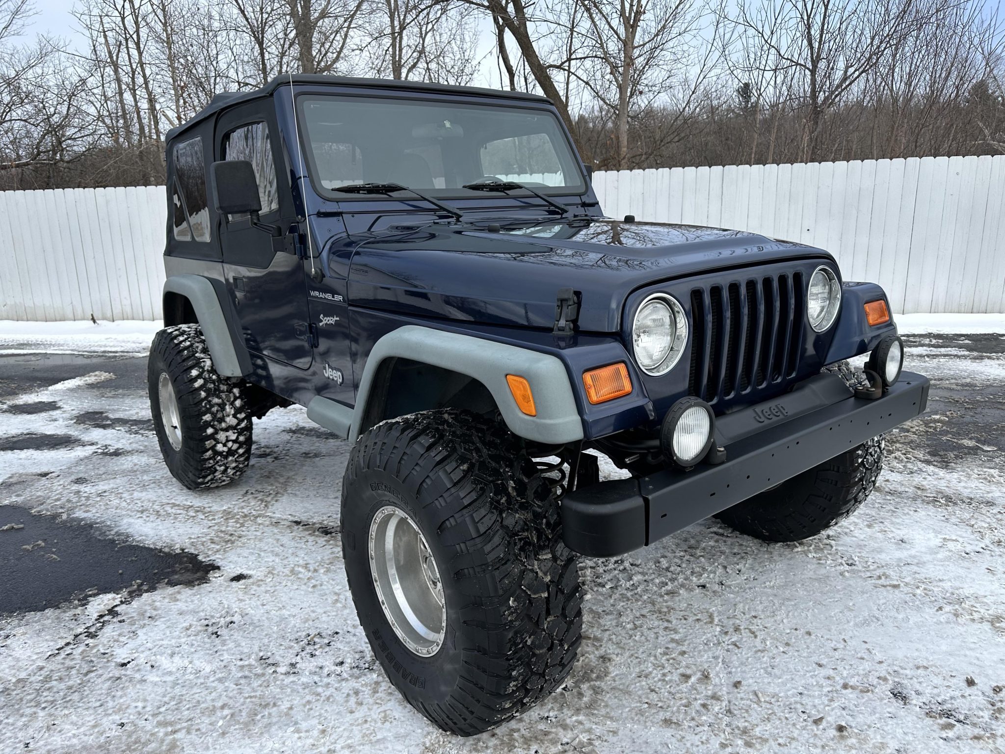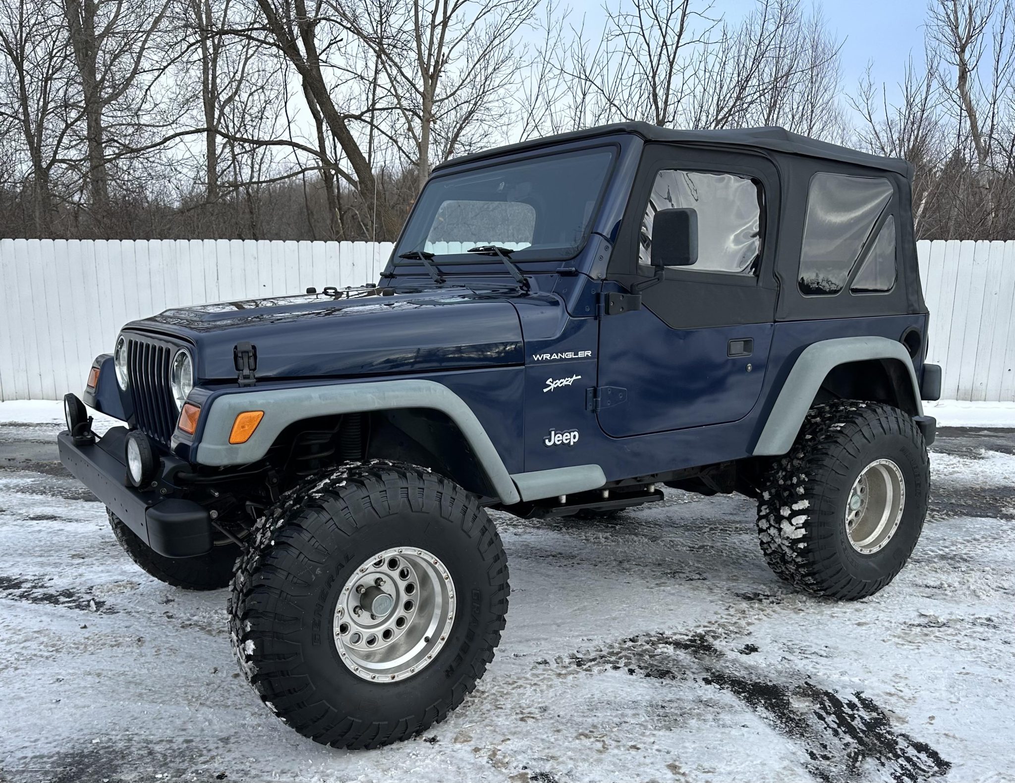 Eagle 15″ alloy wheels are mounted with 35×12.50″ General Grabber tires, and the truck is not equipped with a spare. The suspension is modified with a lift kit, and stopping power is provided by front discs and rear drums. The wheels and tires extend beyond the plane of the factory fender flares.
