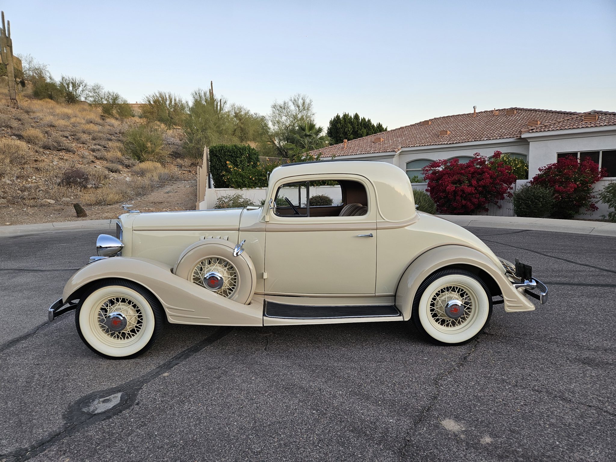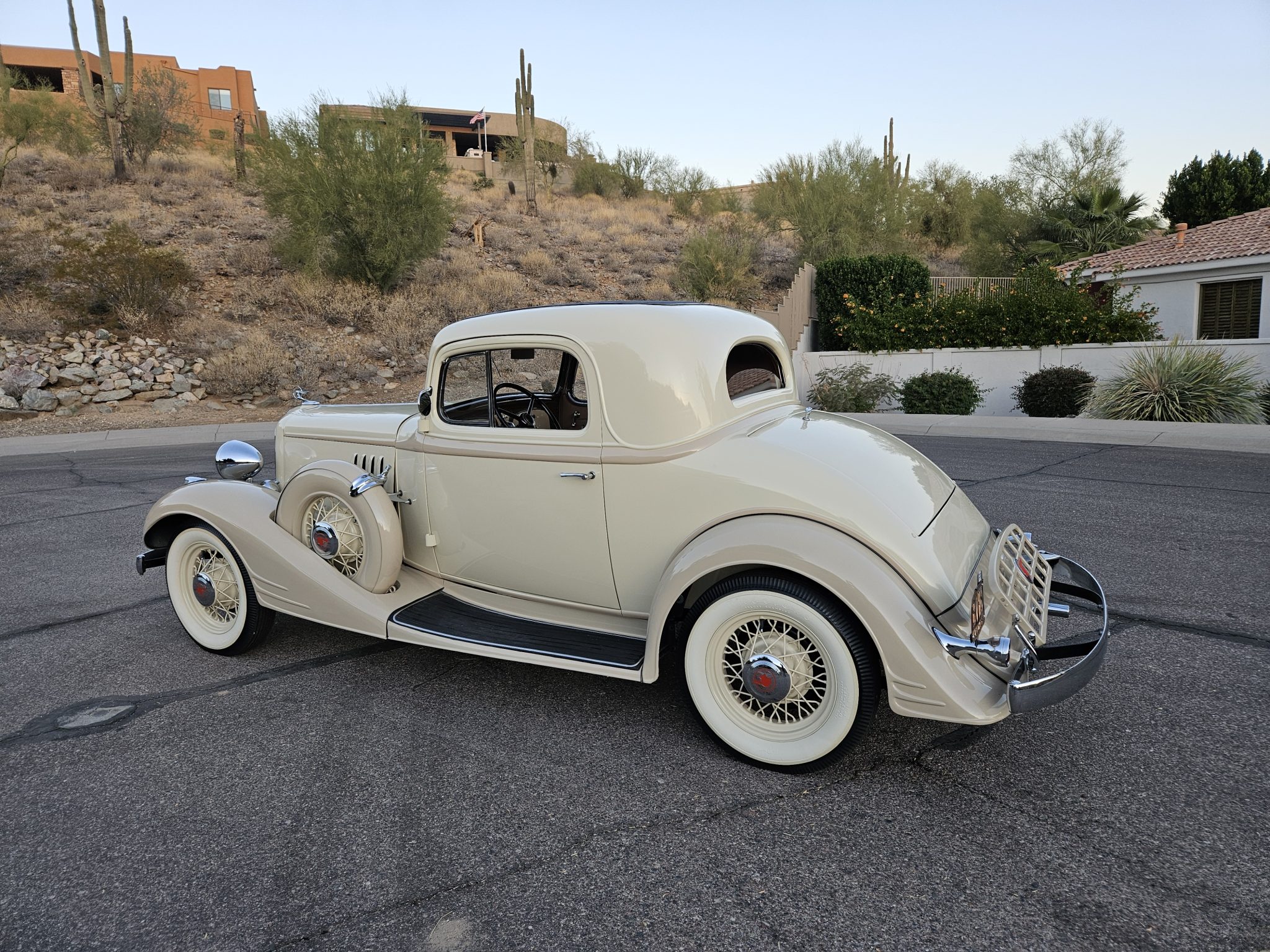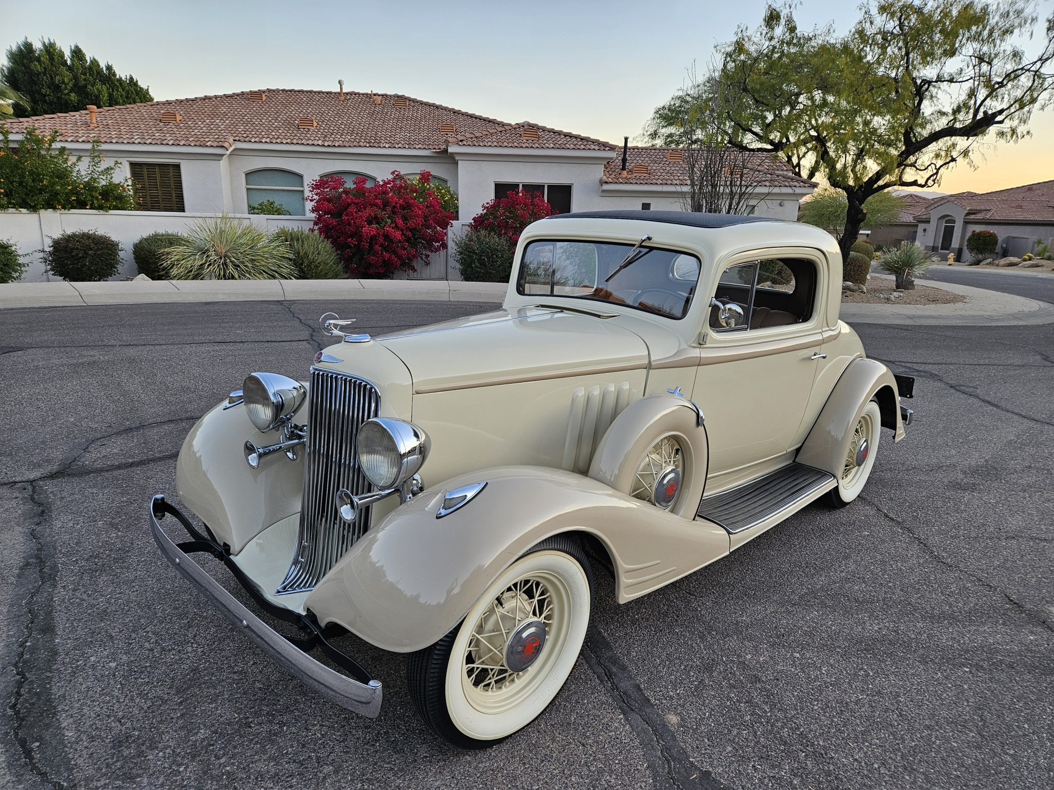 Body-color wire-spoke wheels feature chrome Pontiac-branded hubcaps, and they are mounted with 5.25–5.50–17″ Firestone whitewall bias-ply tires. Matching spare wheels are stowed in body-color hard covers in the fenders. The Economy Eight rode on a 115″ wheelbase and featured front and rear leaf springs. Braking is handled by drums at all four corners.