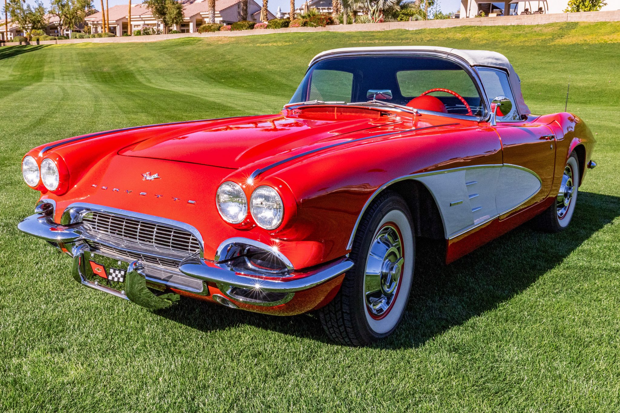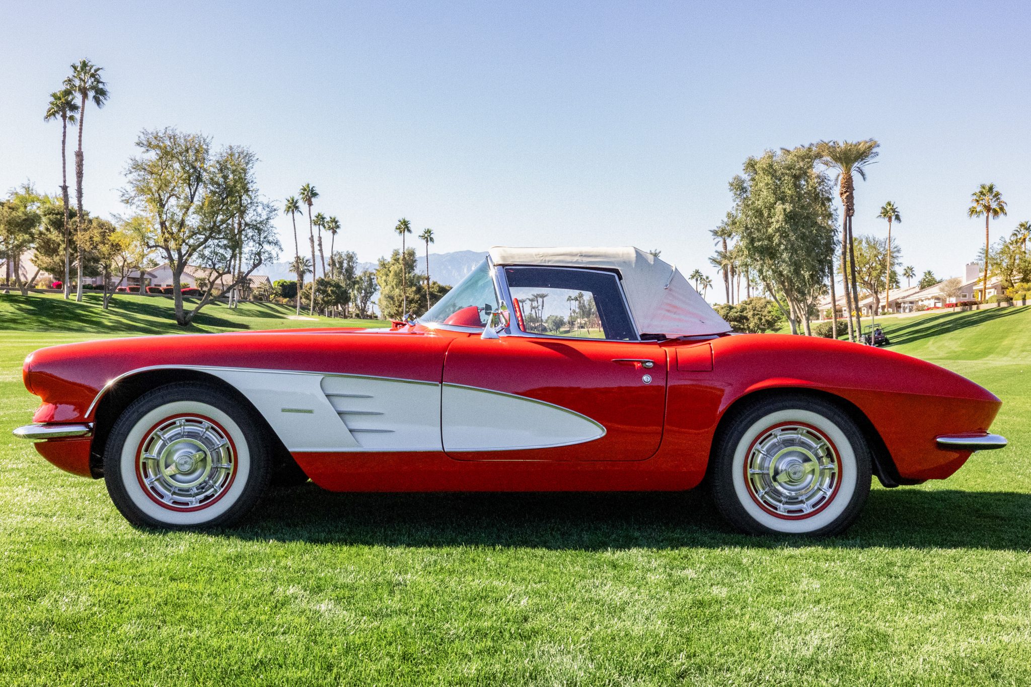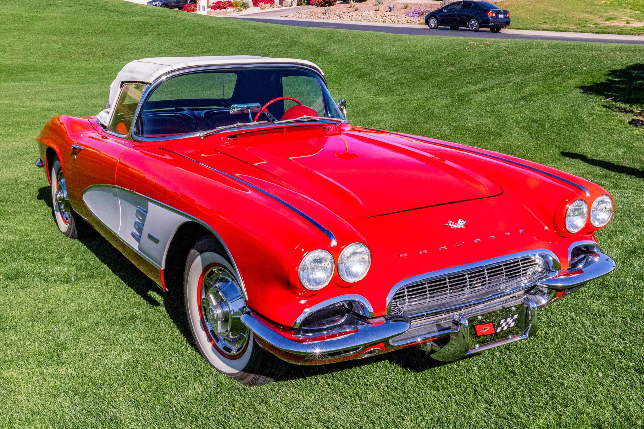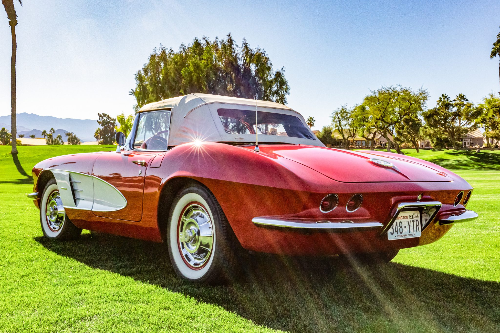 Red-painted 15” steel wheels feature polished covers with faux knock-off spinners and are mounted with 205/75 Coker Classic wide-whitewall tires, and a full-size unmounted spare tire is located in the trunk. Braking is provided by a drum at each corner. The steering box was overhauled in 2002.