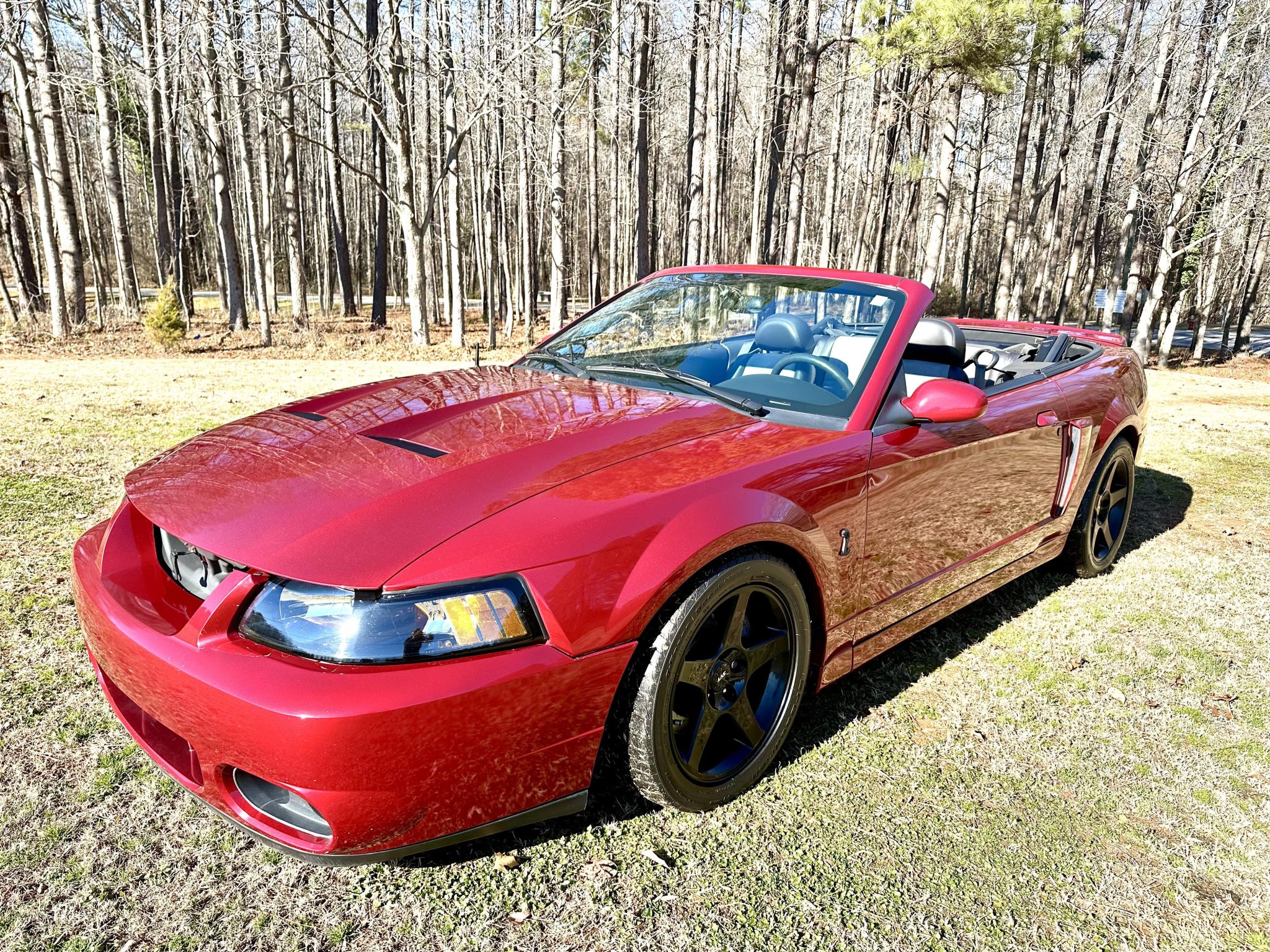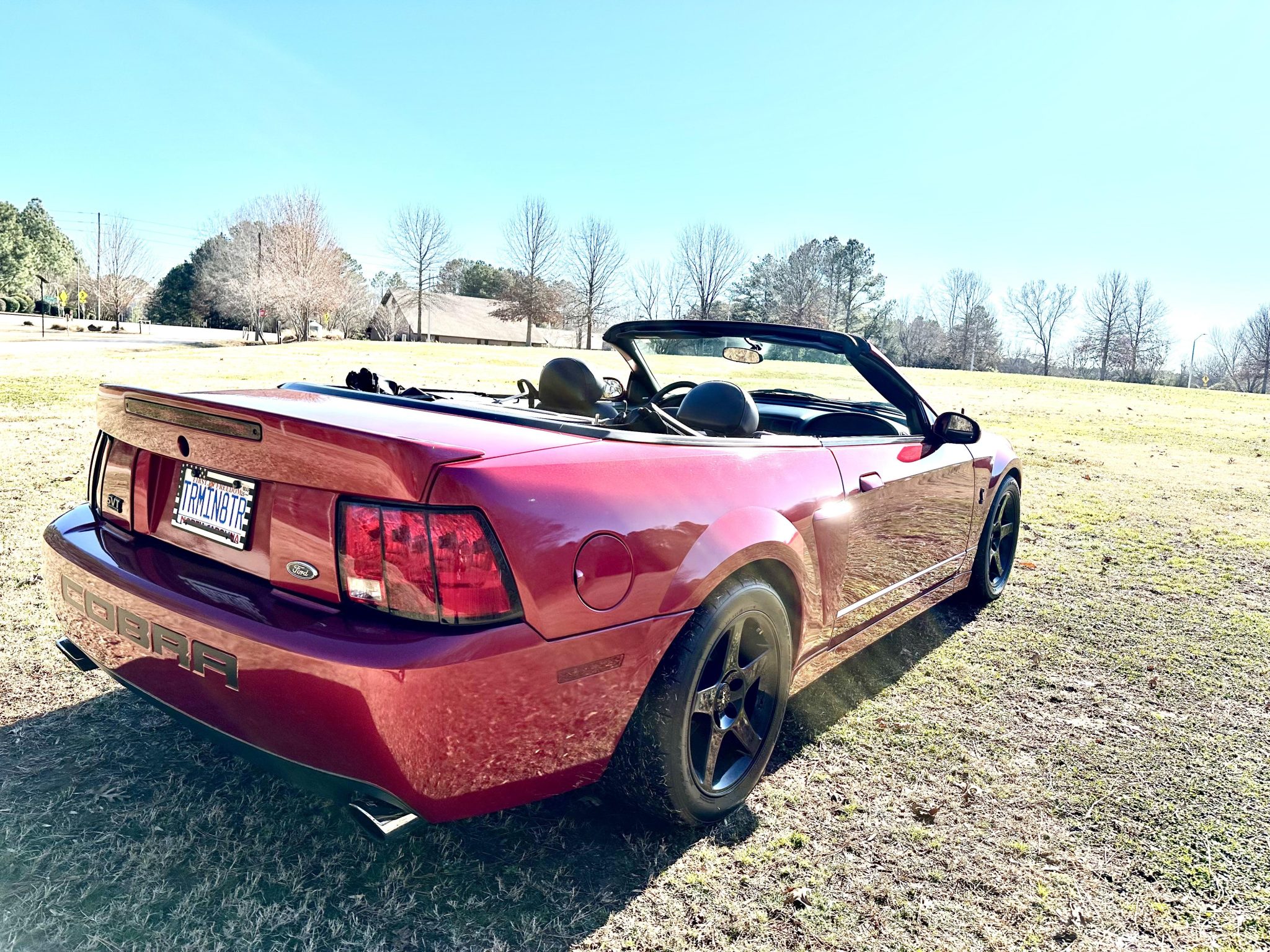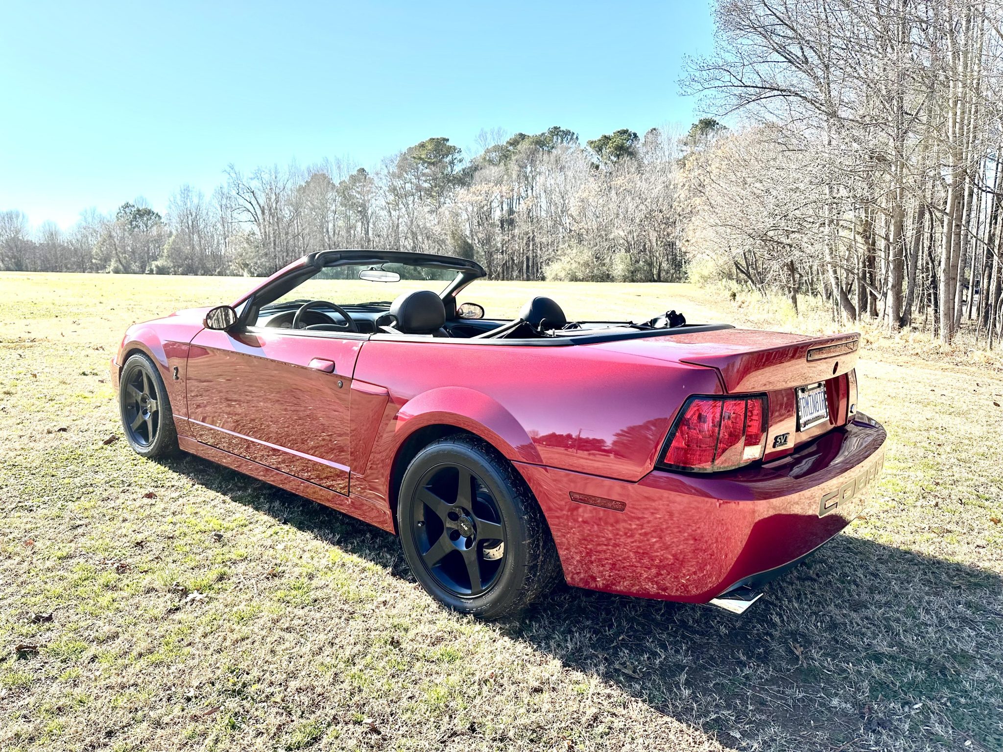 Black-finished 17″ five-spoke wheels are mounted with BFGoodrich tires in front and Nitto tires out back. The car features an independent rear suspension and has been modified with Maximum Motorsports coilovers that were installed under previous ownership. Stopping power is provided by four-wheel disc brakes with Cobra-branded calipers up front.