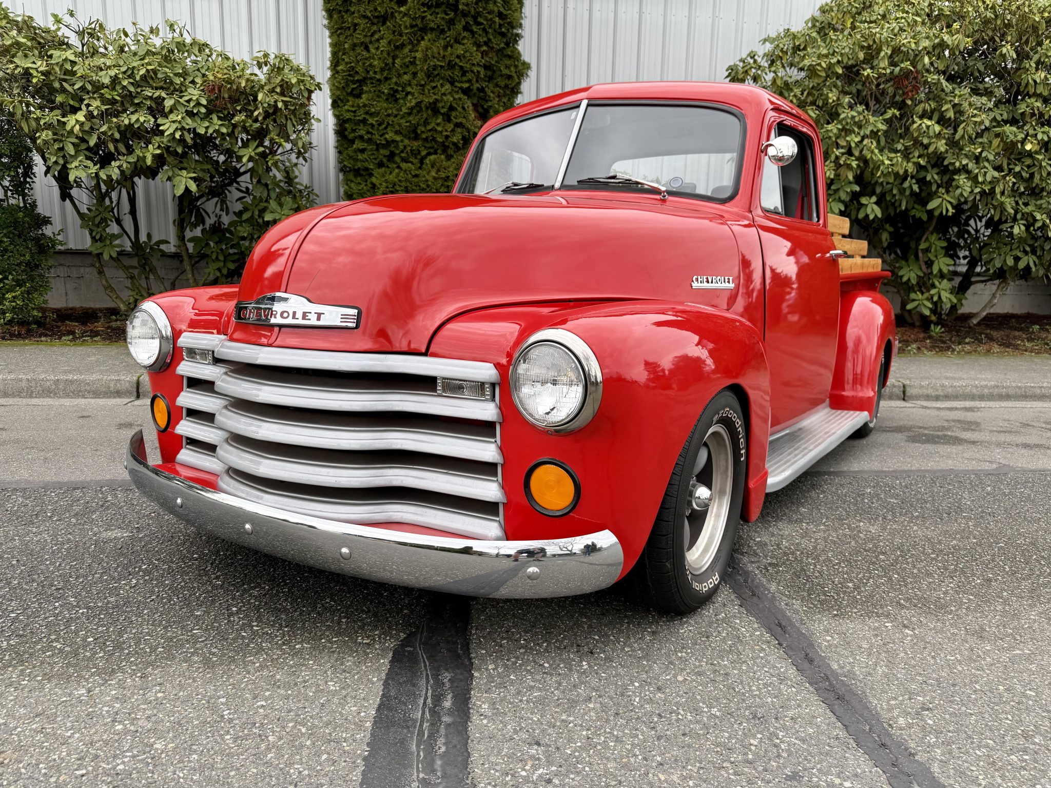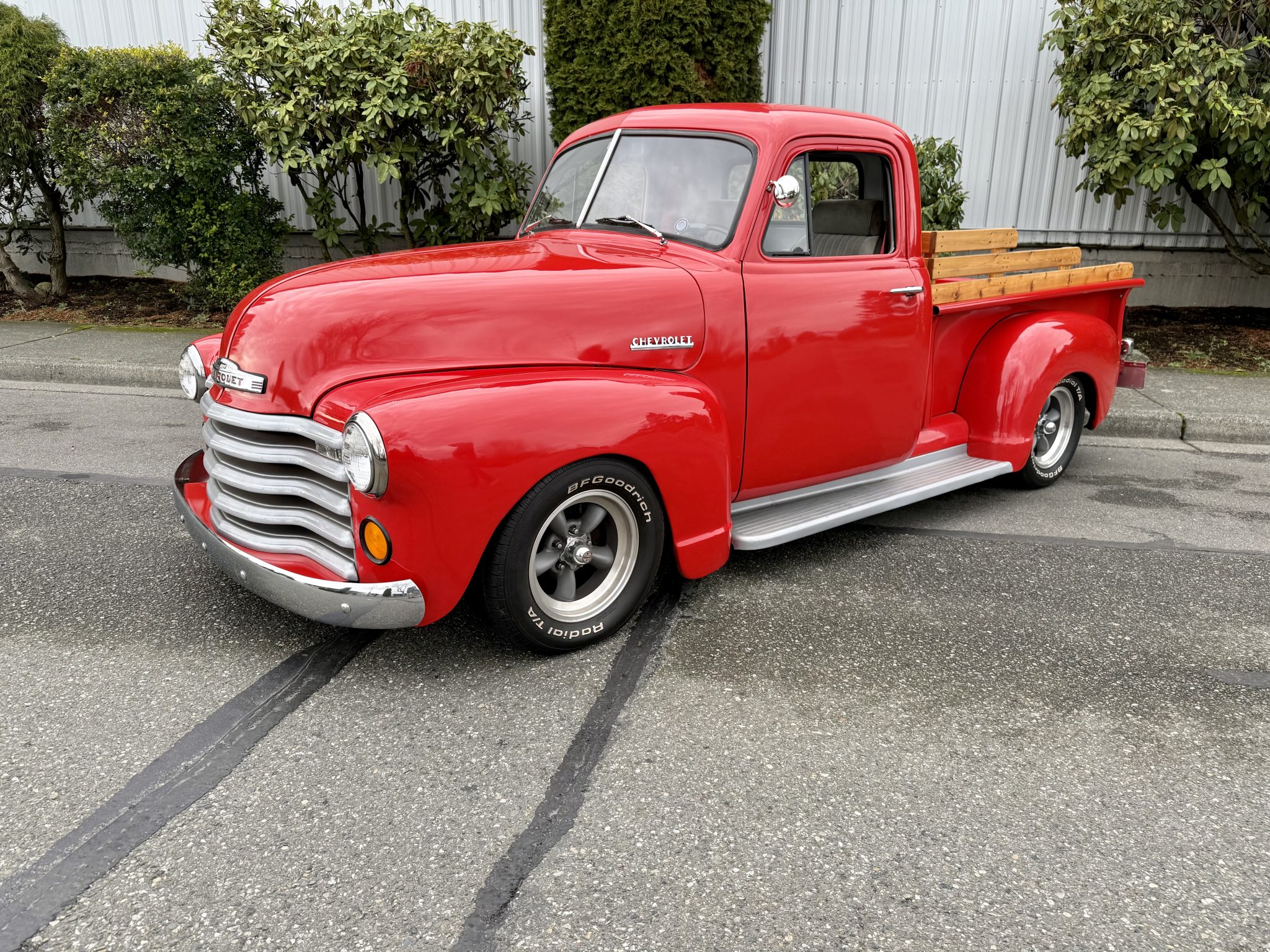The 15″ American Racing Torq Thrust wheels are mounted with 235/60 BFGoodrich Radial T/A white letter tires. The truck has been sub-framed with an A-arm-style front suspension as well as power-steering, and power-assisted front disc brakes.