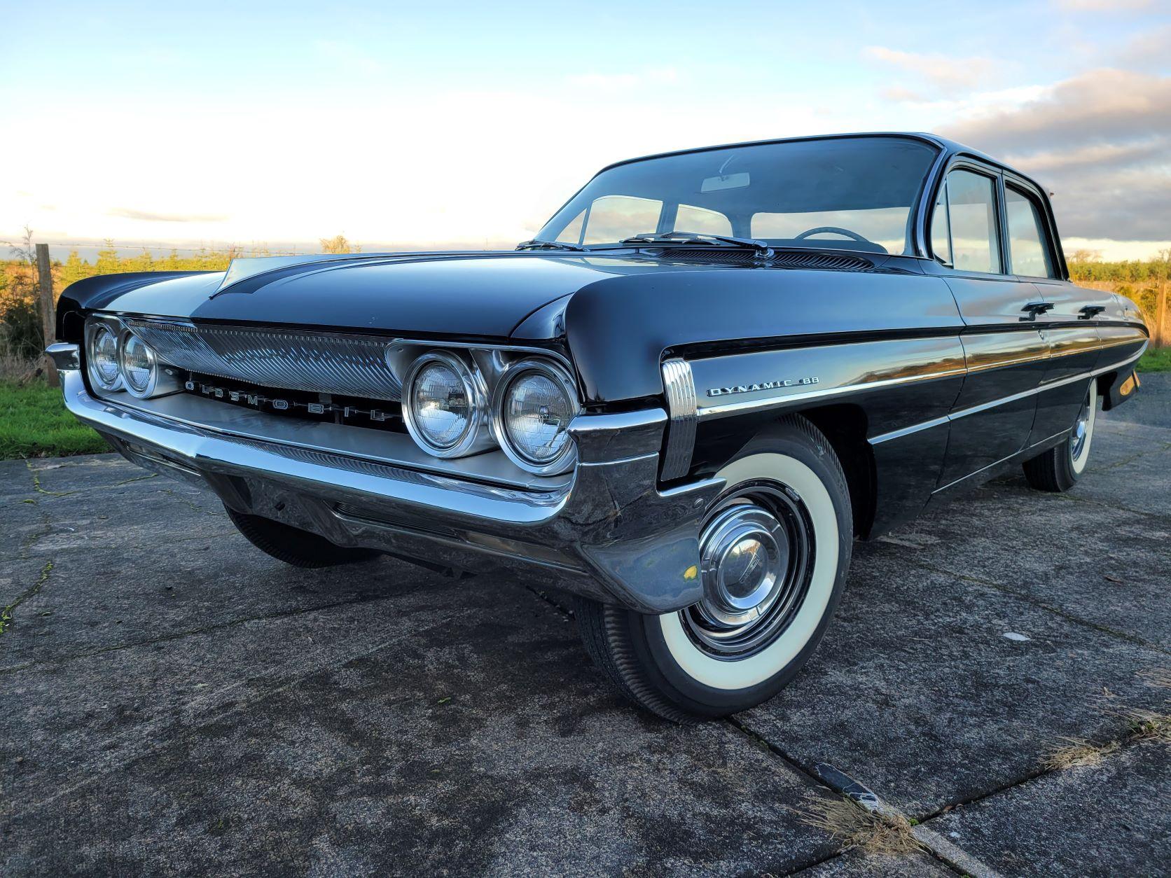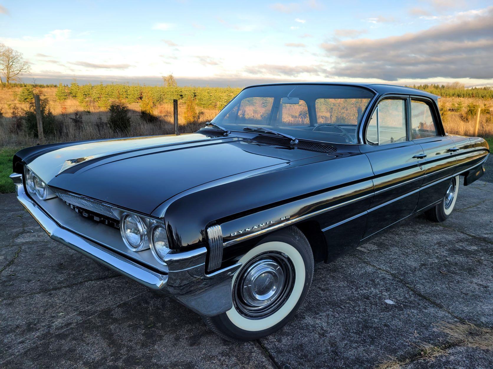 Painted 14″ steel wheels wear stainless steel hubcaps with color-keyed trim rings and are mounted with whitewall tires. Fifth-generation 88s were equipped with coil-spring suspension front and rear, and braking is handled by four-wheel drums.