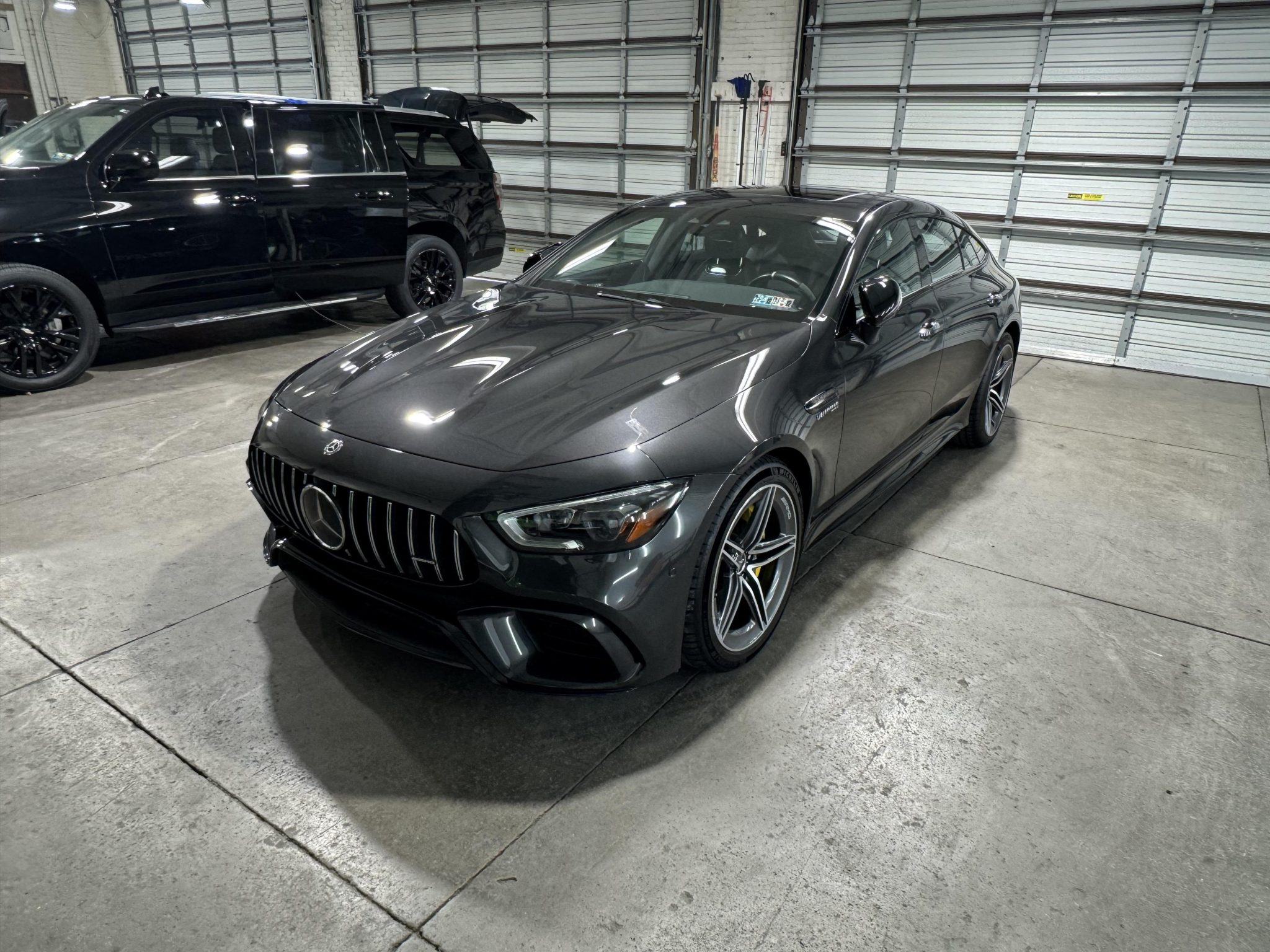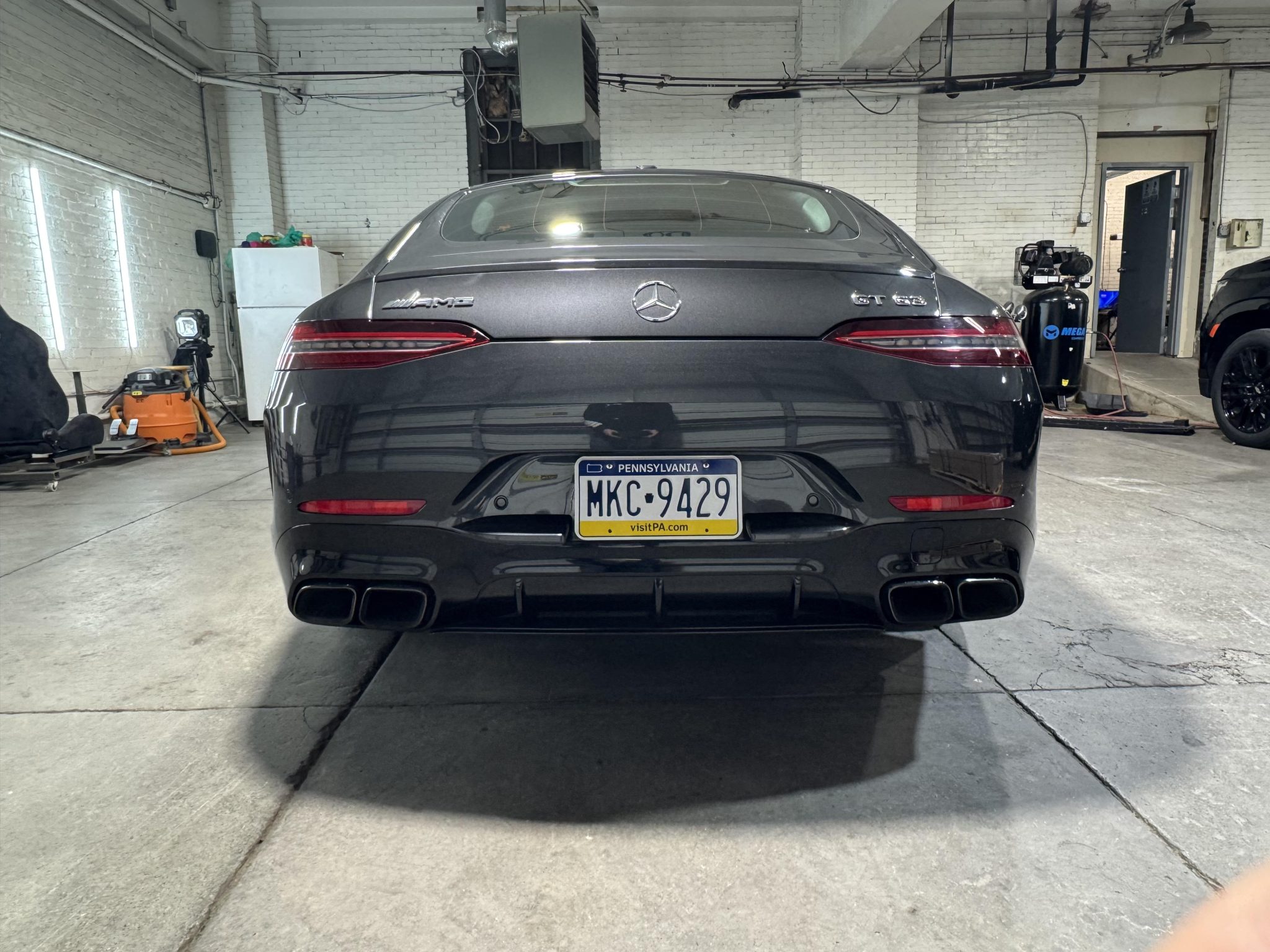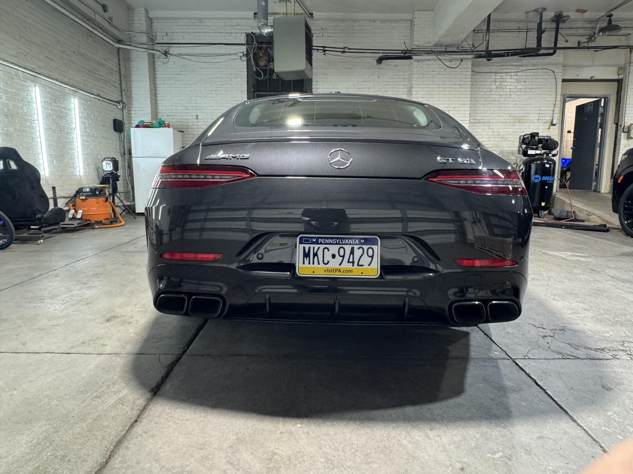 Twin five-spoke 20″ AMG wheels with gray accents are mounted with 295/35 Michelin Pilot Sport 4S tires. Standard equipment for the GT63 included an AMG Ride Control suspension with Air Body Control as well as active rear-wheel steering. Braking is handled by yellow-finished AMG-branded calipers mounted over cross-drilled discs.