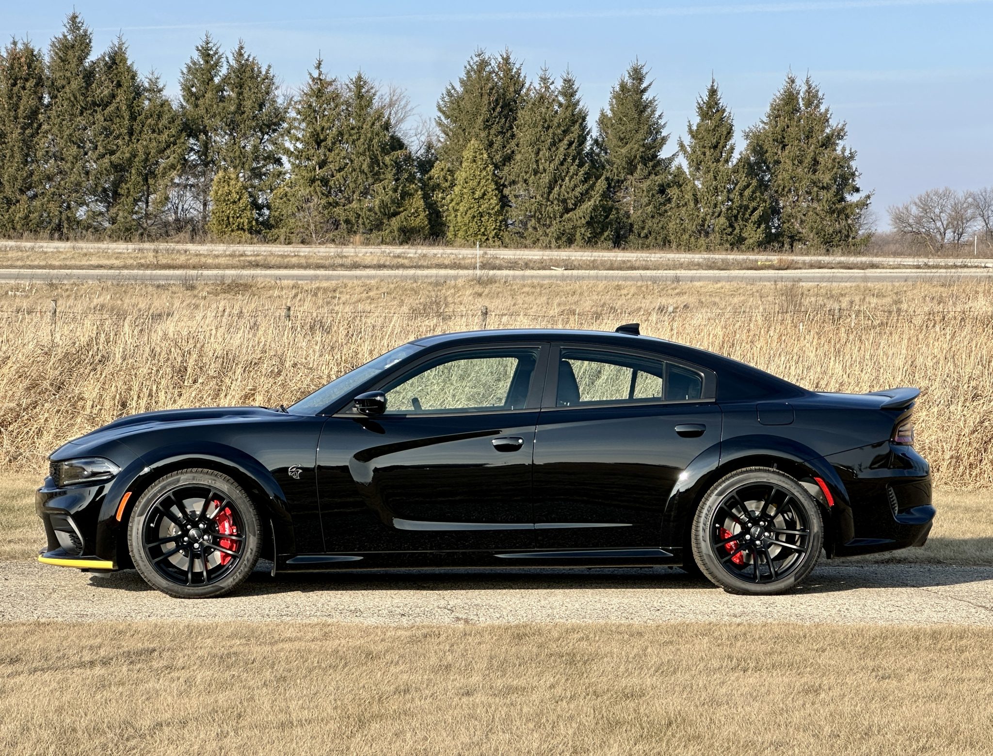 Black 20″ split five-spoke wheels are mounted with 305/35 Pirelli P Zero All Season tires. The four-wheel disc brake system features red-finished calipers and slotted front rotors, and the car is equipped with adaptive Bilstein dampers.