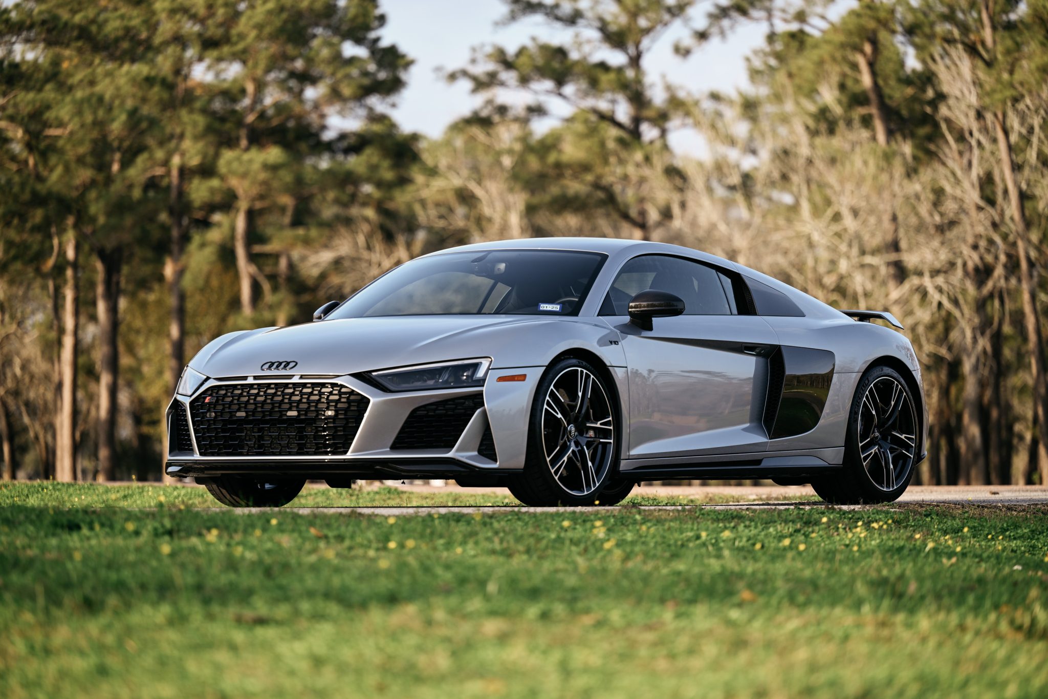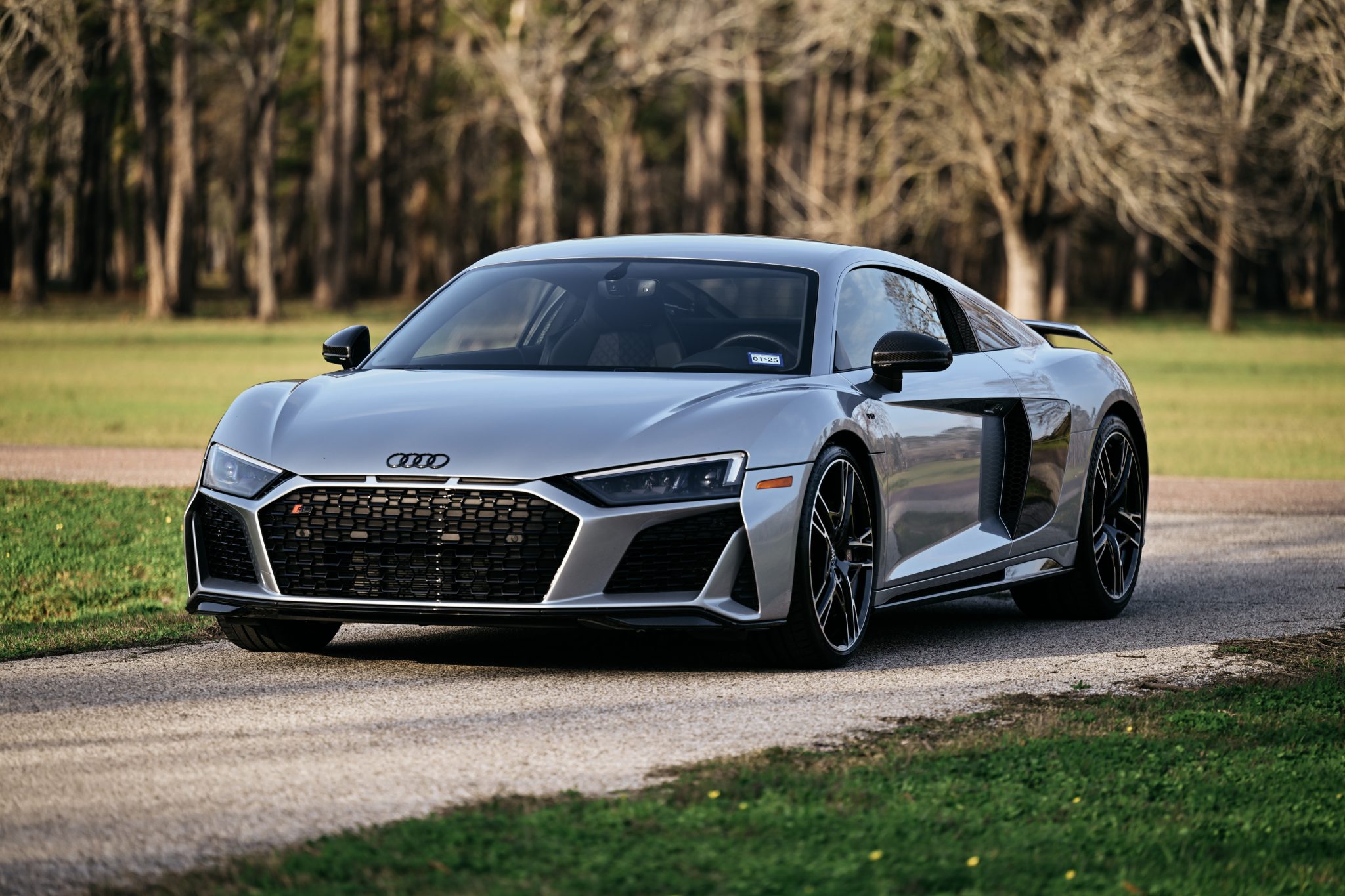 The 20″ double five-spoke alloy wheels are mounted with 245/30 front and 305/30 rear Michelin Pilot Sport 4S tires. Braking is handled by gray-finished calipers fitted over cross-drilled and ventilated ceramic-composite discs at each corner. The car came equipped from the factory with a fixed sport suspension.