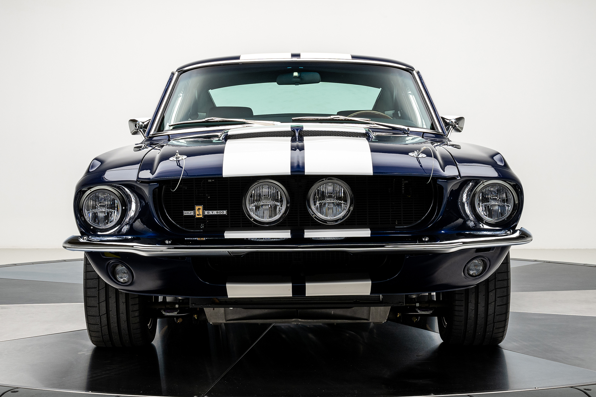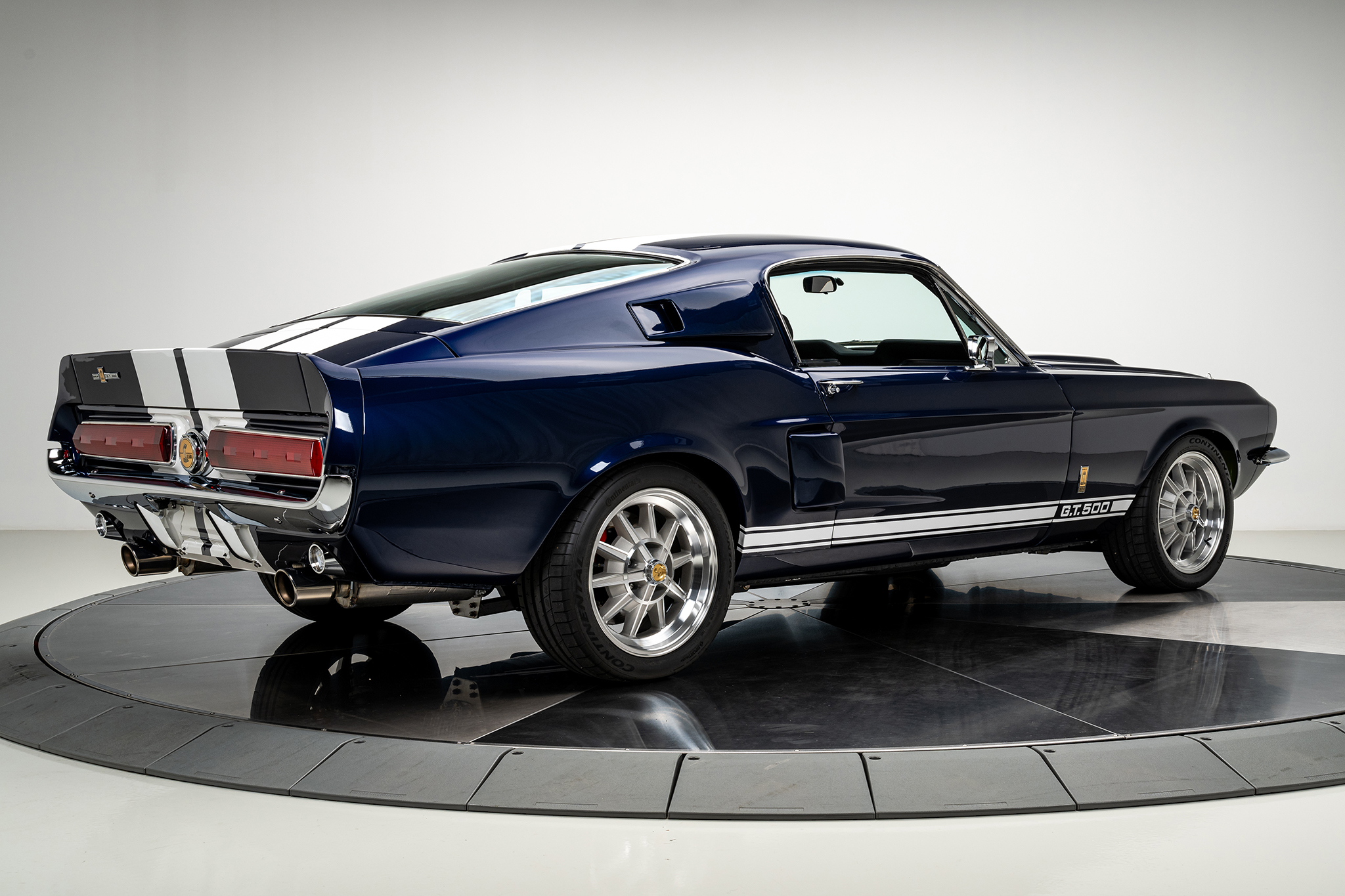 This Shelby GT500 example is listed as production #127 in the Revology registry and is painted Midnight Blue Metallic with Wimbledon White over-the-top stripes. Vinyl stripe decals were applied to the sides, and the fiberglass hood is supported by billet aluminum hinges with gas struts. Exterior details include an integrated rear spoiler, center-mounted driving lamps, LED lighting, exposed hood locks, side scoops, and chrome bumpers and mirrors.
