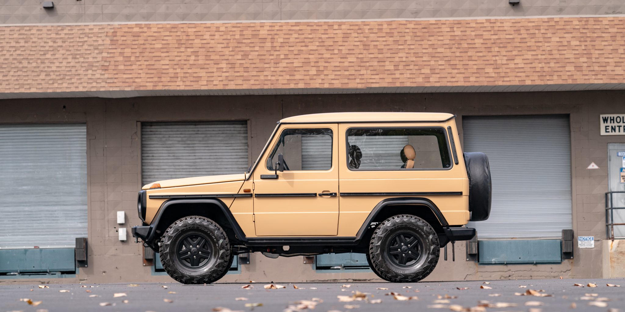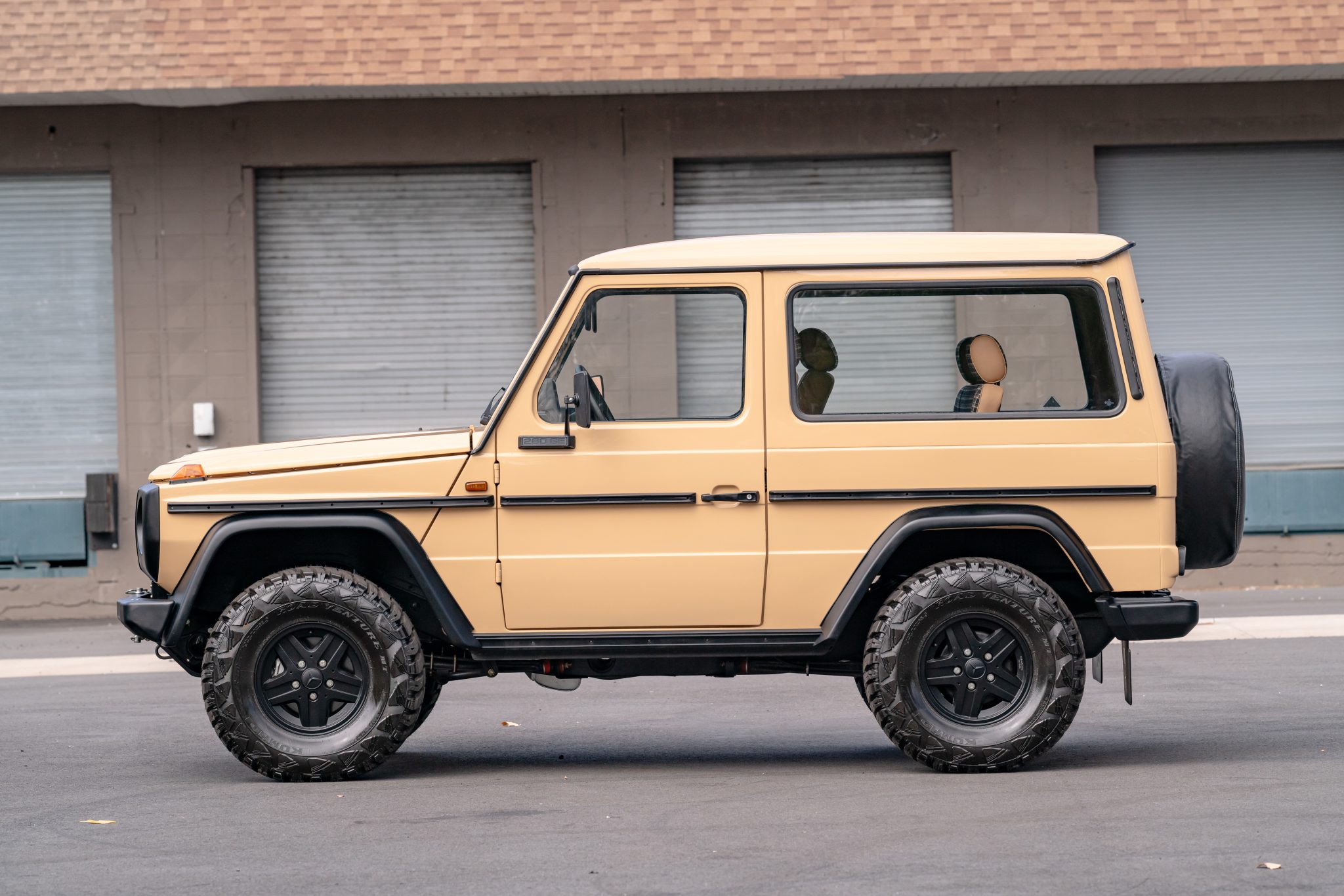 The 15″ five-spoke alloy wheels are mounted with 32×11.50″ Kumho Road Venture tires that were installed in 2023. A spare with a Mercedes-branded cover is housed on the rear cargo door. The truck is equipped with power steering, and braking is provided by power-assisted front discs and rear drums. The selling dealer states that the suspension was overhauled, the axles were rebuilt, and the brake rotors were replaced during the refurbishment.