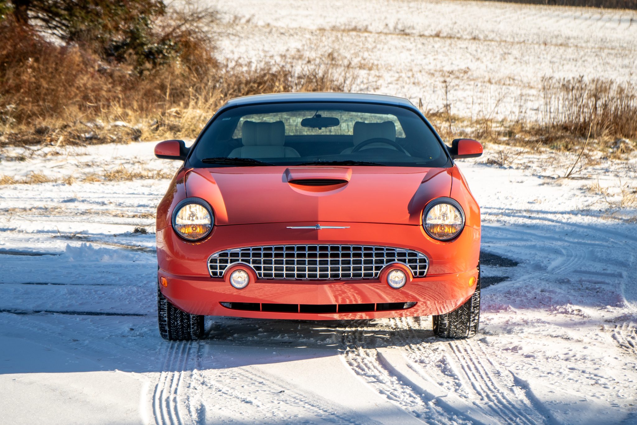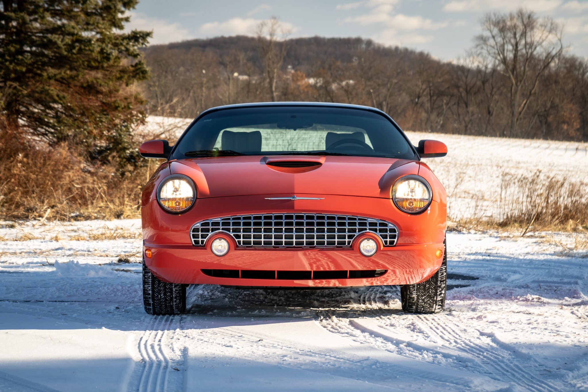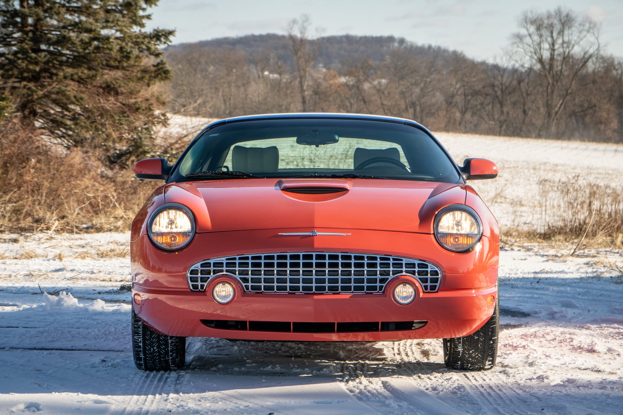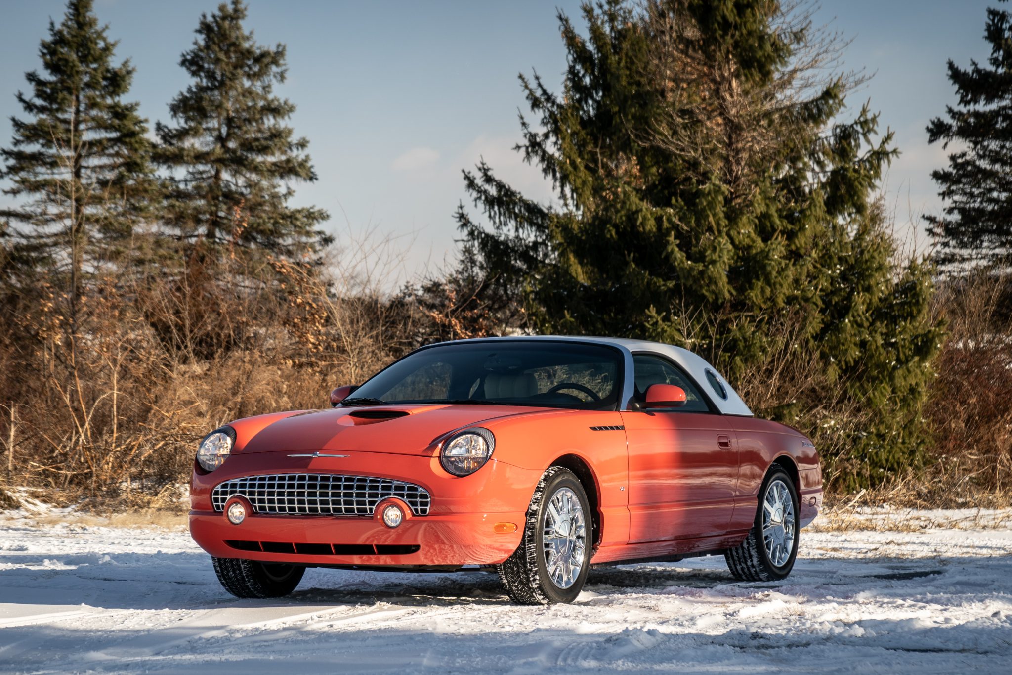 The 17″ chrome-finished Deluxe wheels feature Thunderbird-branded center caps and are mounted with older Michelin Pilot HX MXM4 tires. The car is equipped with four-wheel independent suspension and ventilated disc brakes.