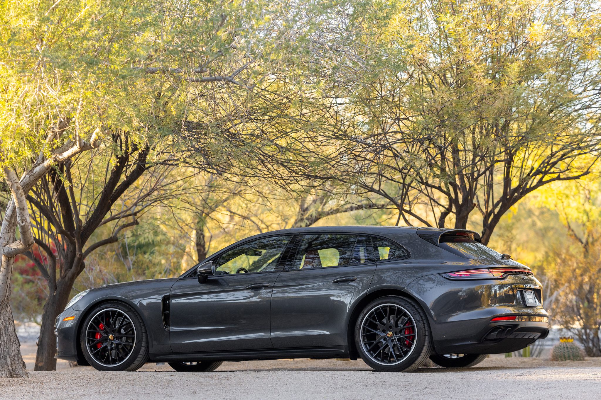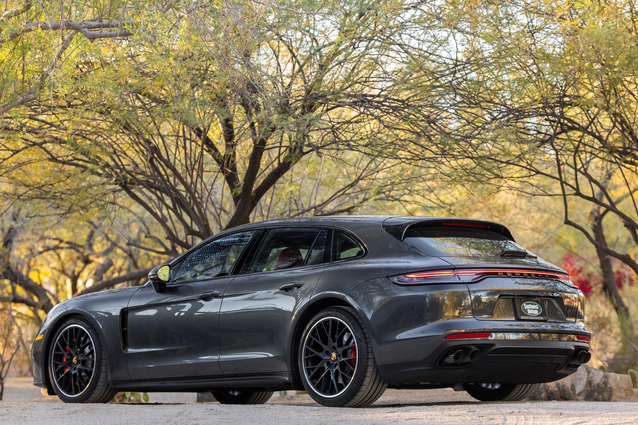 The 21″ SportDesign alloy wheels are mounted with Pirelli P Zero tires measuring 275/35 up front and 315/30 out back. Tire replacement is noted on the Carfax report in December 2023 and wheel repair is noted on the report in August 2024. An adaptive air suspension with Porsche Active Suspension Management (PASM) was equipped from the factory, and stopping power is provided by four-wheel slotted and ventilated discs with red calipers.