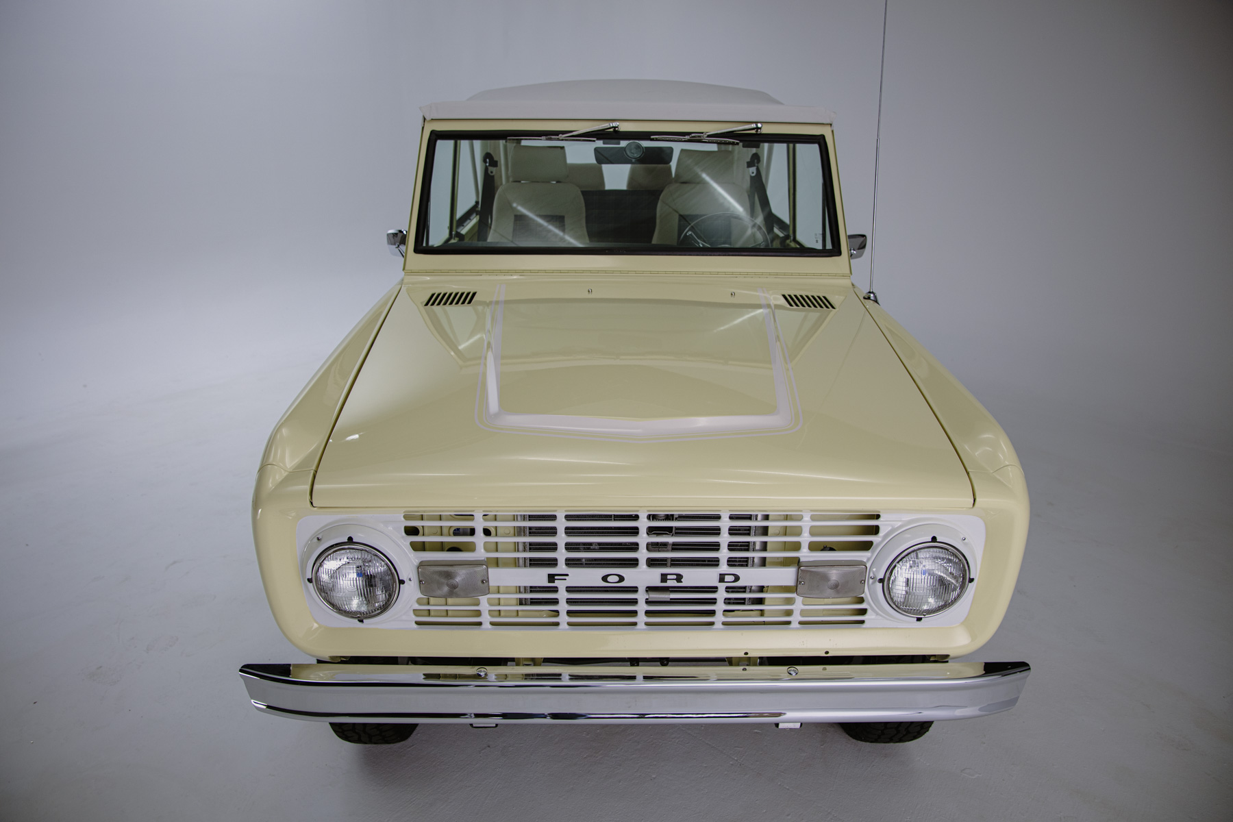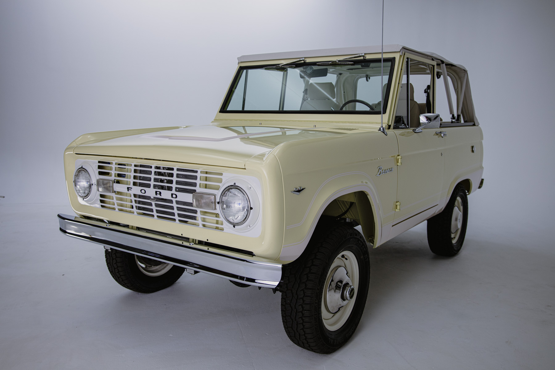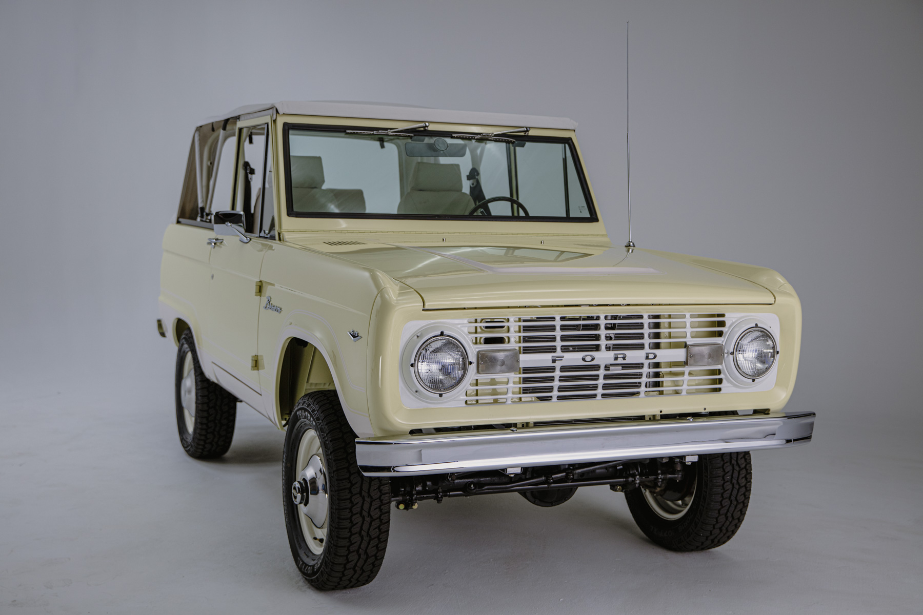 Body color 16″ steel wheels feature bright hubcaps and are mounted with 225/70 Armstrong Tru-Trac AT tires. The truck is equipped with manually locking front hubs, power steering, Bilstein shock absorbers, and a body lift. Braking is handled by discs at all four corners.