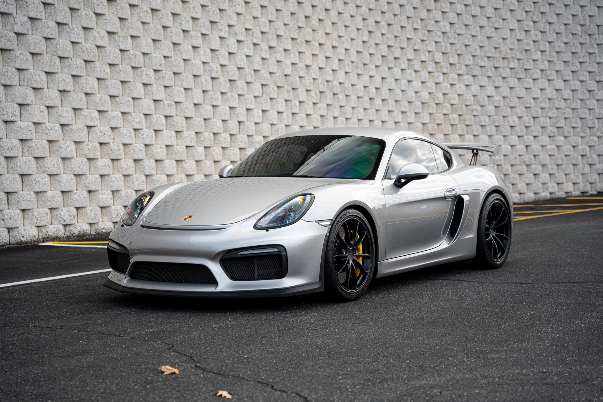 Satin black 20″ GT4 alloy wheels are mounted with Michelin Pilot Sport Cup 2 tires that show date codes from 2021 and 2022. The GT4 utilized front suspension components from the 991.1 GT3 as well as a specially tuned multi-link rear setup, Porsche Stability Management, Porsche Torque Vectoring, and PASM adaptive dampers. The car is equipped with Porsche Ceramic Composite Brakes (PCCB) featuring yellow-painted Porsche-branded calipers at all four corners.