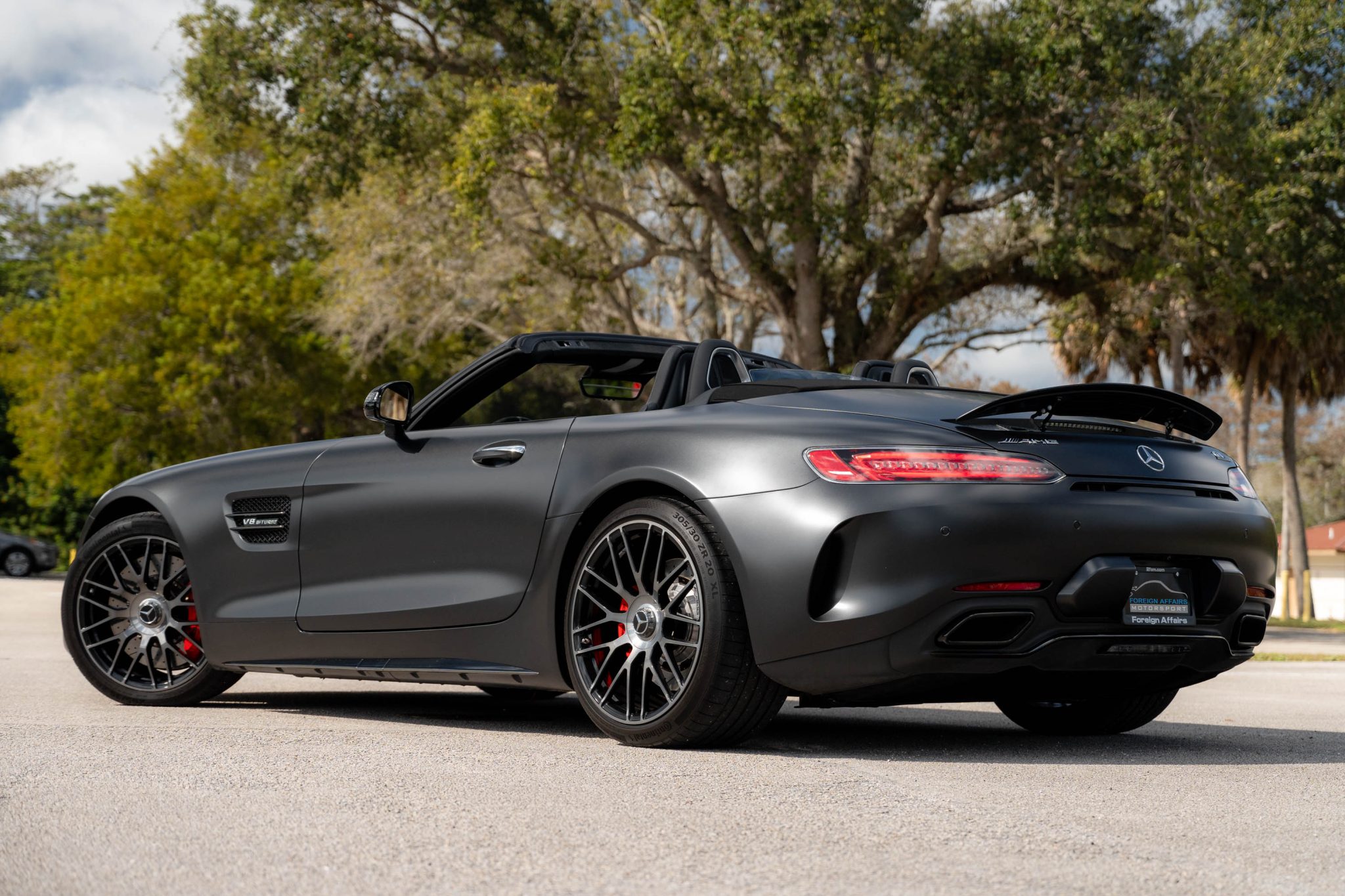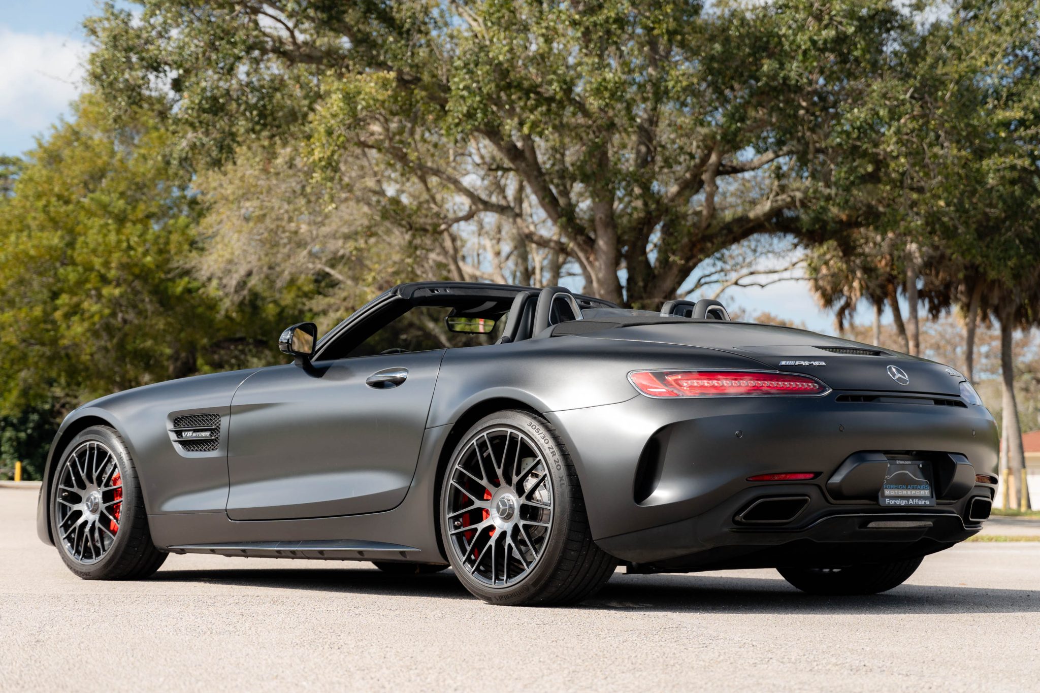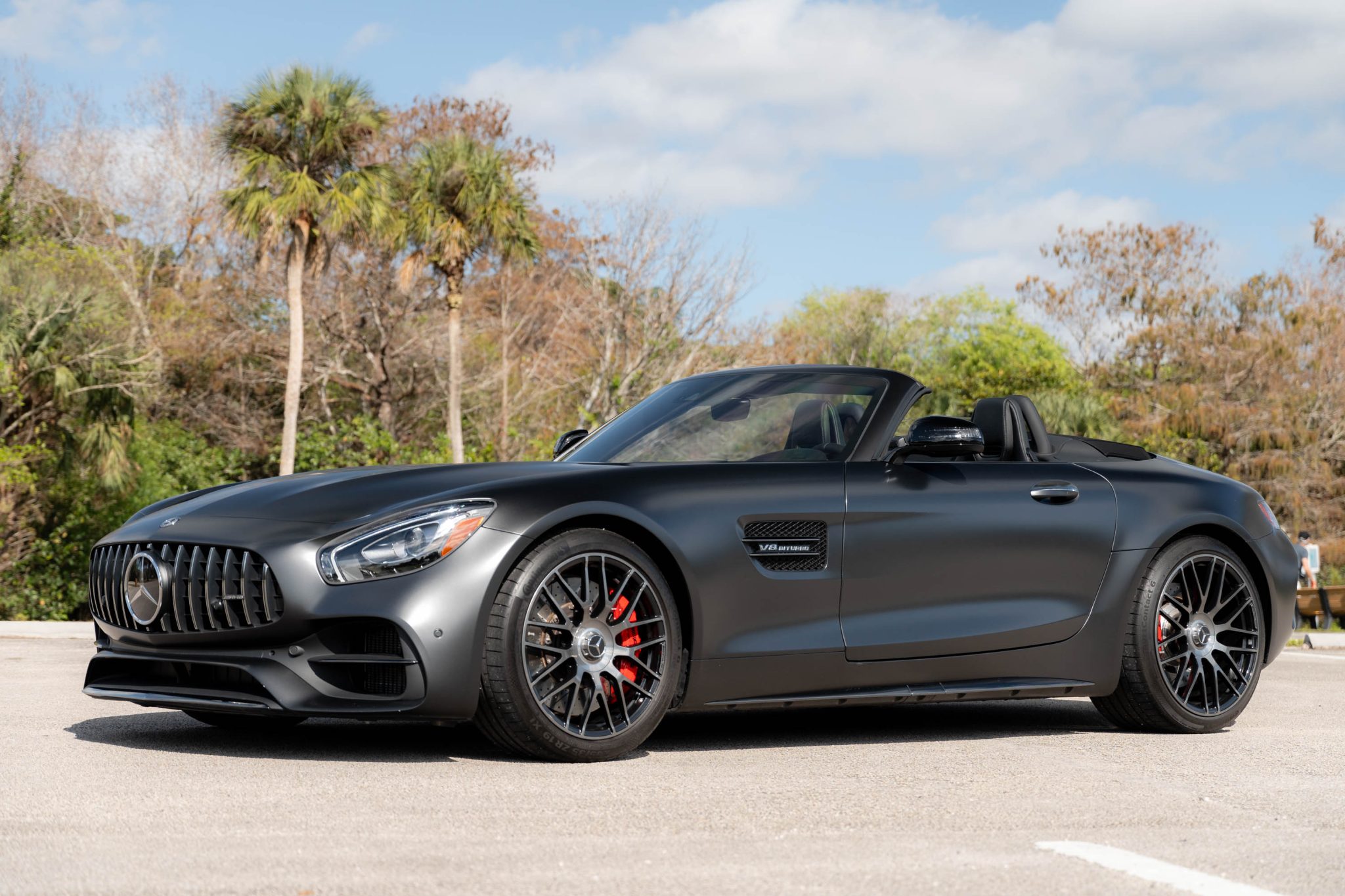 The 19″ and 20″ AMG forged cross-spoke wheels are mounted with Continental tires. The car came equipped from the factory with an AMG Adaptive Sport Suspension and rear-axle steering. Red-finished calipers are fitted over cross-drilled and slotted discs at all four corners.