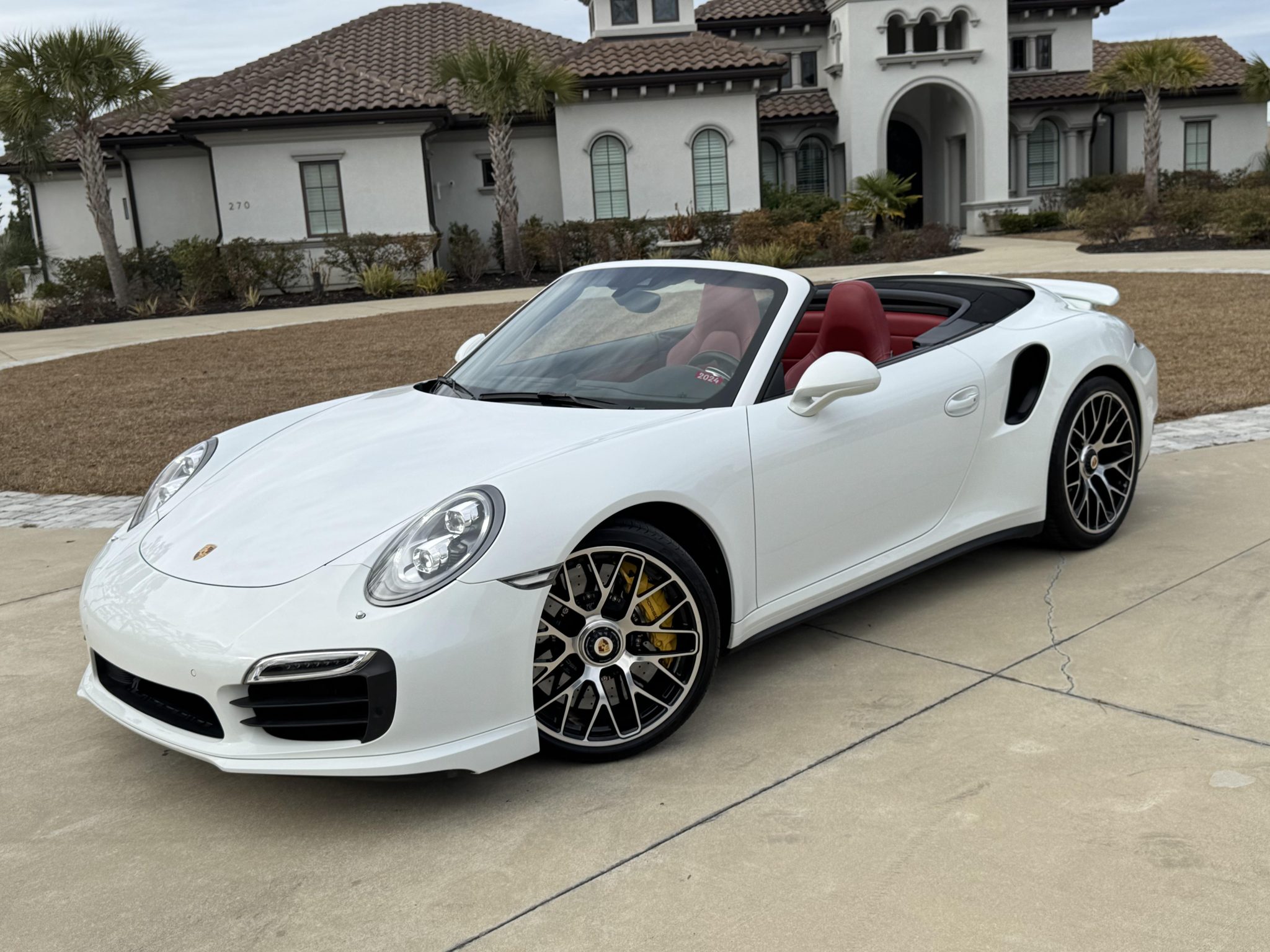 The 20″ Turbo S center-lock alloy wheels are mounted with 245/35 front and 305/30 rear Pirelli P Zero tires. Braking is handled by Porsche Ceramic Composite Brakes (PCCB) featuring yellow-painted Porsche-branded calipers at all four corners. Rear-axle steering and Porsche Dynamic Chassis Control (PDCC) were standard equipment on the Turbo S, and this example is also equipped with Power Steering Plus. The brake fluid was flushed in 2023.