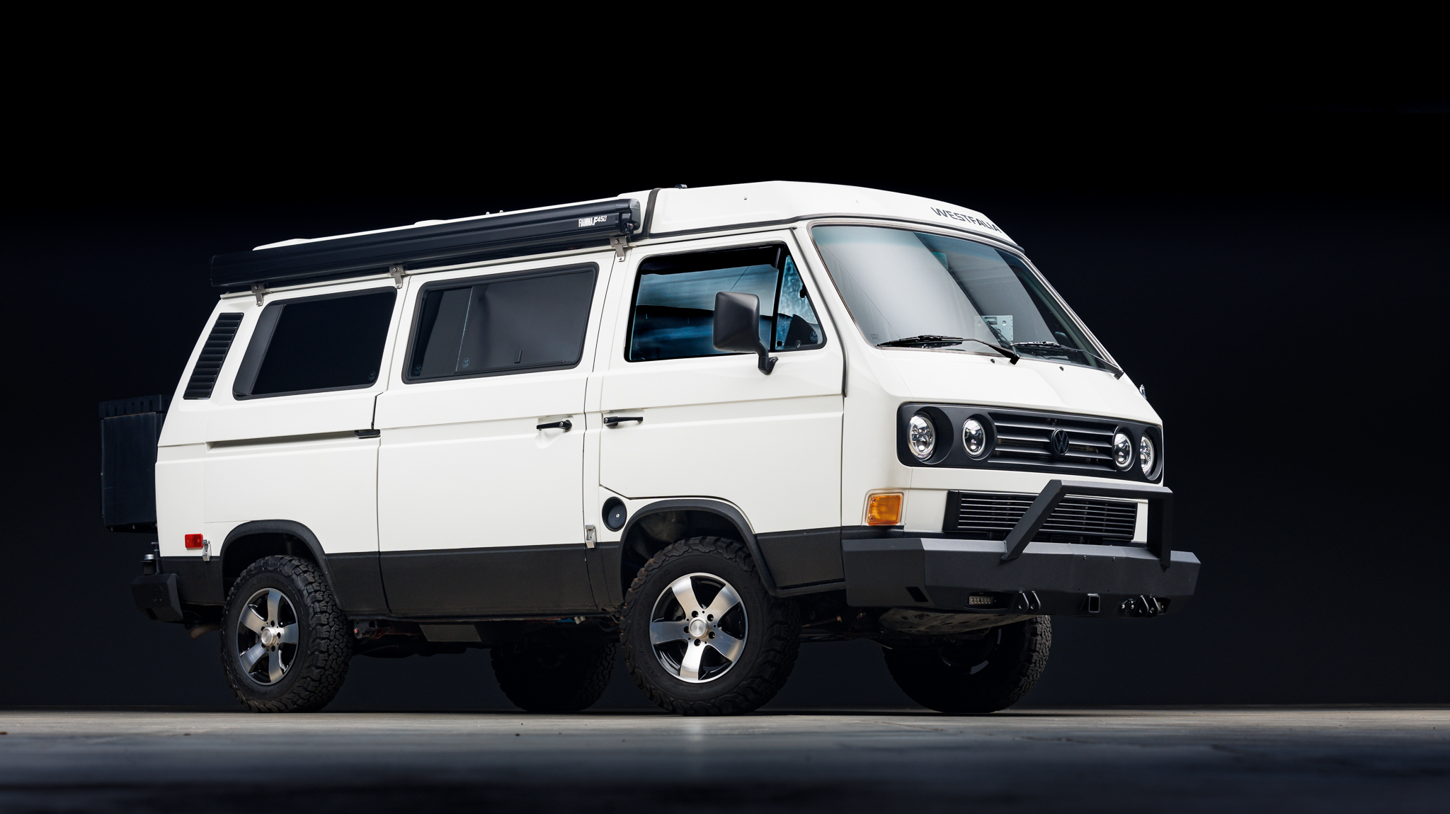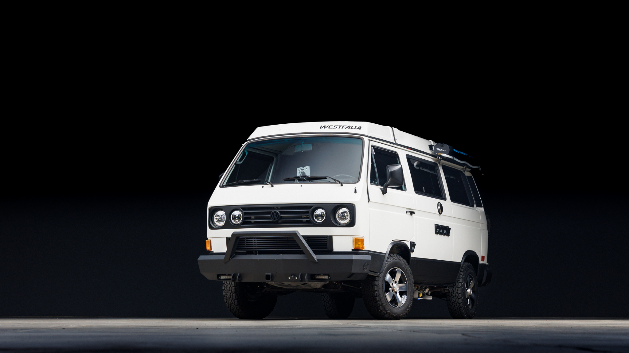 Van Cafe 15″ five-spoke wheels are mounted with 215/75 BFGoodrich All-Terrain T/A KO2 tires, the rear of which were replaced in December 2024. The fully independent suspension has been modified with GoWesty springs, Fox shock absorbers, Powerflex bushings, a T3 Technique front anti-roll bar kit with heavy-duty end links, and Moog tie rod ends. Stopping power is provided by disc brakes at all four corners, which have been fitted with a BMW-sourced brake booster, a replacement master cylinder, a front big brake kit with dual-piston calipers, and braided stainless-steel lines. The upper and lower ball joints were replaced in October 2024.