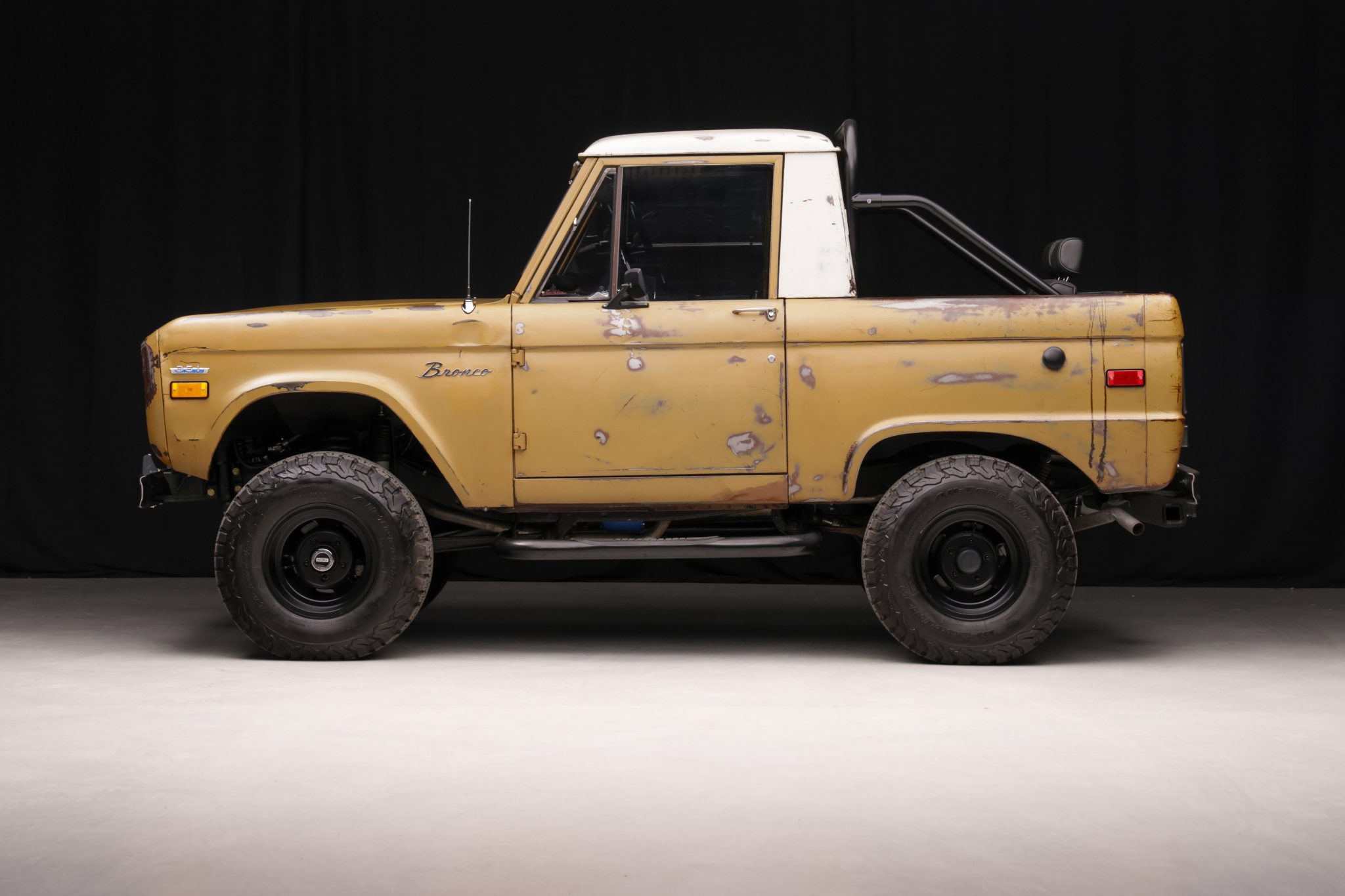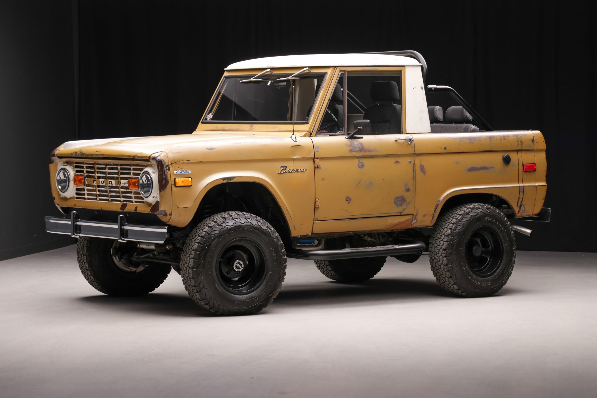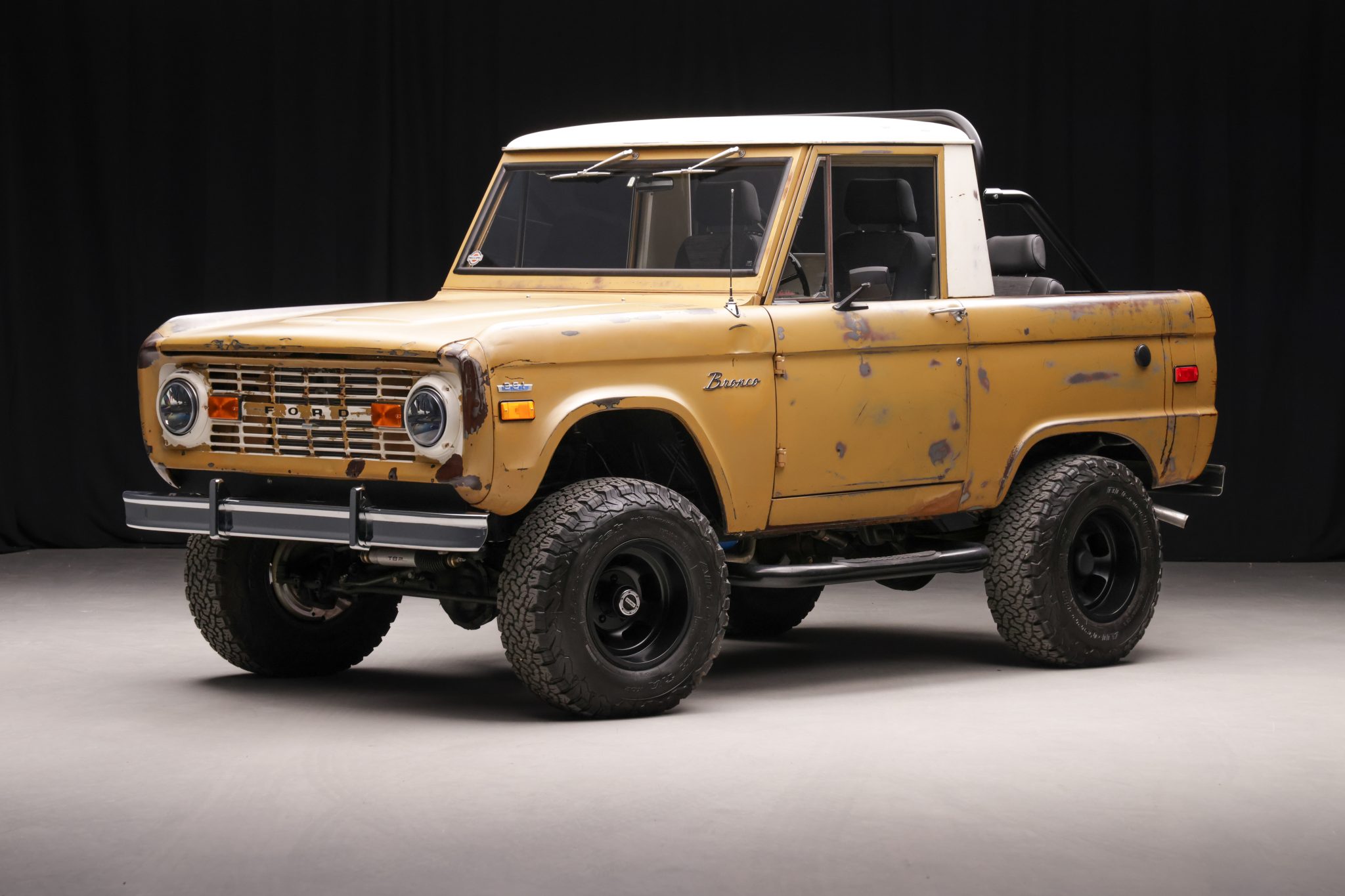 Black-finished 15” US Mags Indy wheels are wrapped in 31×10.50” BFGoodrich All-Terrain T/A KO2 tires, and the front axle is equipped with manually locking Warn hubs. Power steering was fitted during the refurbishment, and the suspension features a Tom’s Bronco Parts steering stabilizer along with aftermarket shocks. A rear disc brake conversion kit was installed in 2022.