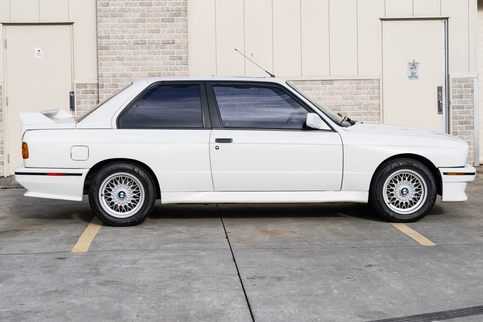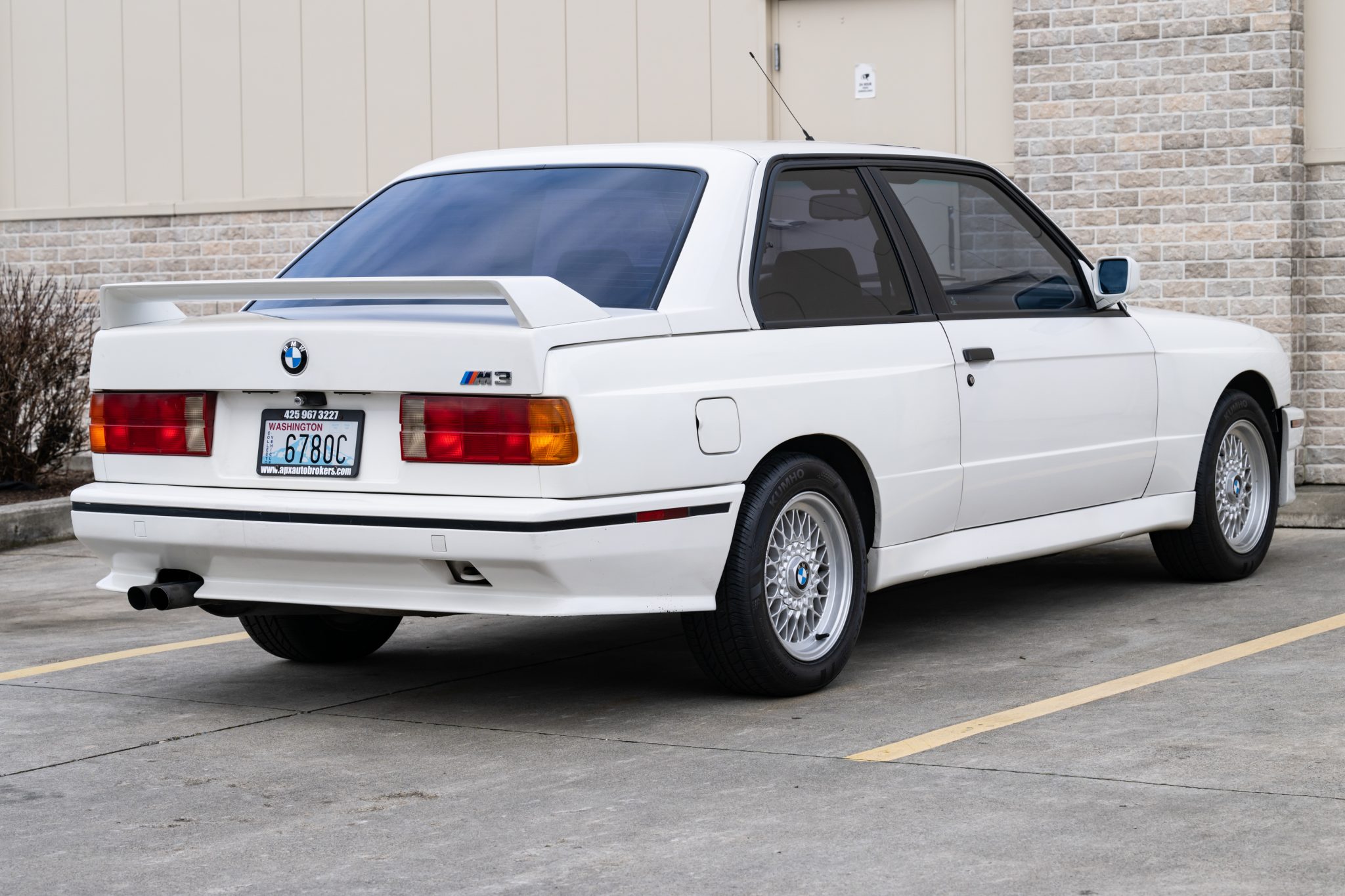 Silver 15″ basketweave wheels feature BMW center caps and are mounted with Kumho Ecsta tires that have 2018 and 2019 date codes. The MacPherson strut/semi-trailing arm suspension was revised for the M3 with a thicker rear anti-roll bar as well as shorter and stiffer springs.