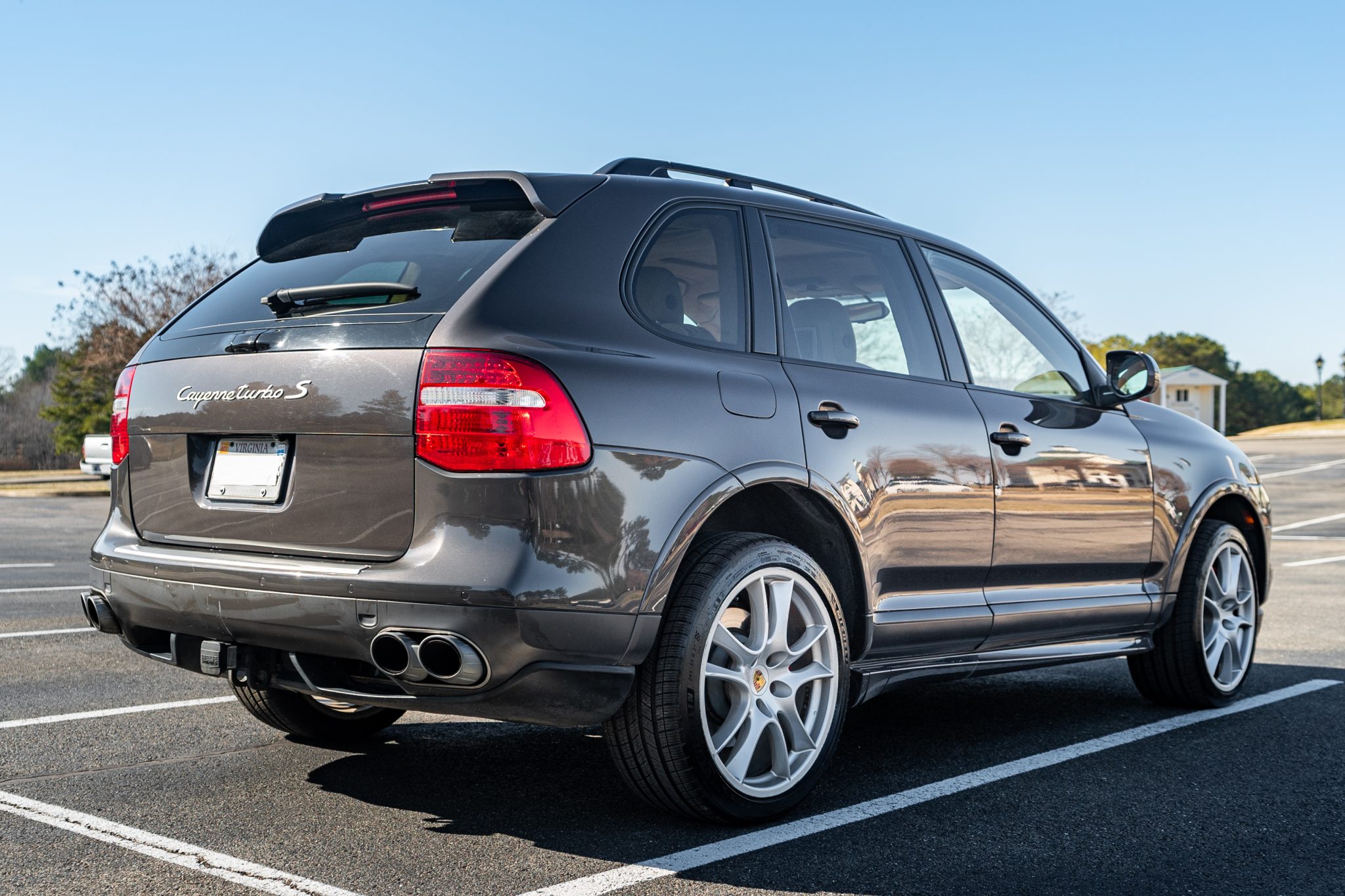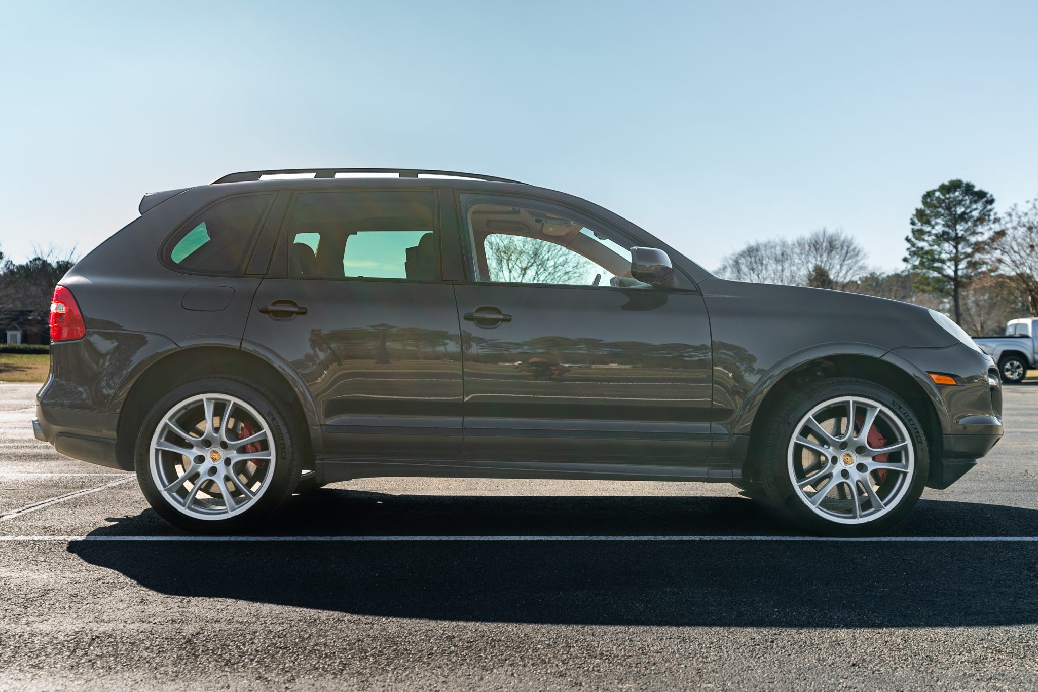 The 21″ Cayenne Sport alloy wheels were mounted with Michelin Pilot Sport All Season 4 tires in February 2024. The truck is equipped with an air suspension and Porsche Active Suspension Management (PASM). Stopping power is from red Porsche-branded calipers over ventilated rotors at each corner. The rear brake rotors and pads were replaced in April 2020, and the front brake rotors and pads were replaced in June 2017. There is curb damage on the wheels.