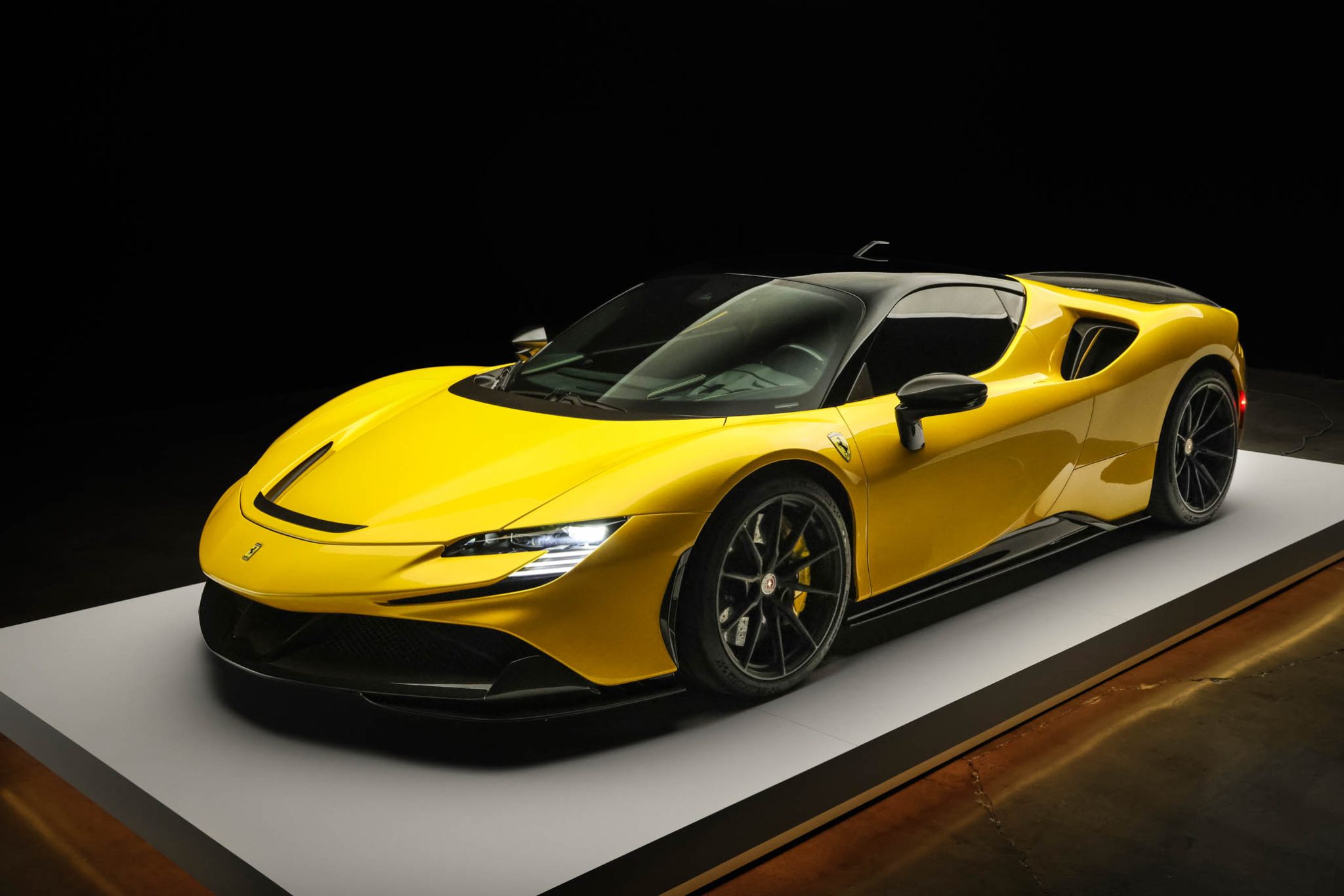 Black-finished 20″ HRE wheels are mounted with 255/35 front and 315/30 rear Michelin Pilot Sport Cup 2 tires. The SF90 Stradale features an aluminum chassis, and Multimatic-sourced shocks and titanium springs were included as part of the Assetto Fiorano package. The electronic Side Slip Control (eSSC) system can distribute torque to all four wheels, while the electric traction control system (eTC) can deliver power to individual corners. The regenerative braking system is controlled via a brake-by-wire system that splits braking between the hydraulic system and the electric motors. A yellow-finished caliper and a carbon-ceramic rotor are fitted at each corner.