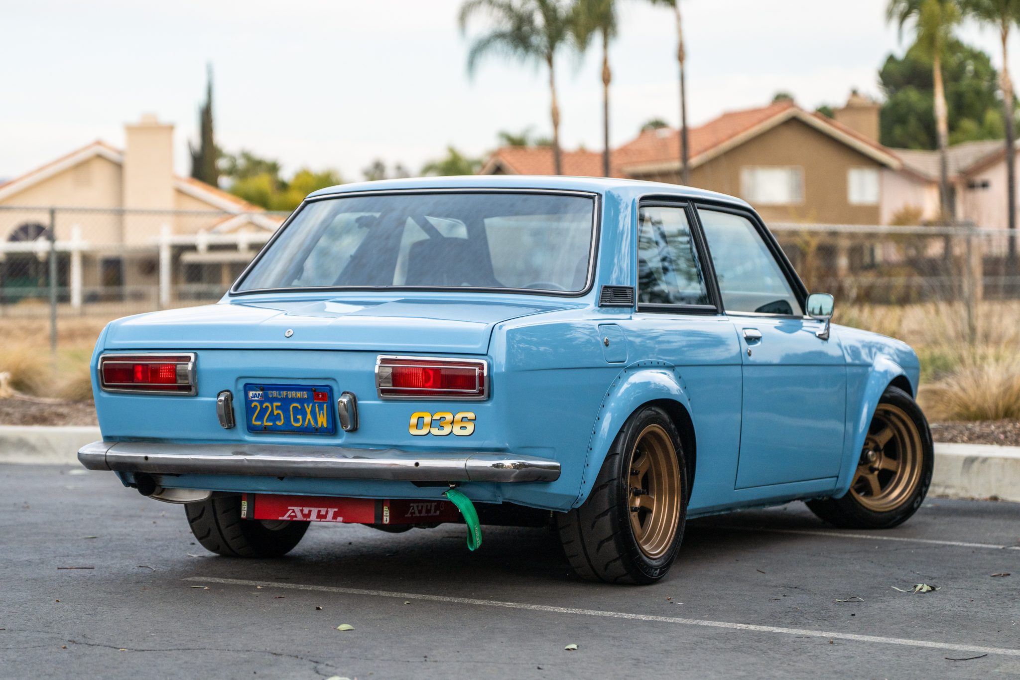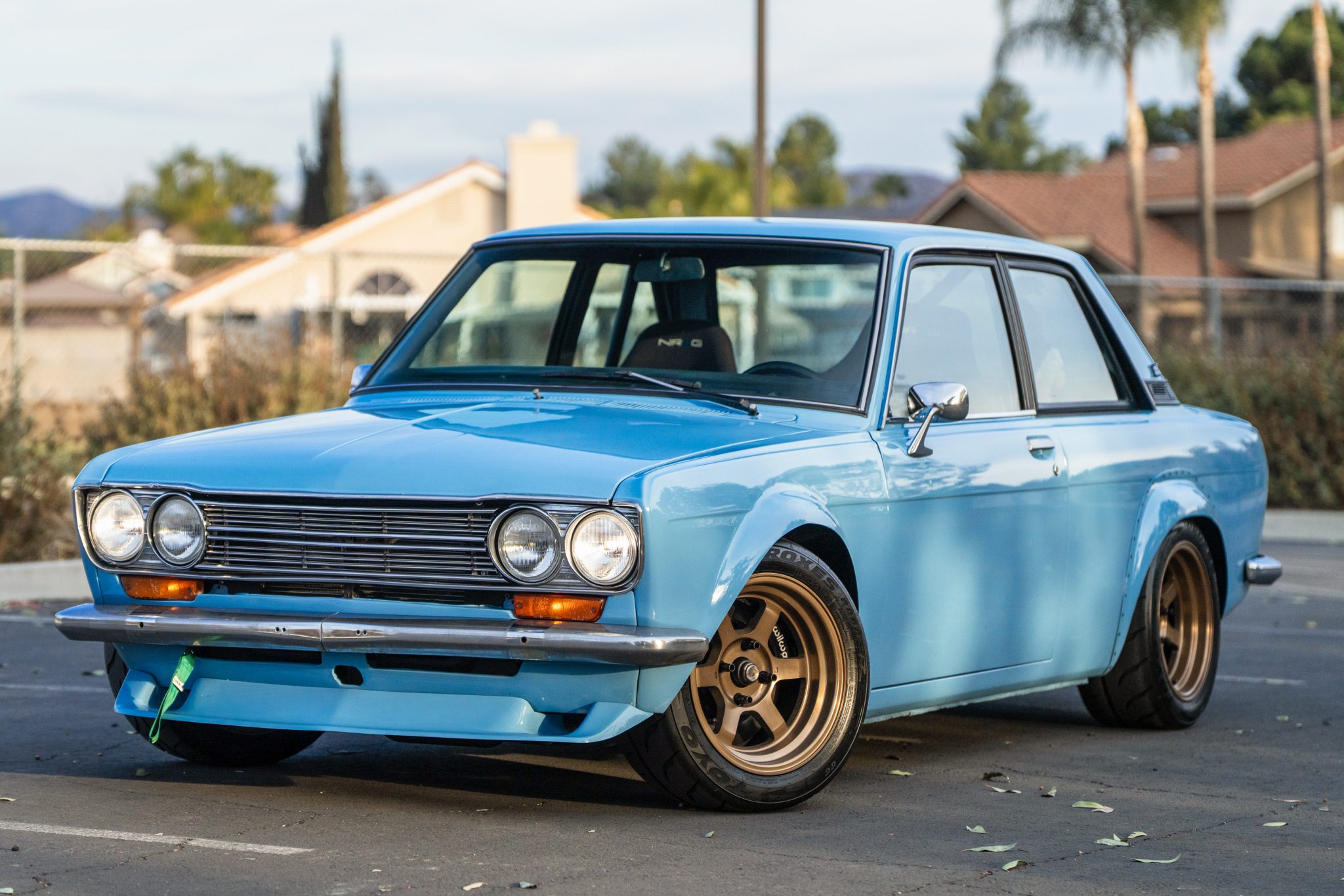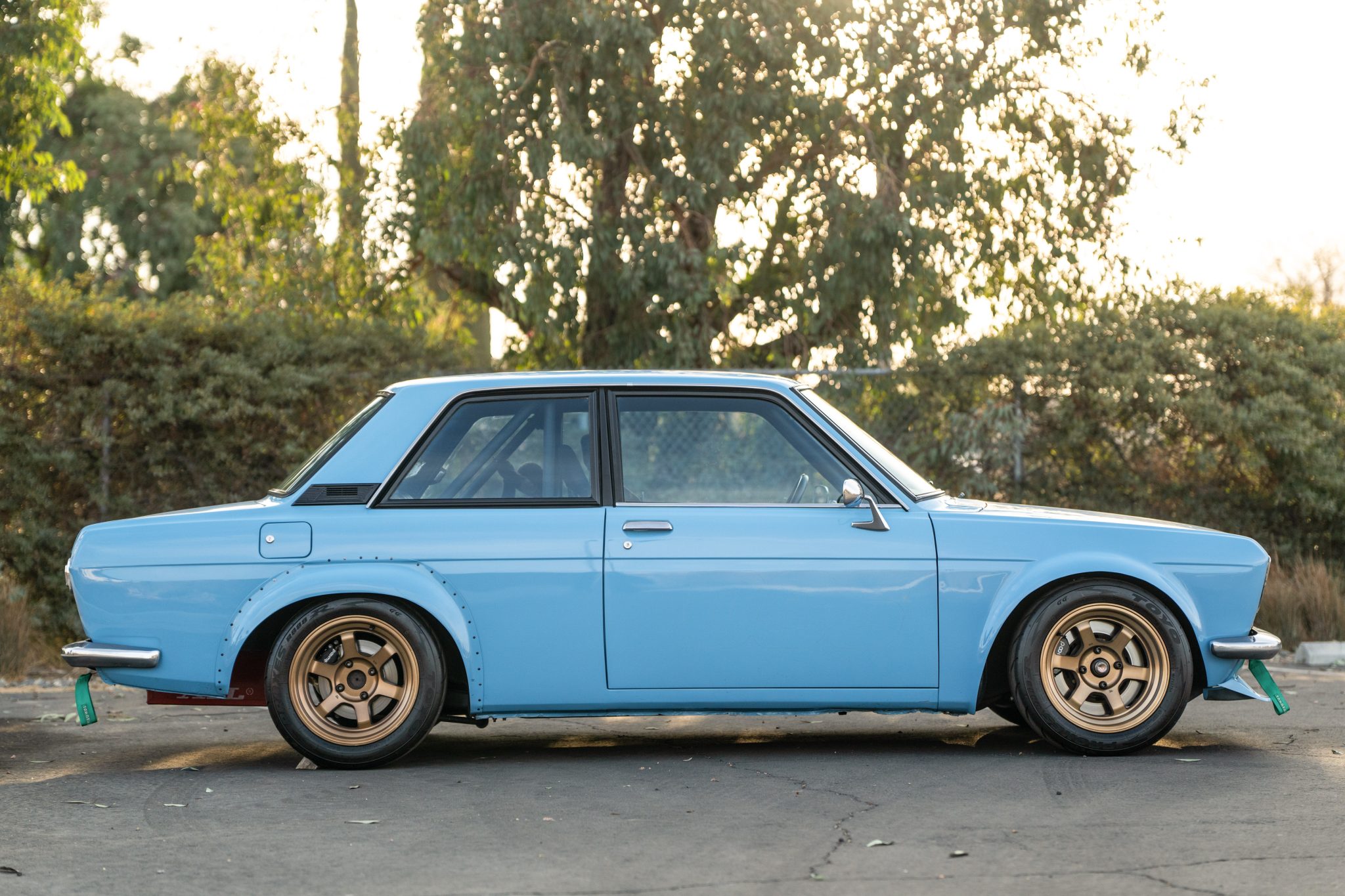 Gold-finished Rota Grid 15” wheels are mounted with 225/45 Toyo Proxes R888R tires. Adjustable coilovers were installed in 2016, and braking is handled by 280ZX-specification disc brakes with Wilwood calipers at all four corners.