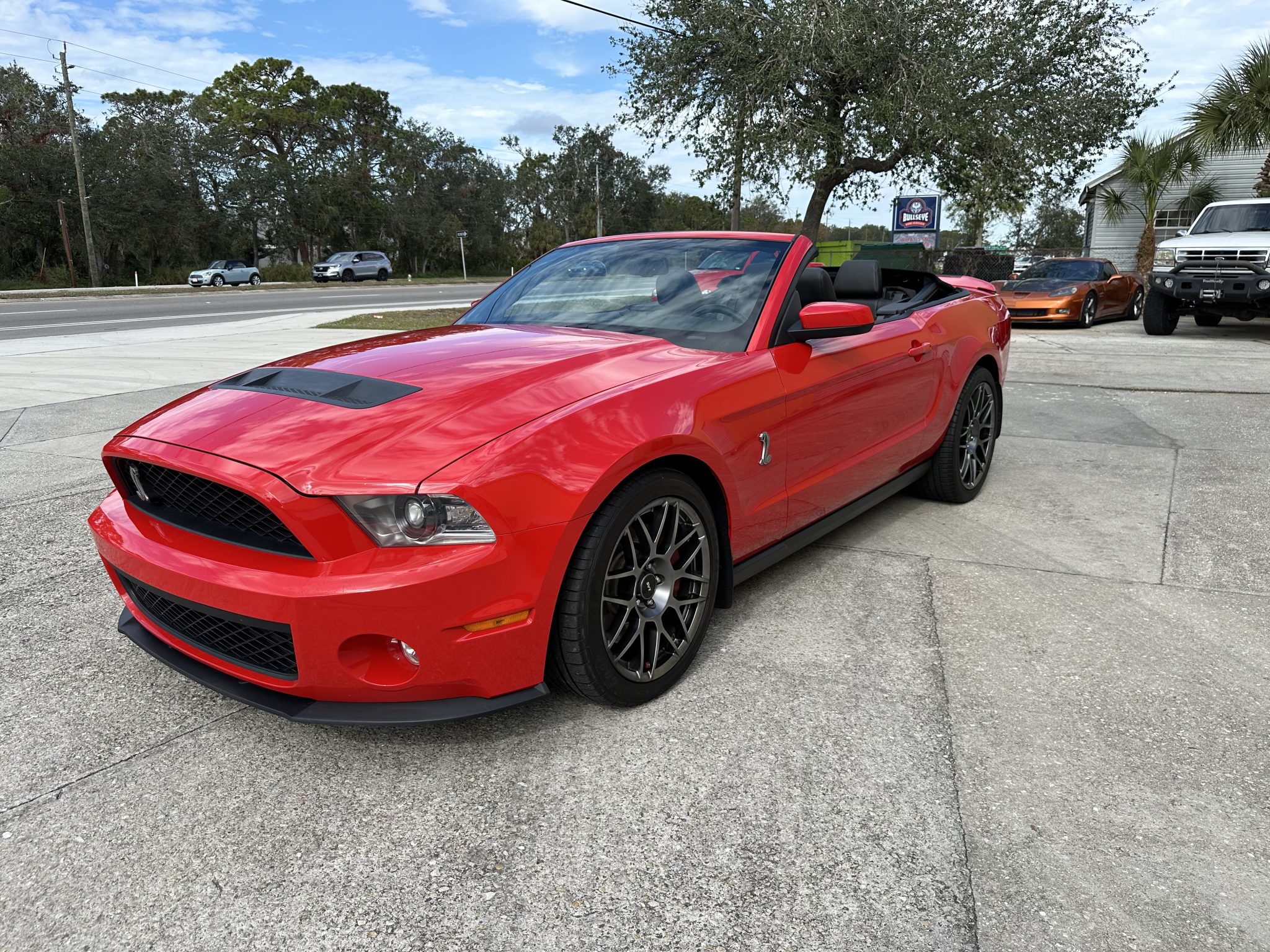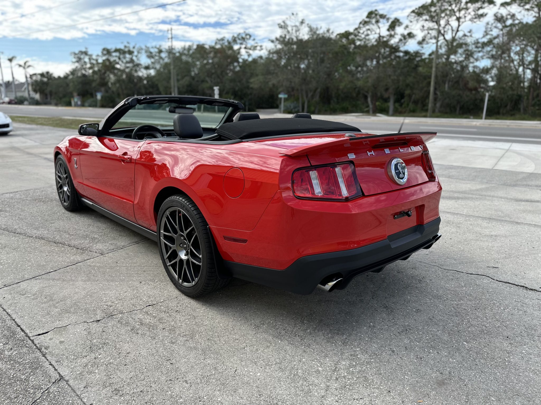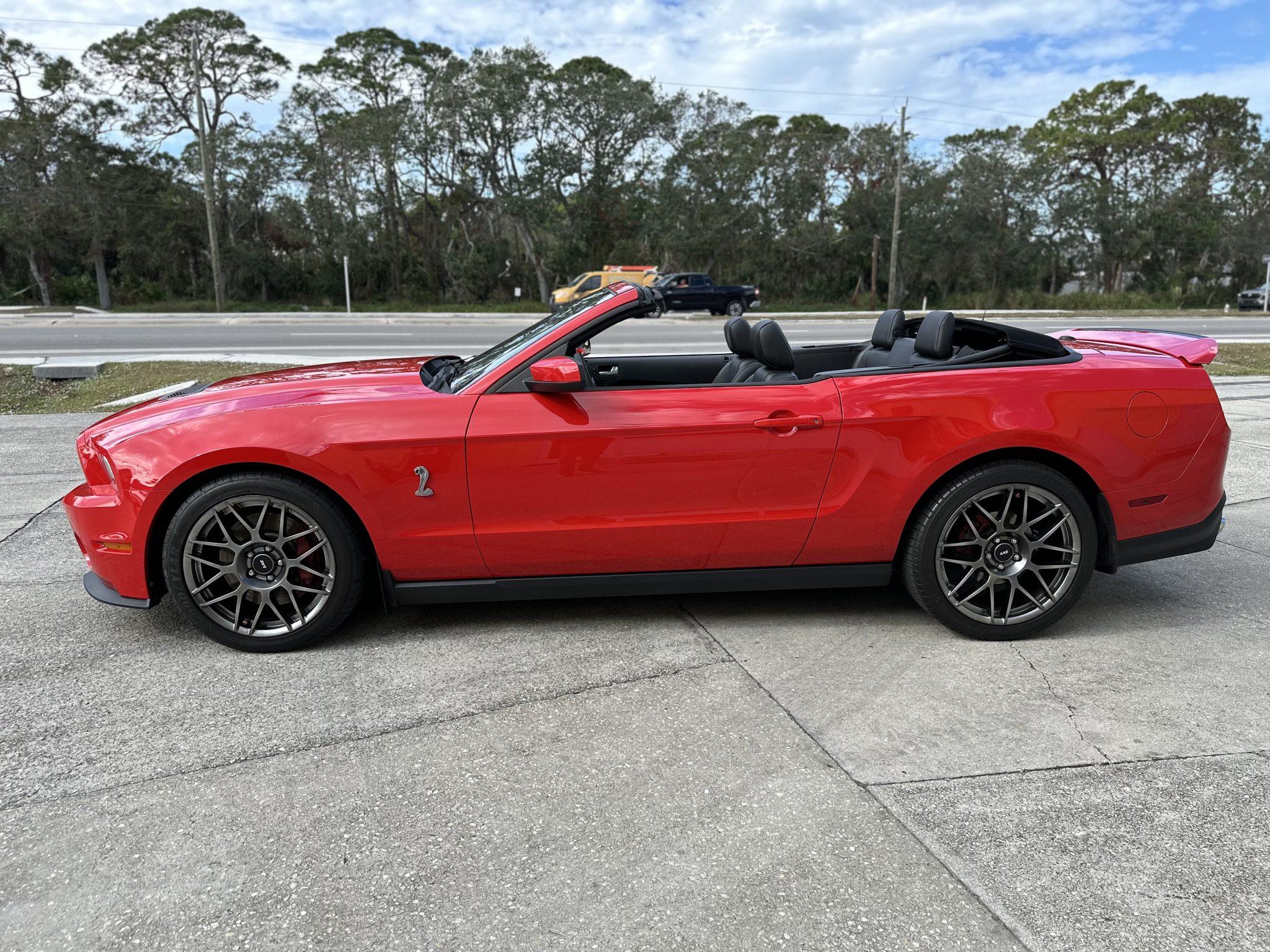 Staggered-diameter 19″ and 20″ forged alloy wheels are mounted with Goodyear Eagle F1 Supercar front and Michelin Pilot Sport A/S 3+ tires out back. Stopping power is provided by four-wheel disc brakes with Brembo front calipers, and the car is equipped with an SVT-tuned suspension.
