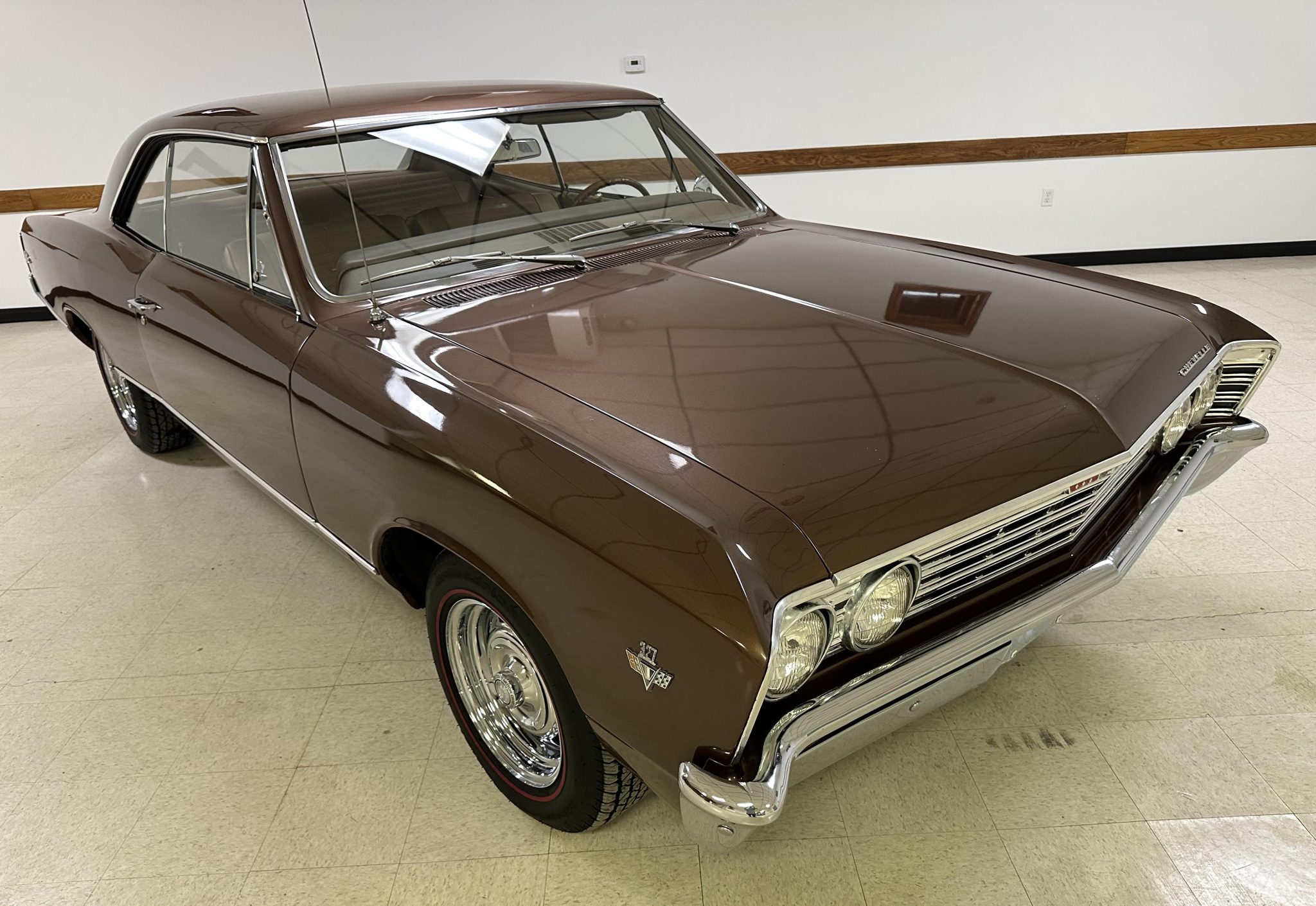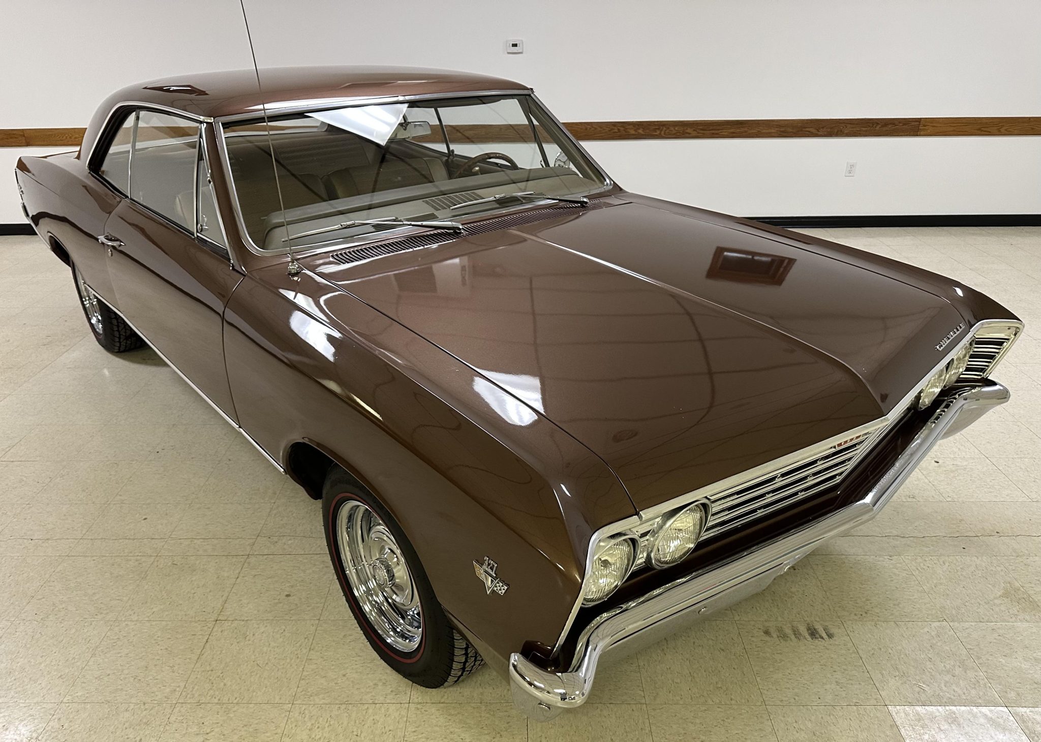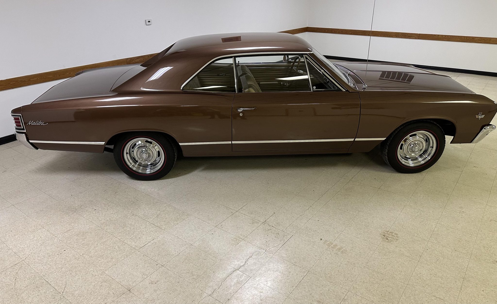 Chrome-finished Rally 15″ wheels are mounted with 215/65 BFGoodrich Silvertown Radial red-line tires that were installed in 2019. The car is equipped with power steering as well as a front and rear coil-spring suspension, and braking is provided by front and rear drums.
