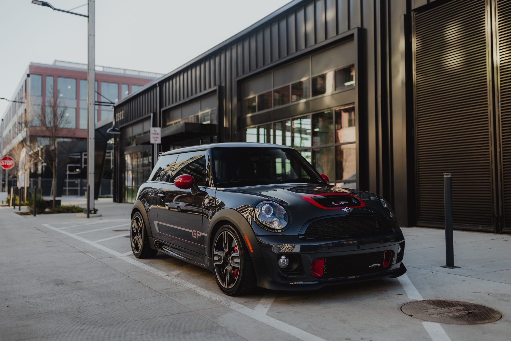 GP-specific 17″ John Cooper Works GP alloy wheels are mounted with Kumho Ecsta tires. The car is equipped with a GP-Mode Traction Control program, strut tower braces, a Tarett Engineering rear sway bar, and an adjustable coilover suspension. Braking is handled by braided stainless-steel lines feeding four-wheel discs with aftermarket slotted rotors.