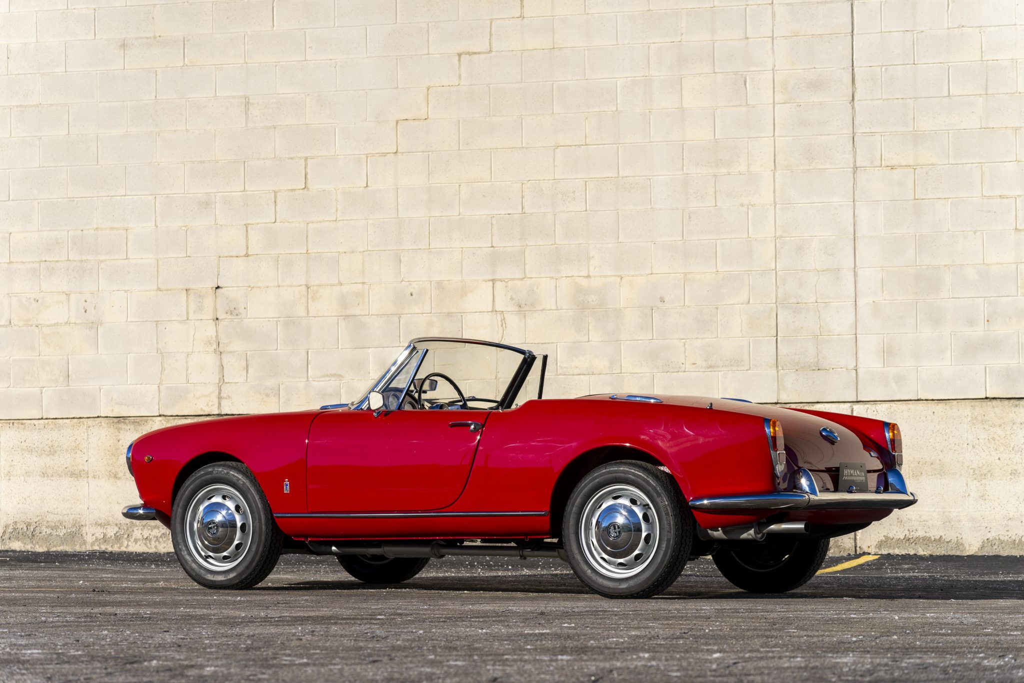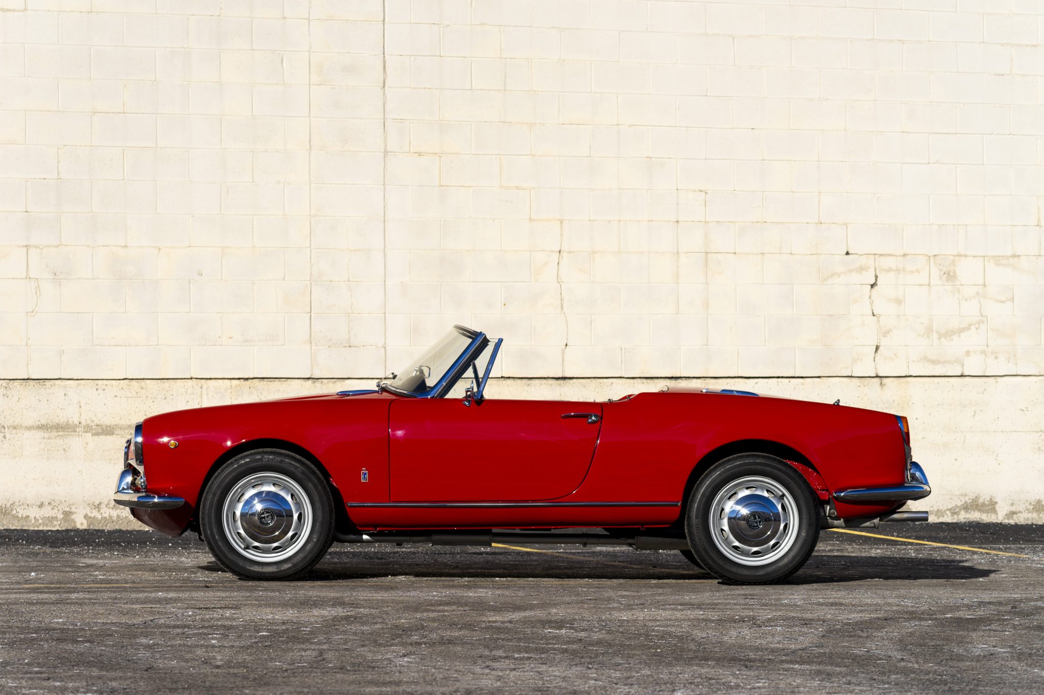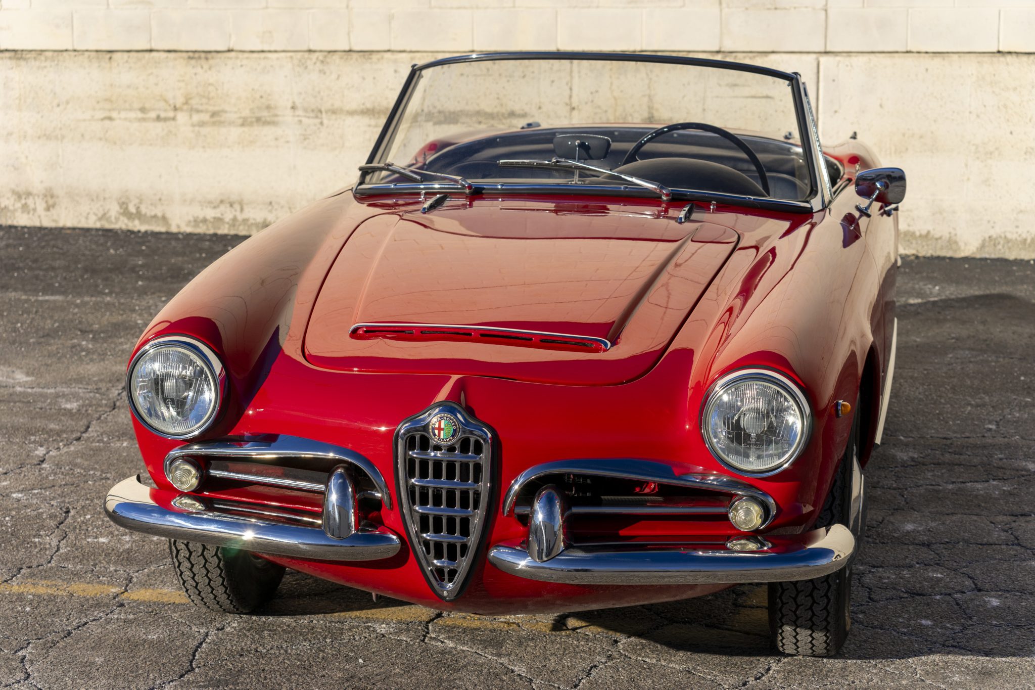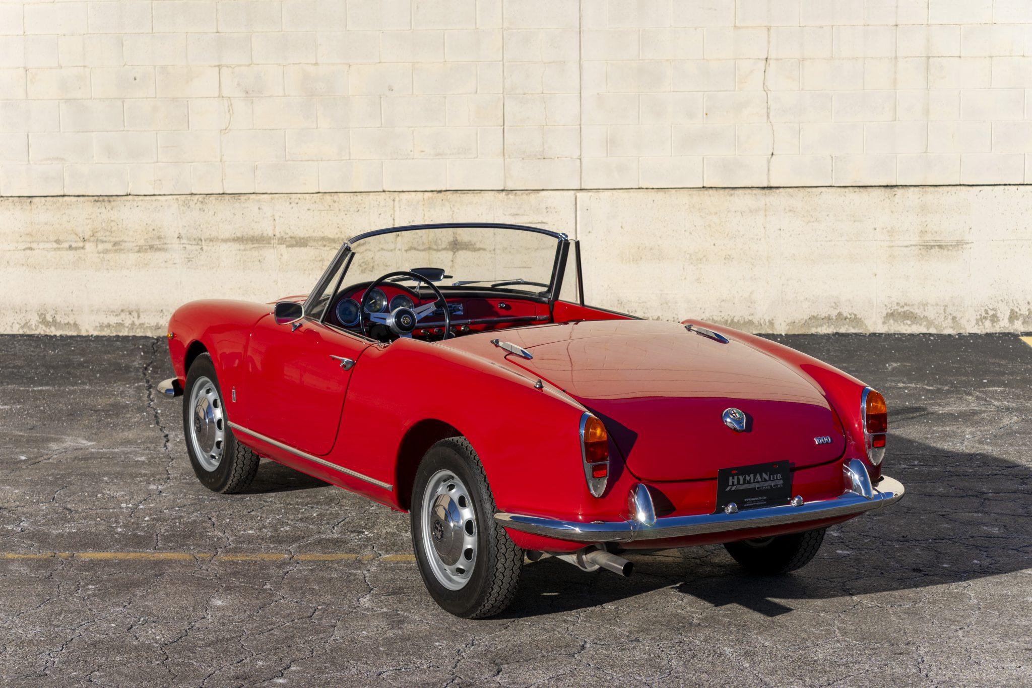 Silver-finished 15″ Fergat steel wheels wear bright hubcaps and are mounted with 165-width Vredestein Sprint Classic tires. A full-size spare wheel is stowed under an Alfa Romeo-branded cover behind the seats. Braking is handled by finned drums at all four corners.