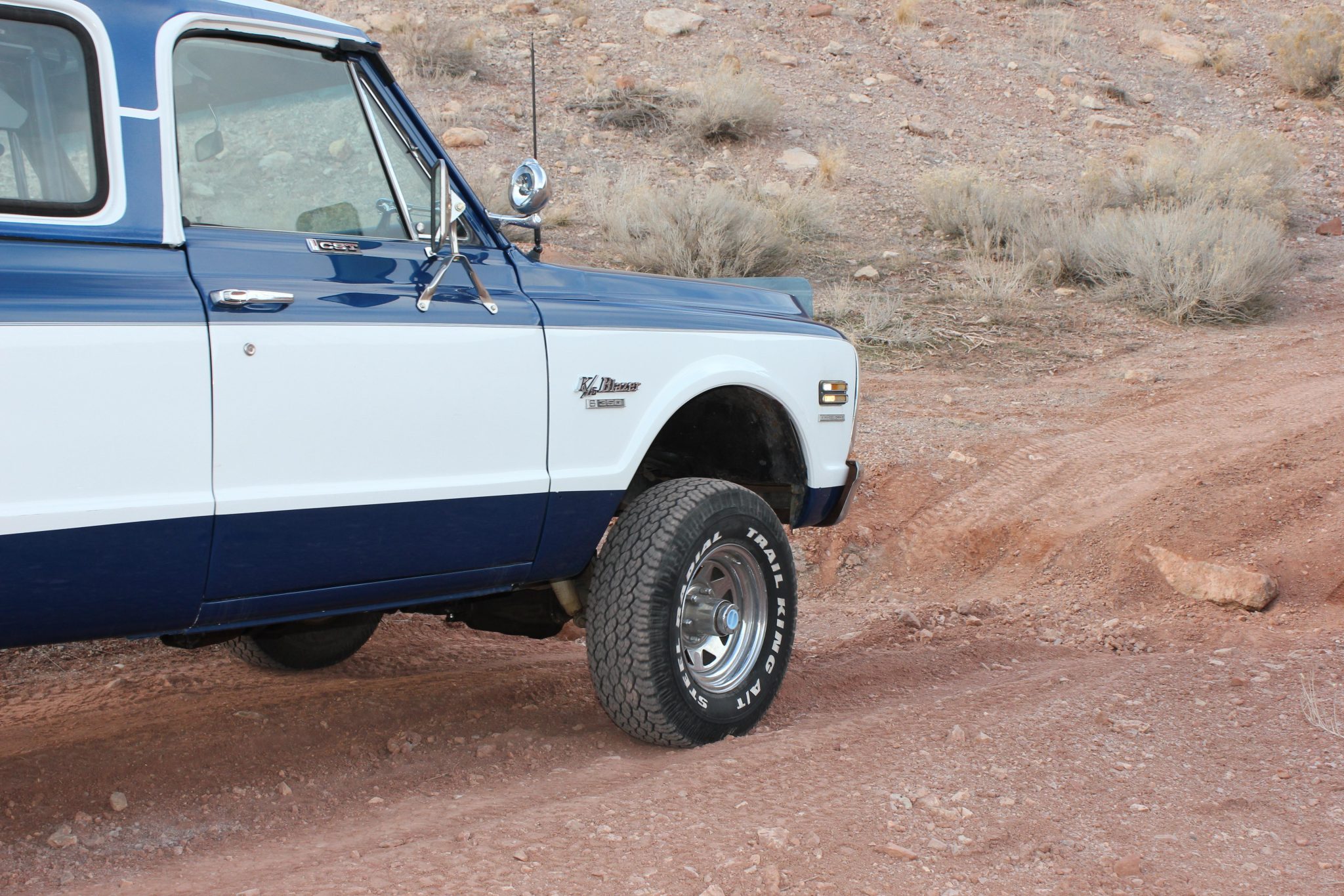 The 15″ chrome wheels are mounted with 31×10.5″ Trail King A/T Steel Radial tires. The truck is equipped with manually locking front hubs, power steering, and front disc brakes.