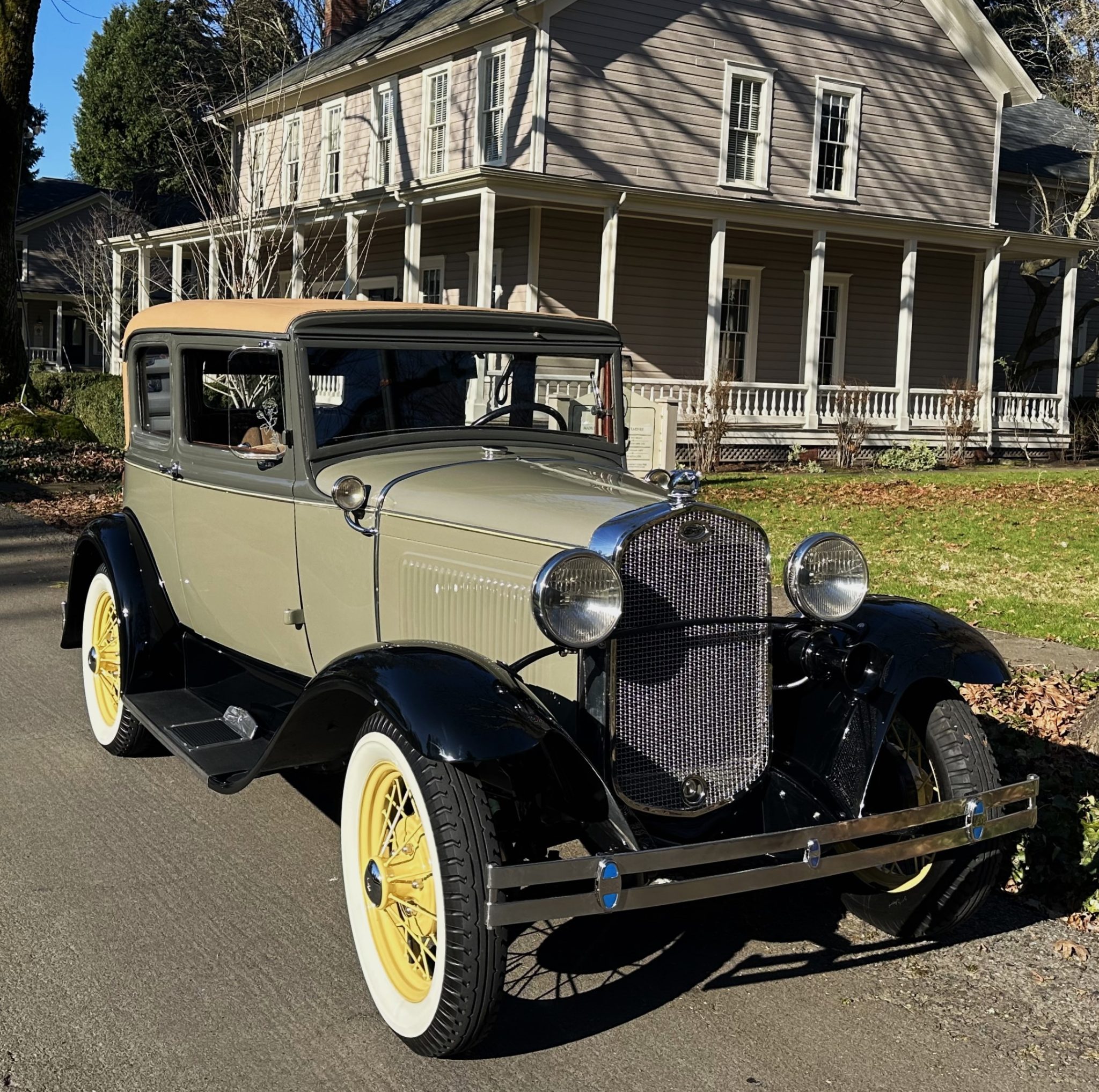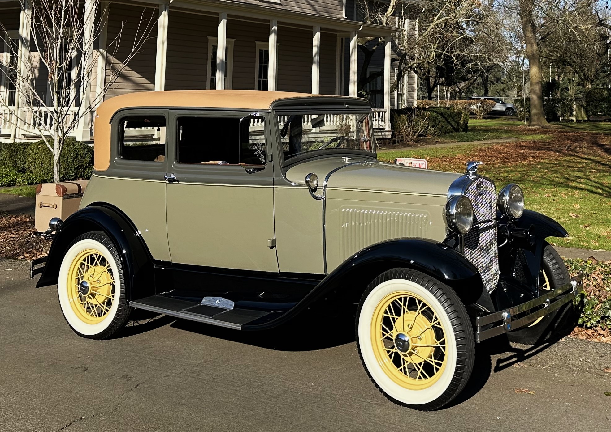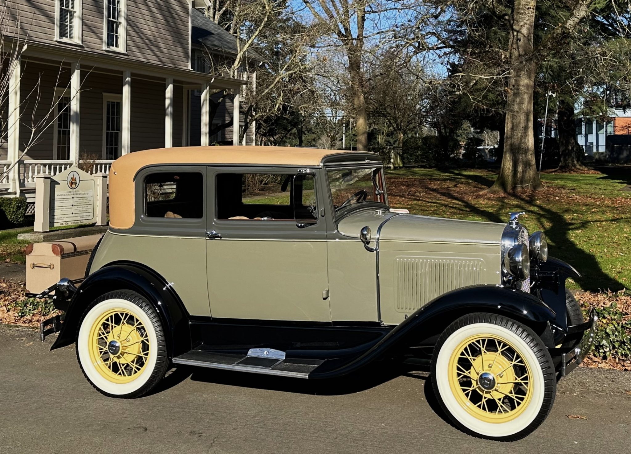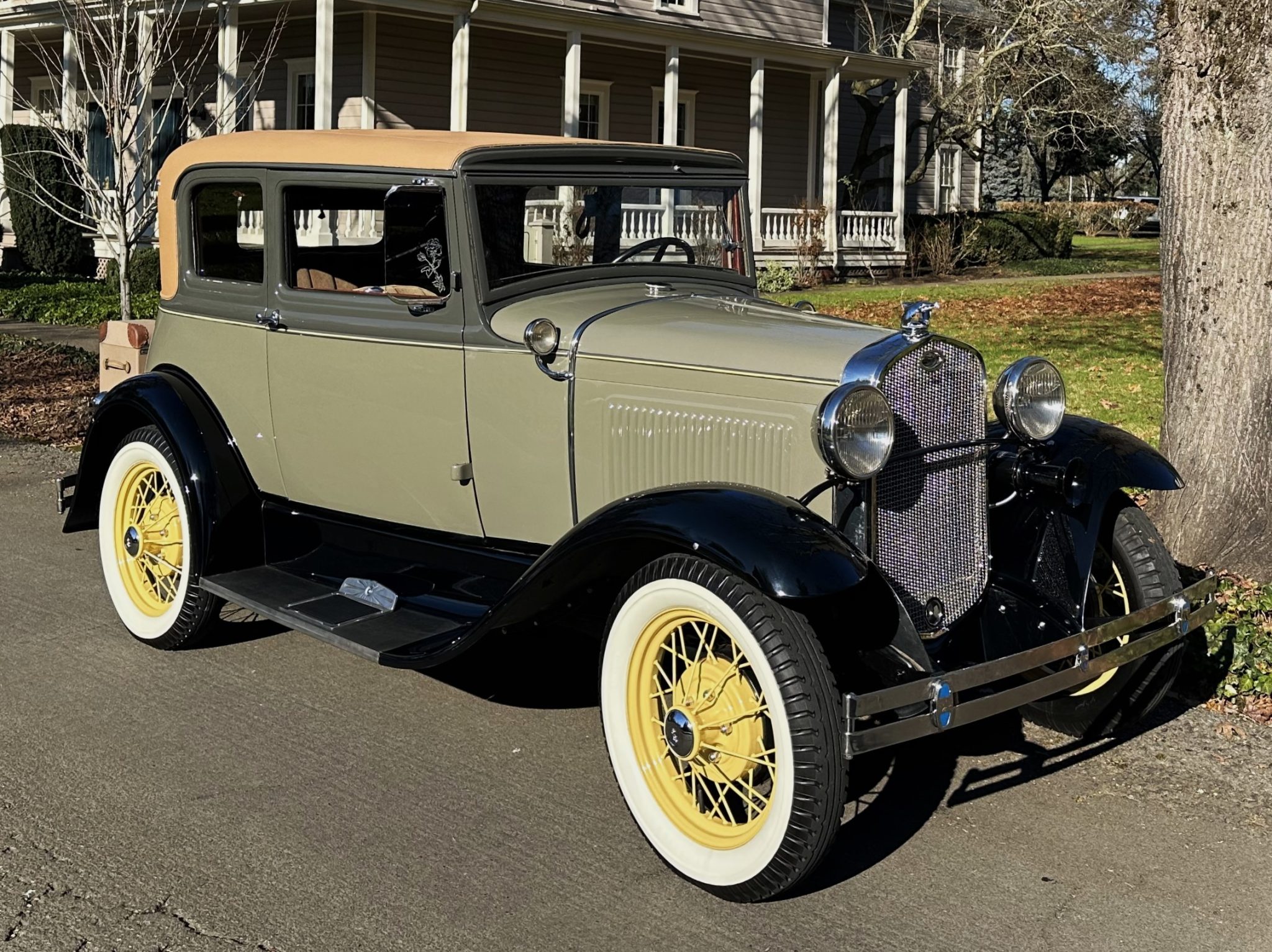 Yellow-painted 19″ wire wheels are mounted with 4.75/5.00-19 Firestone Gum Dipped whitewall tires. A spare is mounted at the rear. Braking is provided by four-wheel drums.