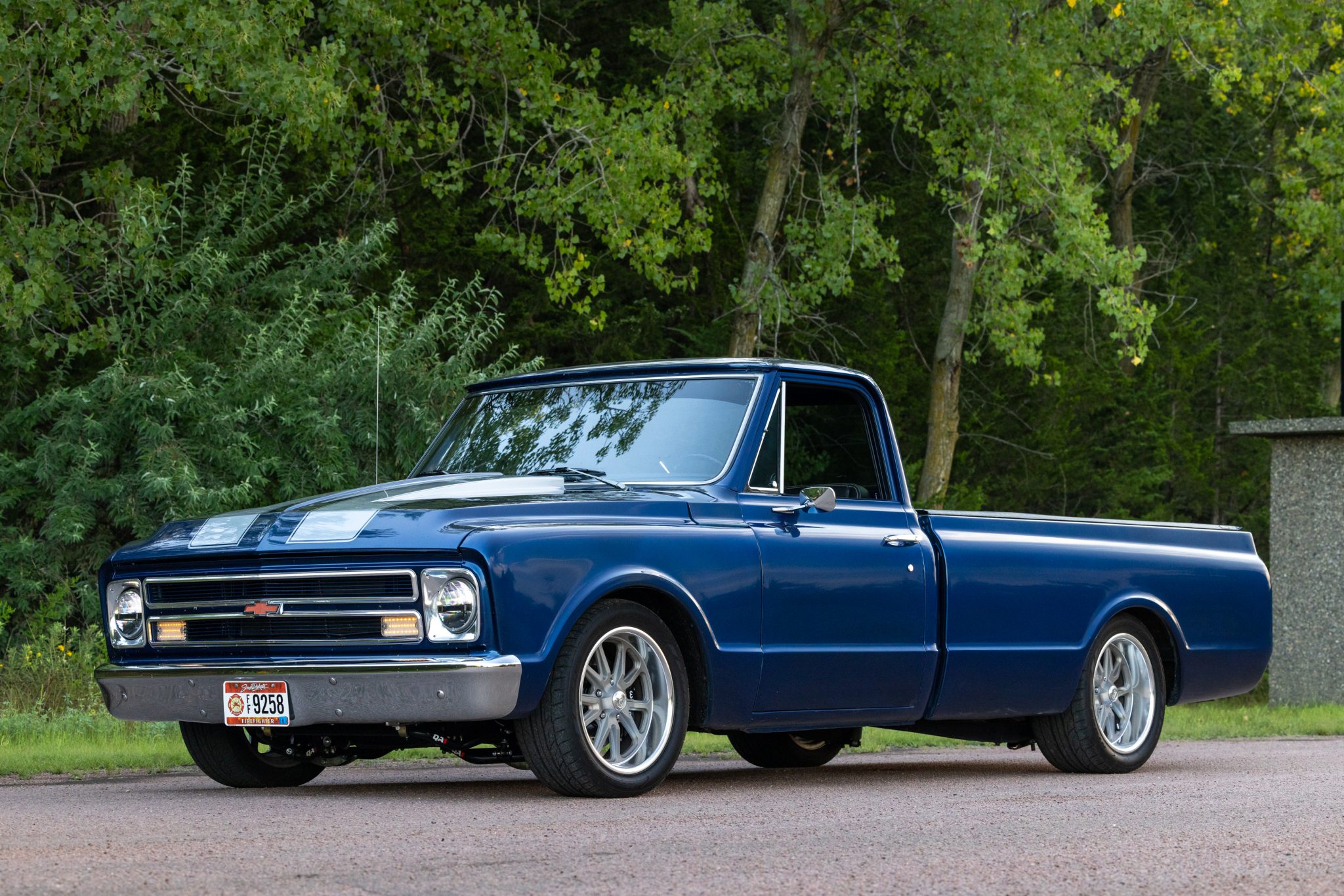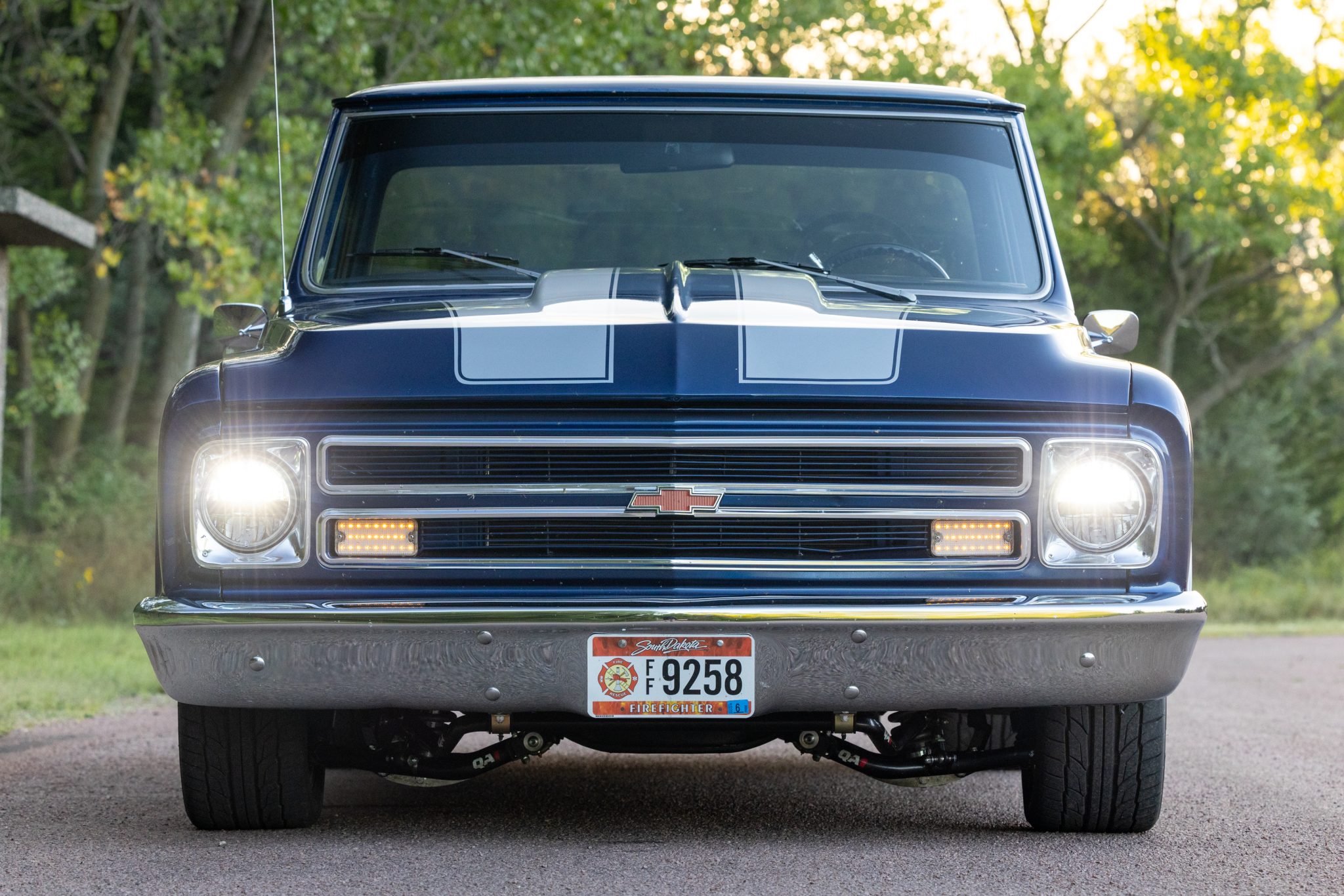 Suspension includes a QA1 front coilover setup, replacement rear shocks with relocation brackets, and 4″ drop springs. The truck rides on US Mags 18″ split-spoke wheels mounted with Nitto tires, and Wilwood disc brakes with slotted and drilled rotors are fitted up front.