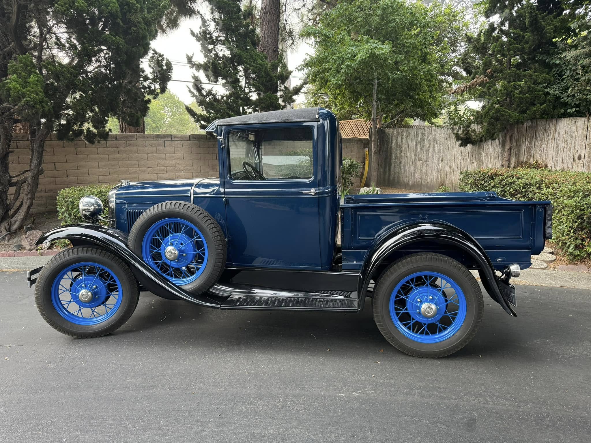 Lighter blue 19″ wire wheels are mounted with Firestone tires, as is a matching spare located in the left-front fender. Braking is provided by four-wheel drums.