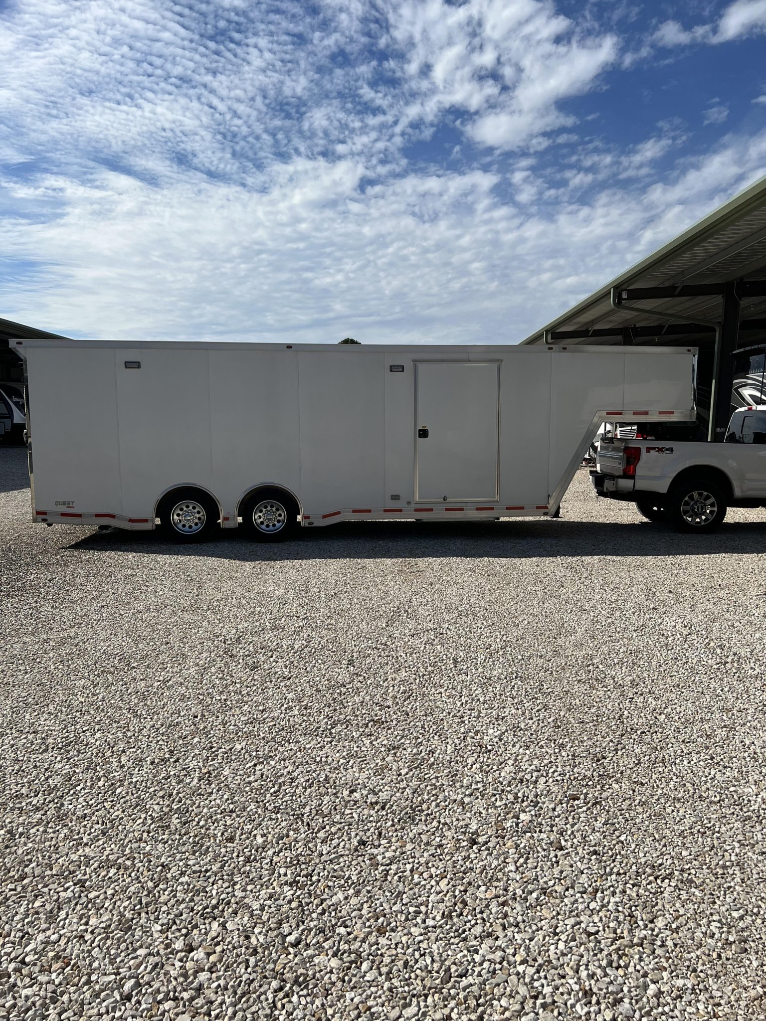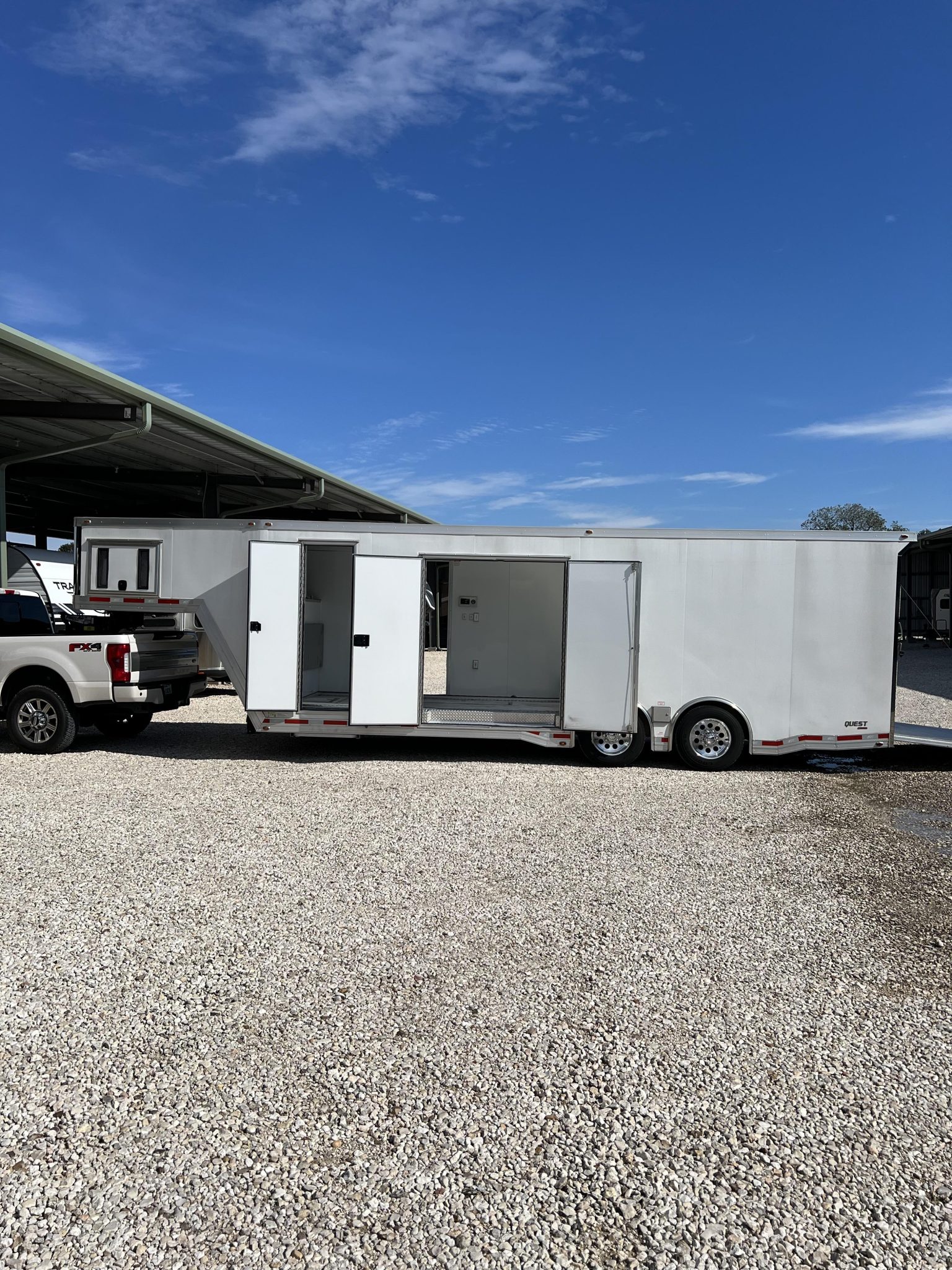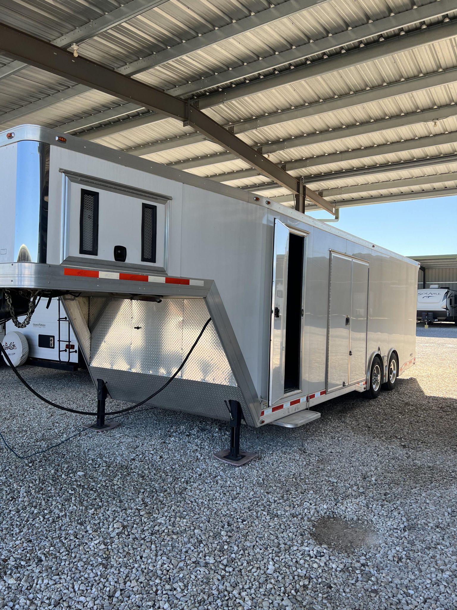 The tandem axle trailer rides on 17.5″ alloy wheels mounted with 215/75 Goodyear tires, and a spare is stowed in a floor compartment within the trailer. Stopping power is from electric drum brakes, and the chassis is fitted with power-operated jacks up front. Service in July 2024 involved repacking the wheel bearings, repairing the brake wiring, and replacing the breakaway system battery.