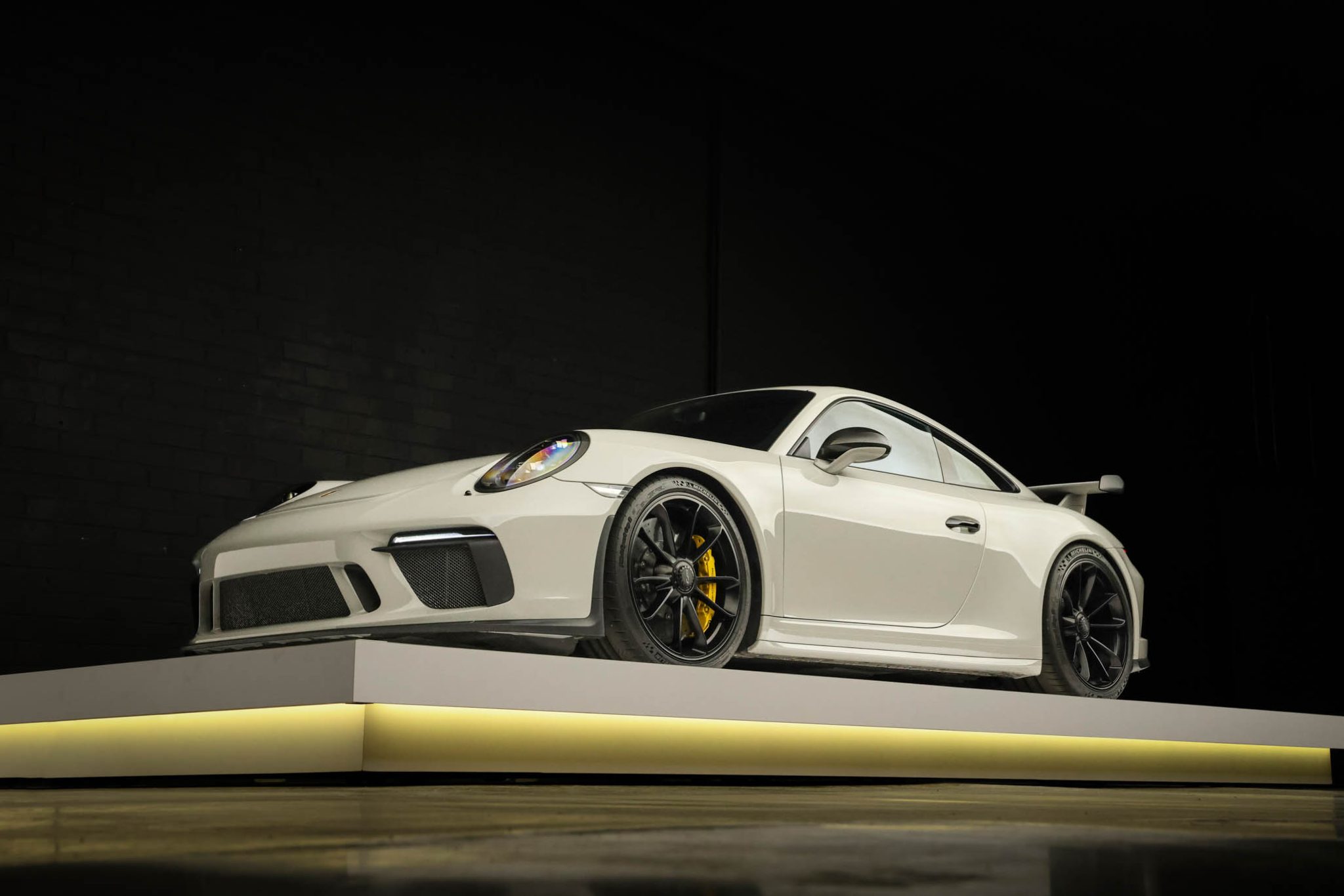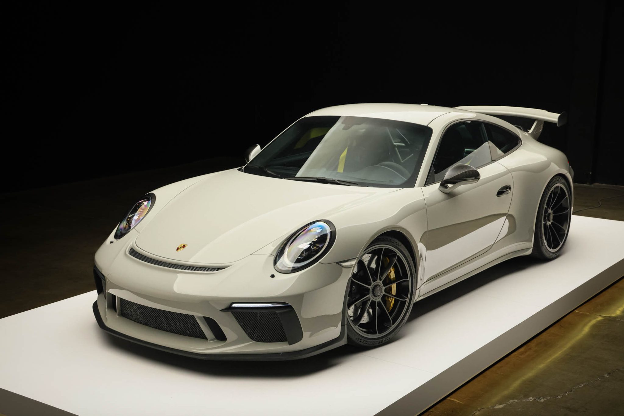 Satin black 20″ center-lock alloy wheels are mounted with Michelin Pilot Sport Cup 2 tires. Braking is handled by yellow Porsche-branded calipers over ceramic-composite rotors. The car is equipped with a front-axle lift system.