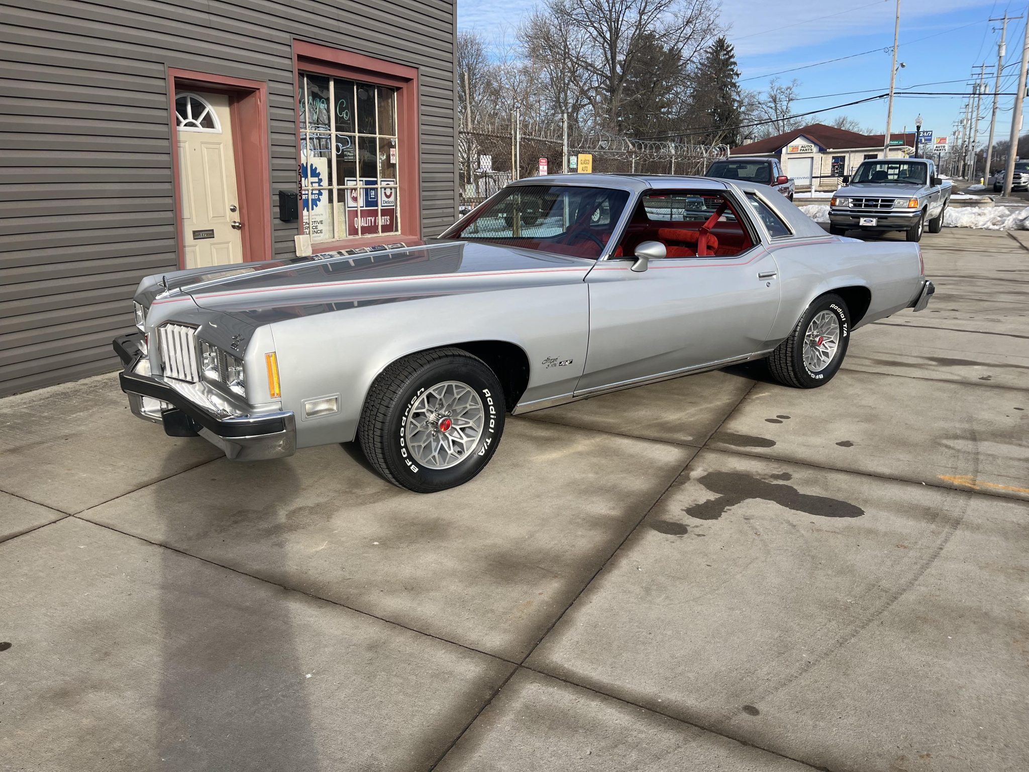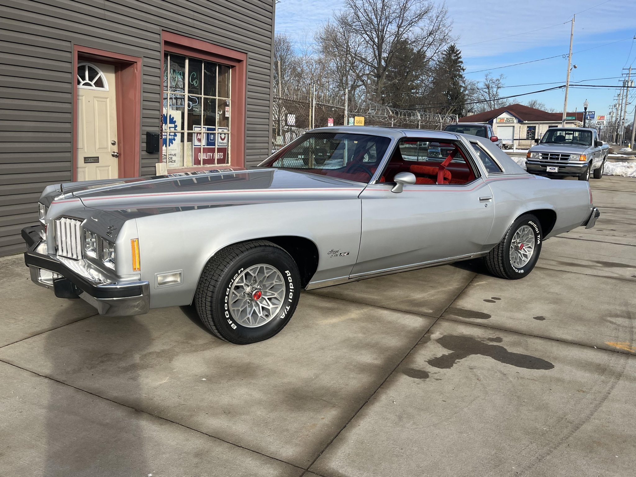 Snowflake-style 15″ wheels are wrapped in 255/60 BFGoodrich Radial T/A white-letter tires produced in 2024. The car is equipped with the Rally Radial Tuned Suspension package, and braking is handled by power-assisted front discs and rear drums.
