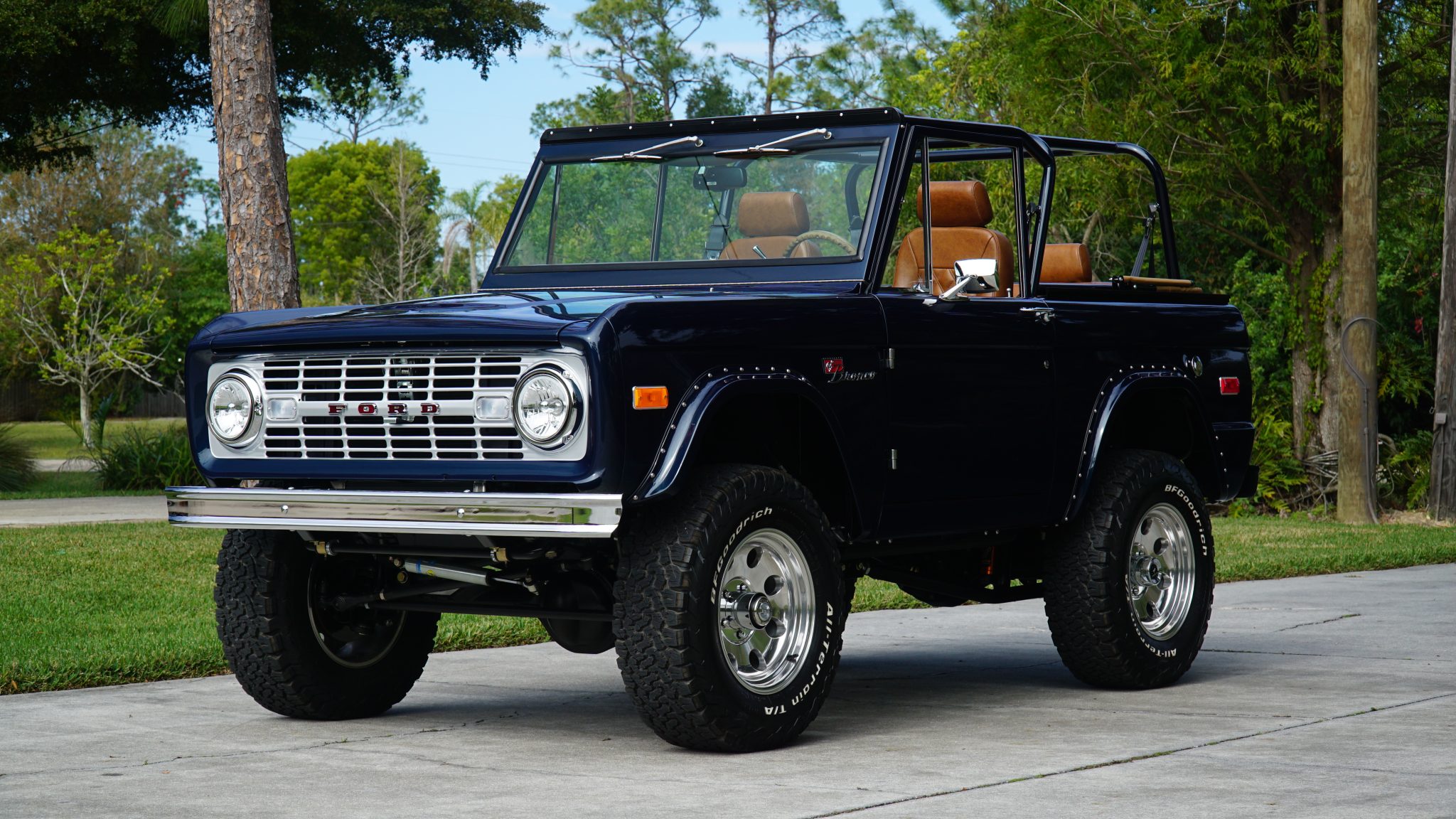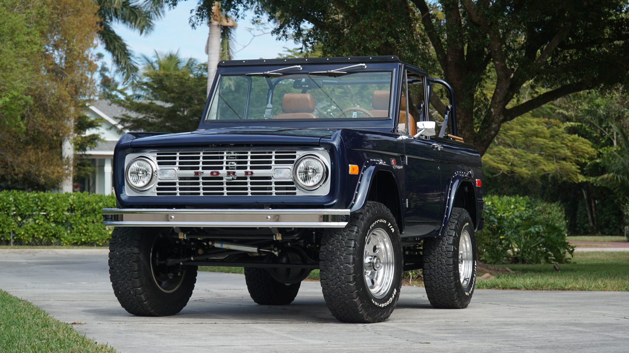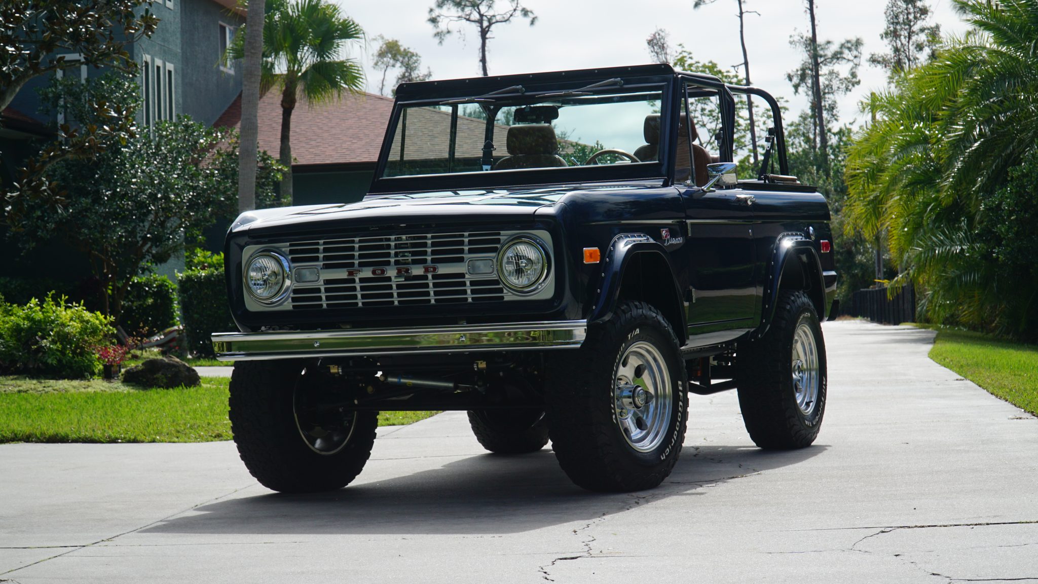 Polished 17″ eight-hole alloy wheels are mounted with 285/70 BFGoodrich All-Terrain T/A KO2 white-letter tires. The front axle is equipped with Mile Marker manually locking hubs, and Borgeson power steering components are installed in addition to a Bilstein steering stabilizer. The truck rides on a lifted suspension with coil springs, TracTive remote-reservoir shocks, and four-link geometry front and rear. Stopping power is provided by a hydroboosted Wilwood master cylinder and four-wheel disc brakes.