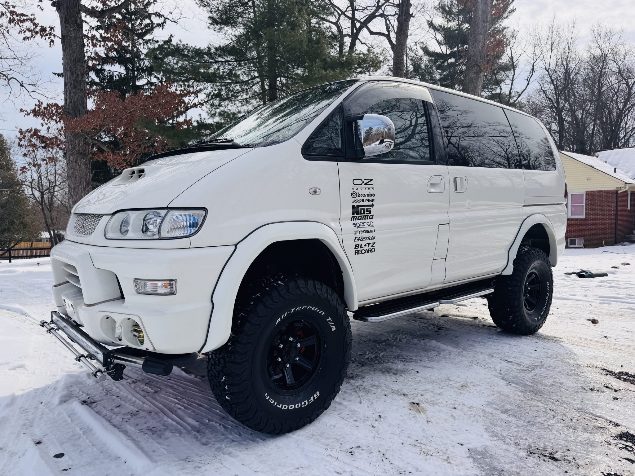 15″ alloy wheels are finished in black and wear 33×12.5″ BFGoodrich KO2 All-Terrain T/A tires. The vehicle was lifted by 1″ using Rancho Gas shock absorbers at each corner, and the brake calipers were painted red.