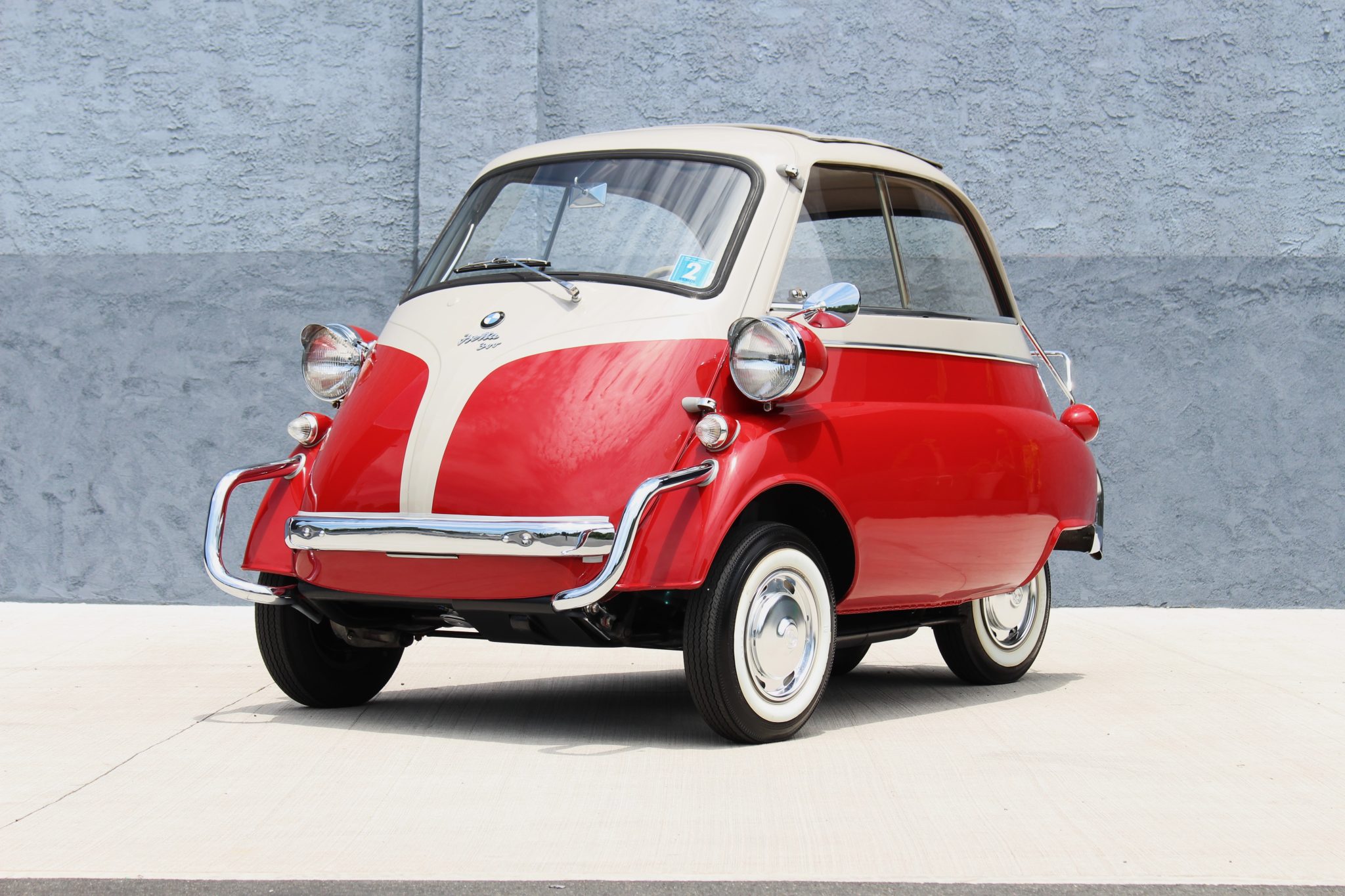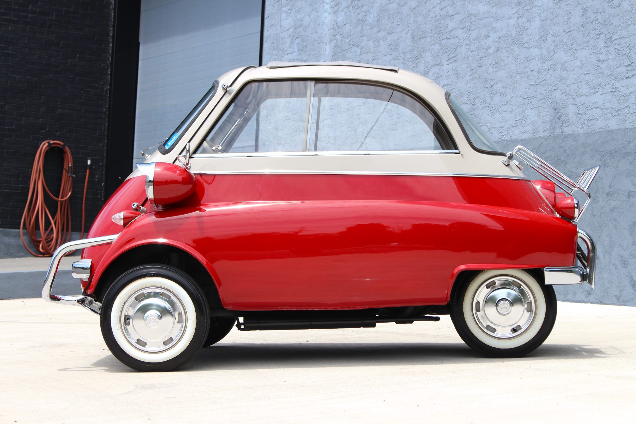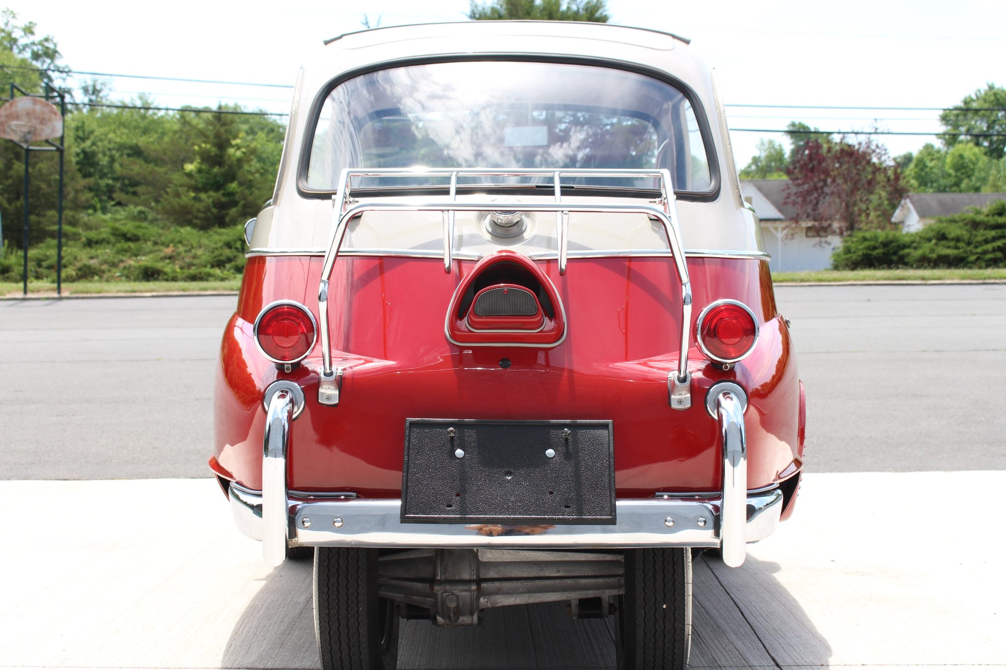 The 10″ steel wheels are fitted with bright hubcaps and wrapped in BFGoodrich Silvertown tires wearing Atlas whitewall inserts. The Isetta features a coil-spring suspension up front and leaf springs out back. Stopping power is provided by hydraulically actuated drum brakes, which are said to have been rebuilt and fitted with replacement hoses in 2024.