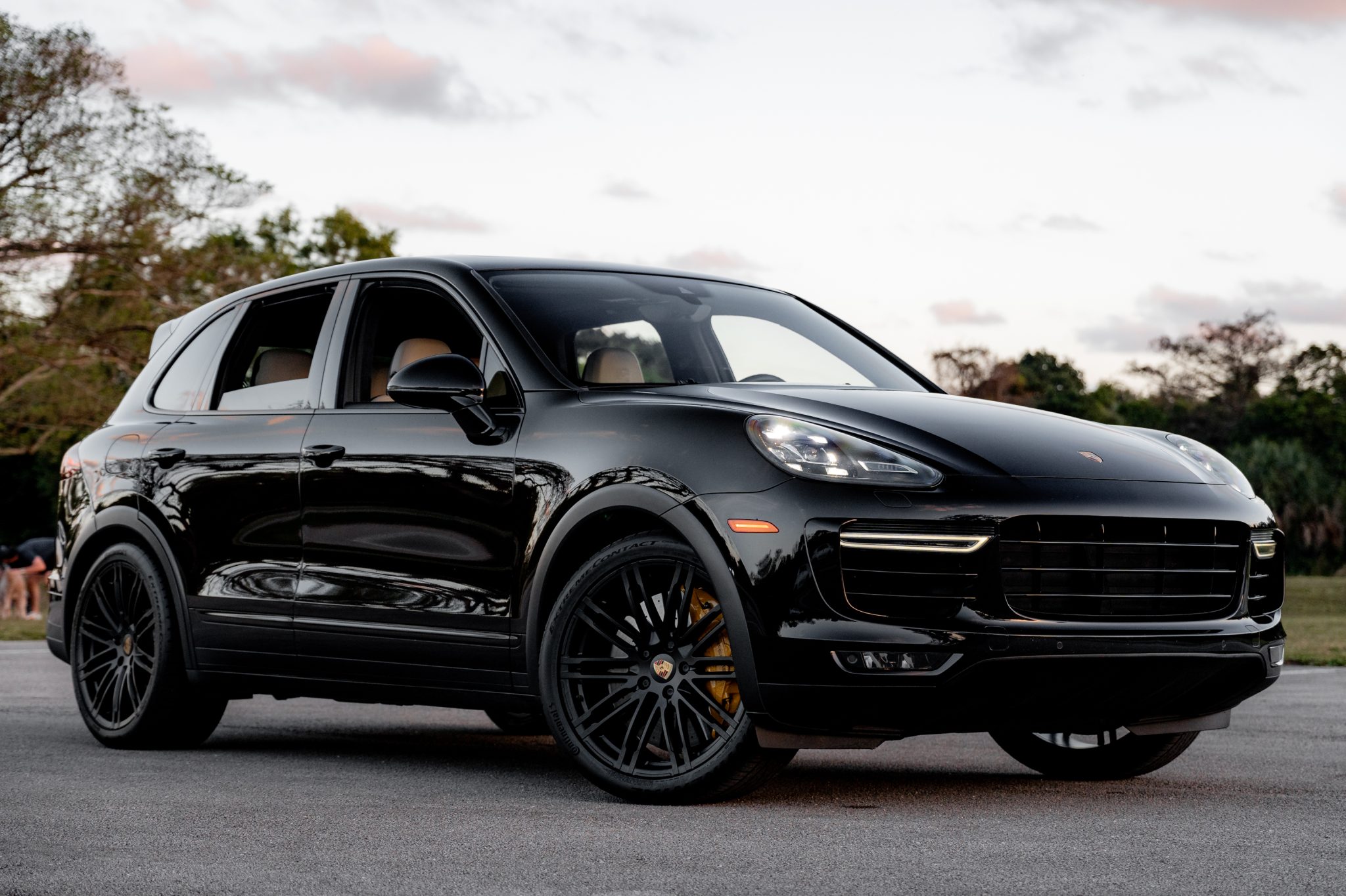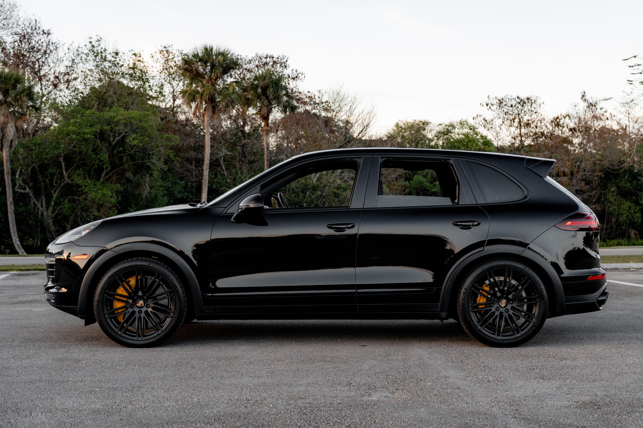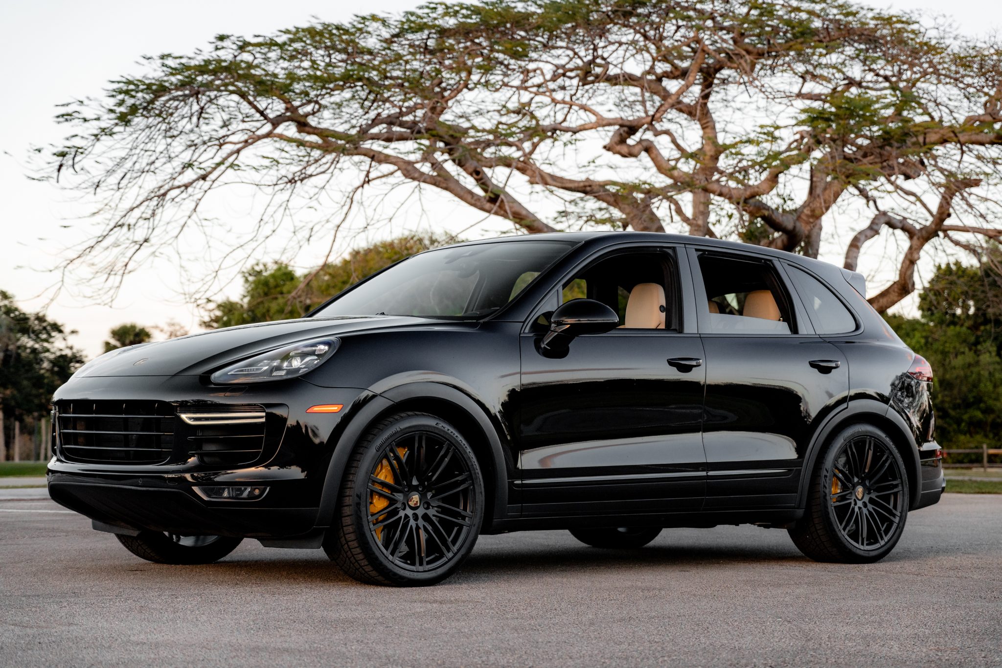 Black 21″ 911 Turbo Design alloy wheels are mounted with Continental tires. The vehicle is equipped with an adjustable air suspension, Porsche Active Suspension Management (PASM), and Power Steering Plus. Stopping power is provided by yellow-finished 10-piston front and four-piston rear brake calipers over cross-drilled and ventilated ceramic-composite rotors at each corner.