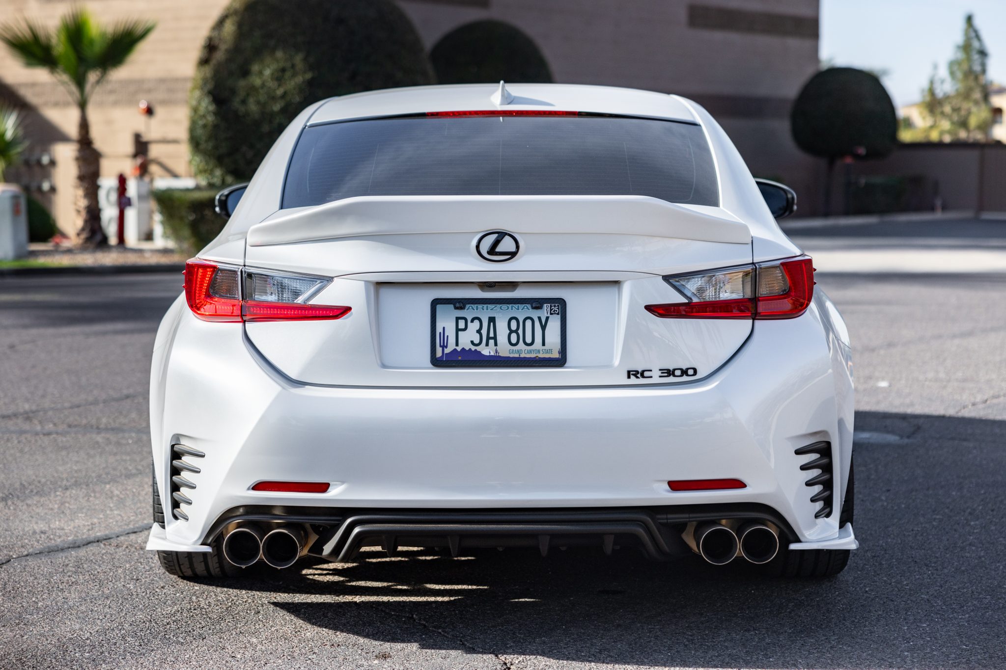 The car is finished in Eminent White Pearl and has been modified with an NIA rear spoiler and lower bodywork along with an RC350-style grille and a rear diffuser. Additional details include a rearview camera, quad exhaust outlets, LED headlights, tinted windows, and a sunroof.