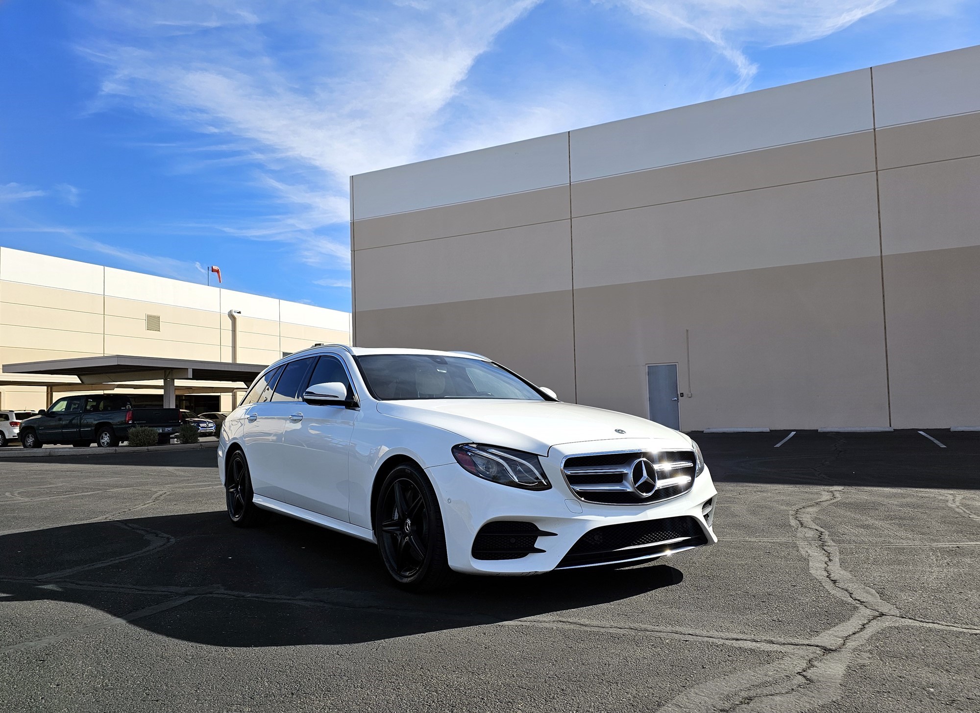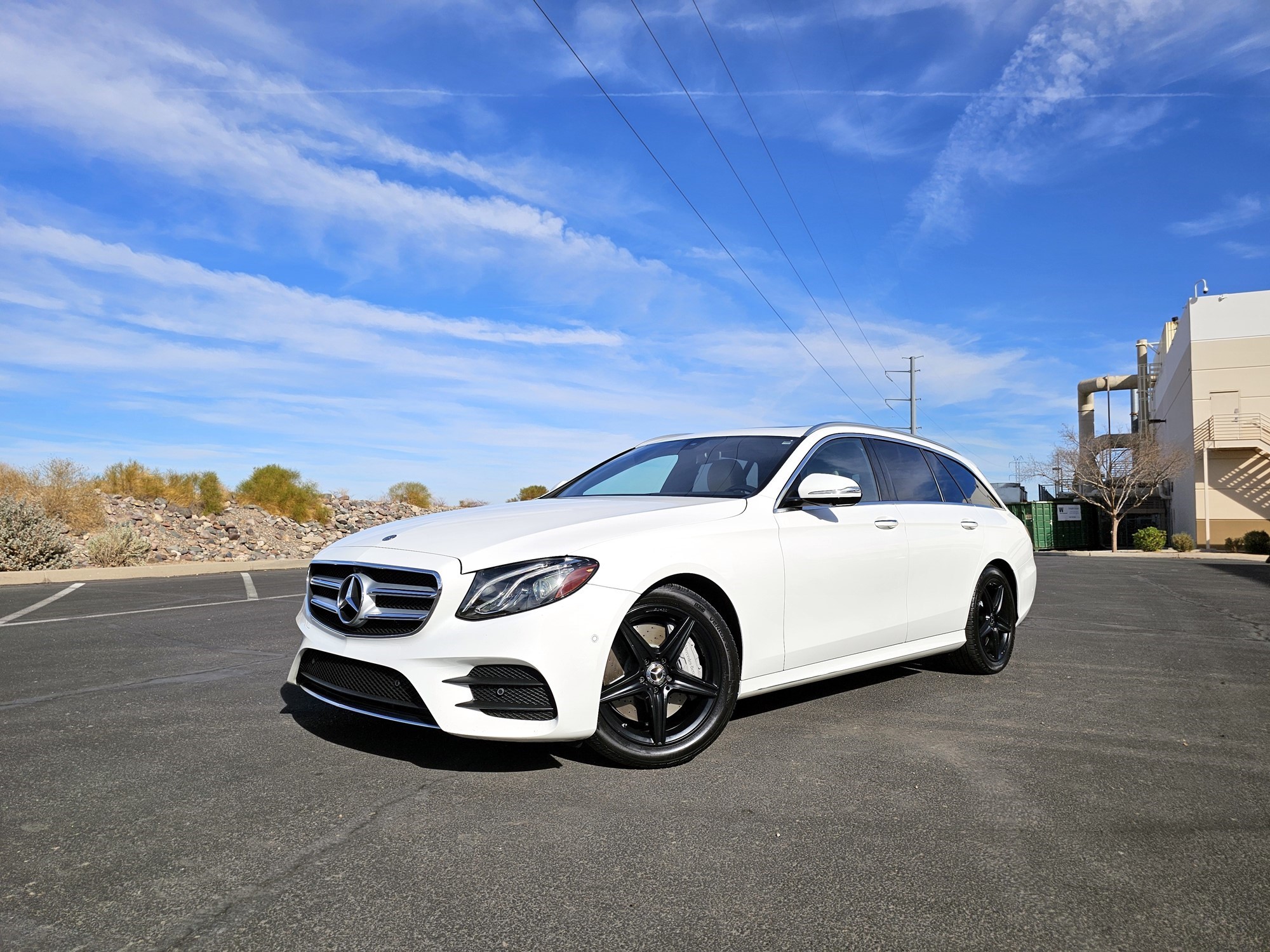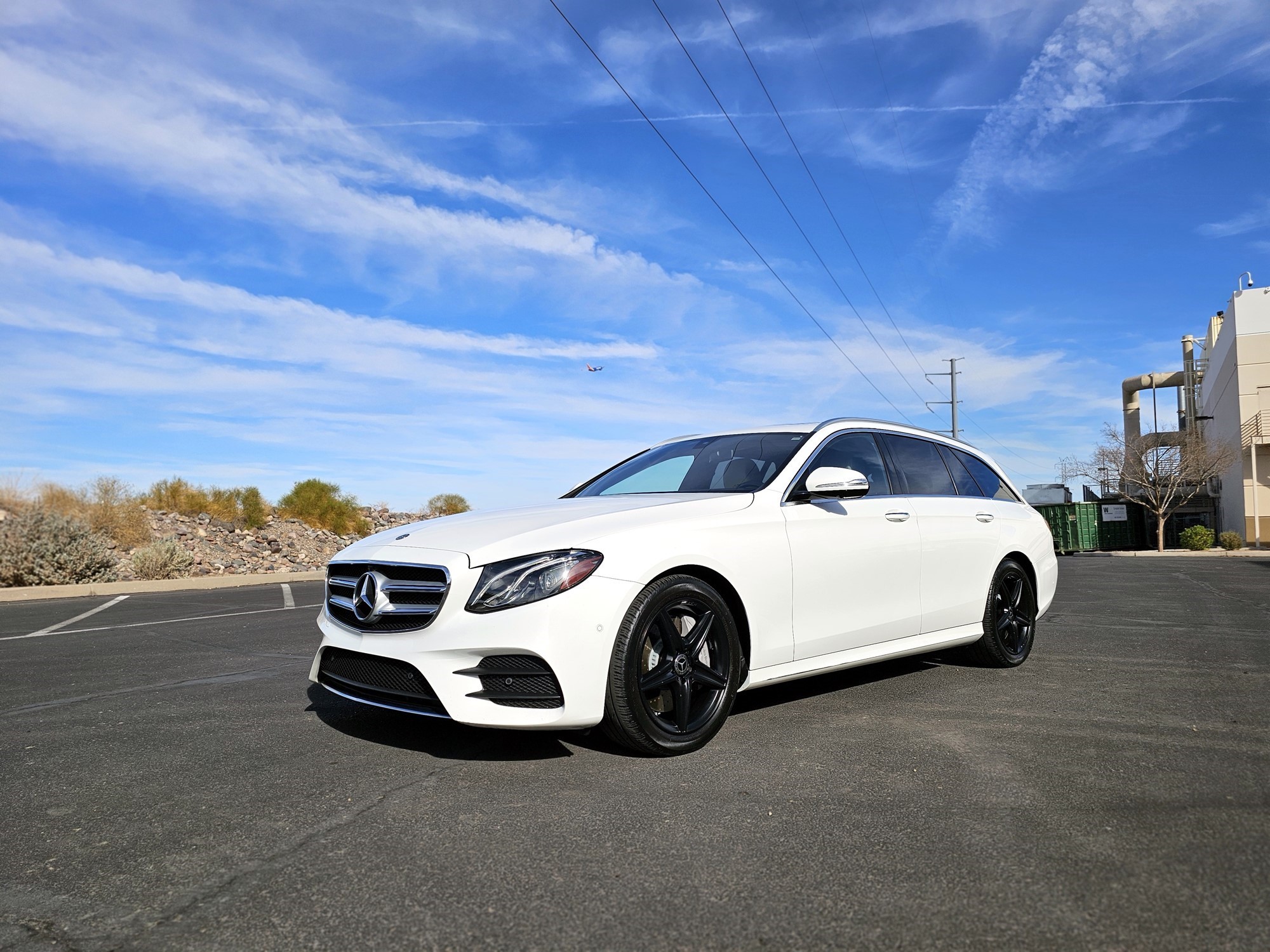 Black-finished 18ⳠAMG five-spoke wheels are mounted with Hankook Ventus S1 Noble2 tires. The car features a self-leveling air suspension system at the rear, and braking is provided by four-wheel discs with Mercedes-branded calipers over cross-drilled rotors up front.