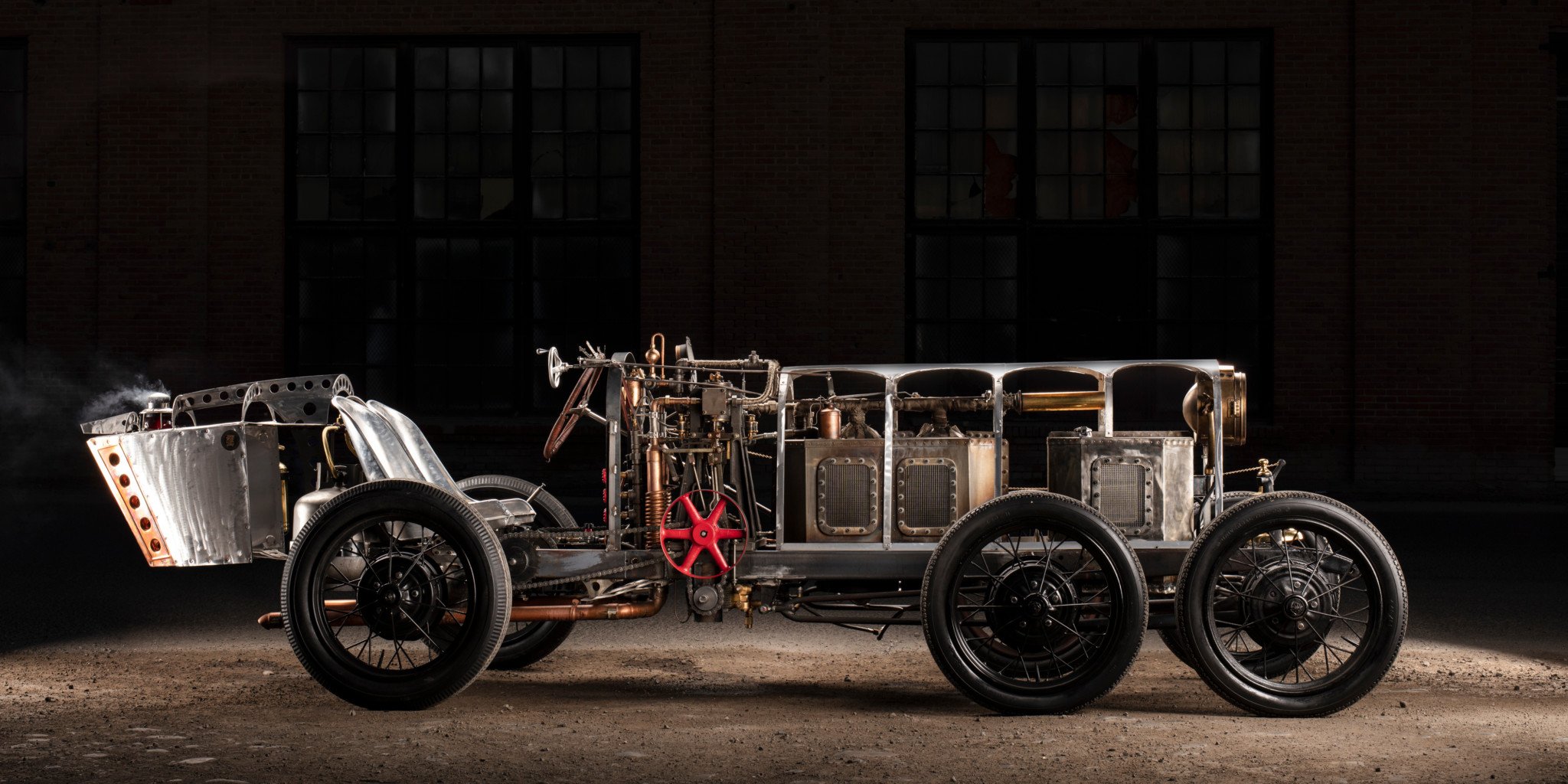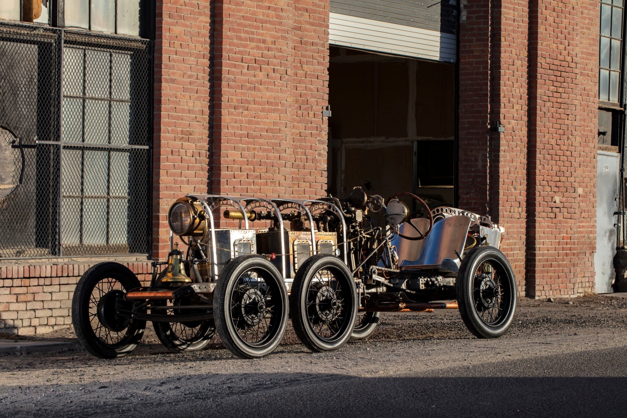 The car features a single, propane-powered Twilite headlight, as well as a steam whistle and a brass bell up front that is controlled by the driver via a brass chain. Corrosion is noted on the frame, and braking is from a single Model A drum on the driver-side rear wheel that is actuated by a hand lever.