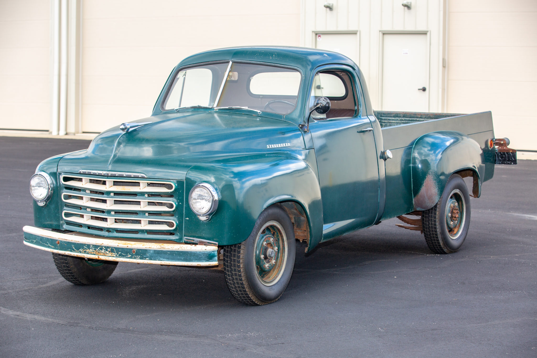 The 16″ six-lug wheels are finished in green and wear Excelsior 7.00-16 tires. An unmounted spare wheel is included in the sale and shown in the gallery. The seller had the four-wheel drum brakes serviced.